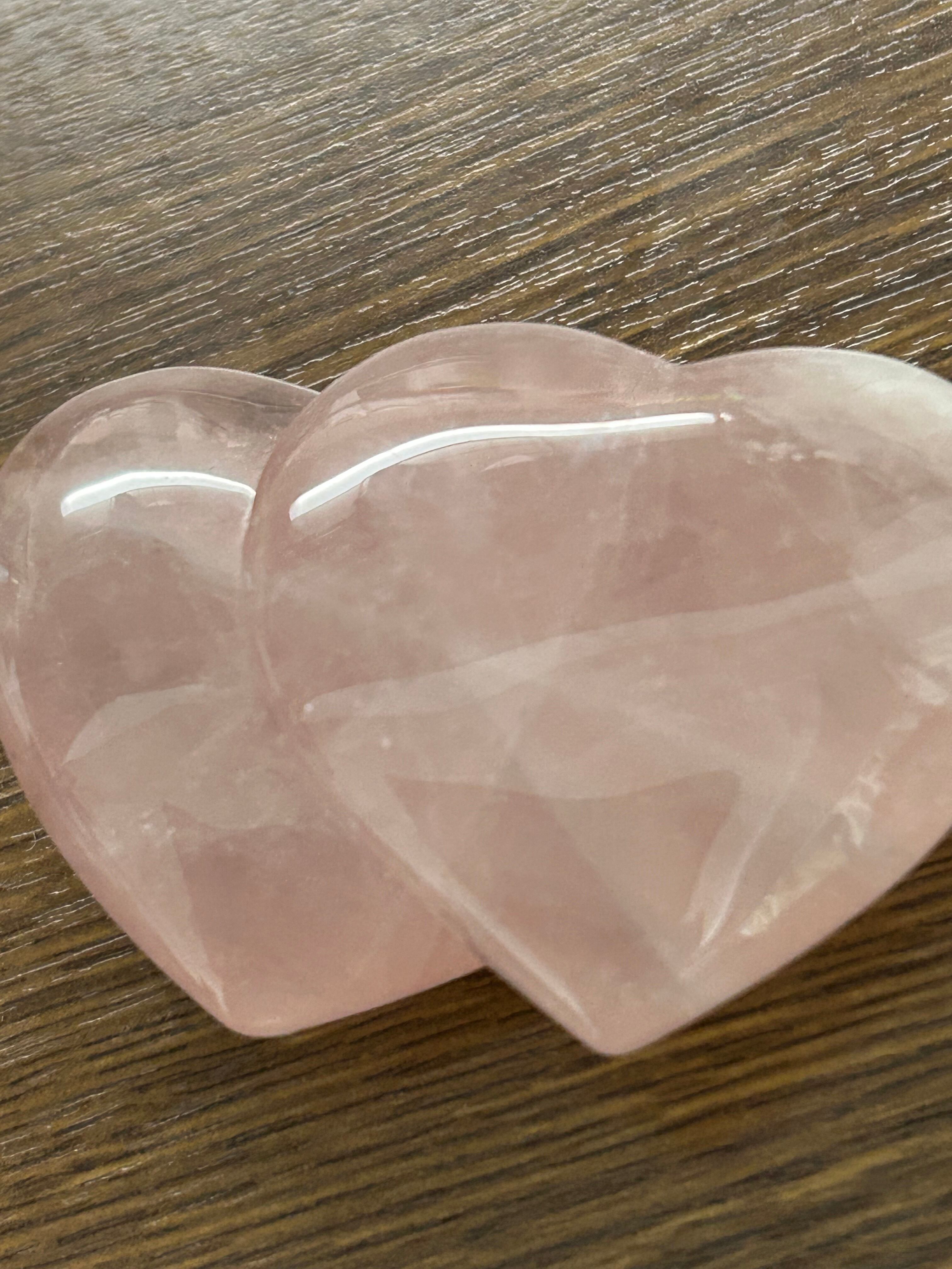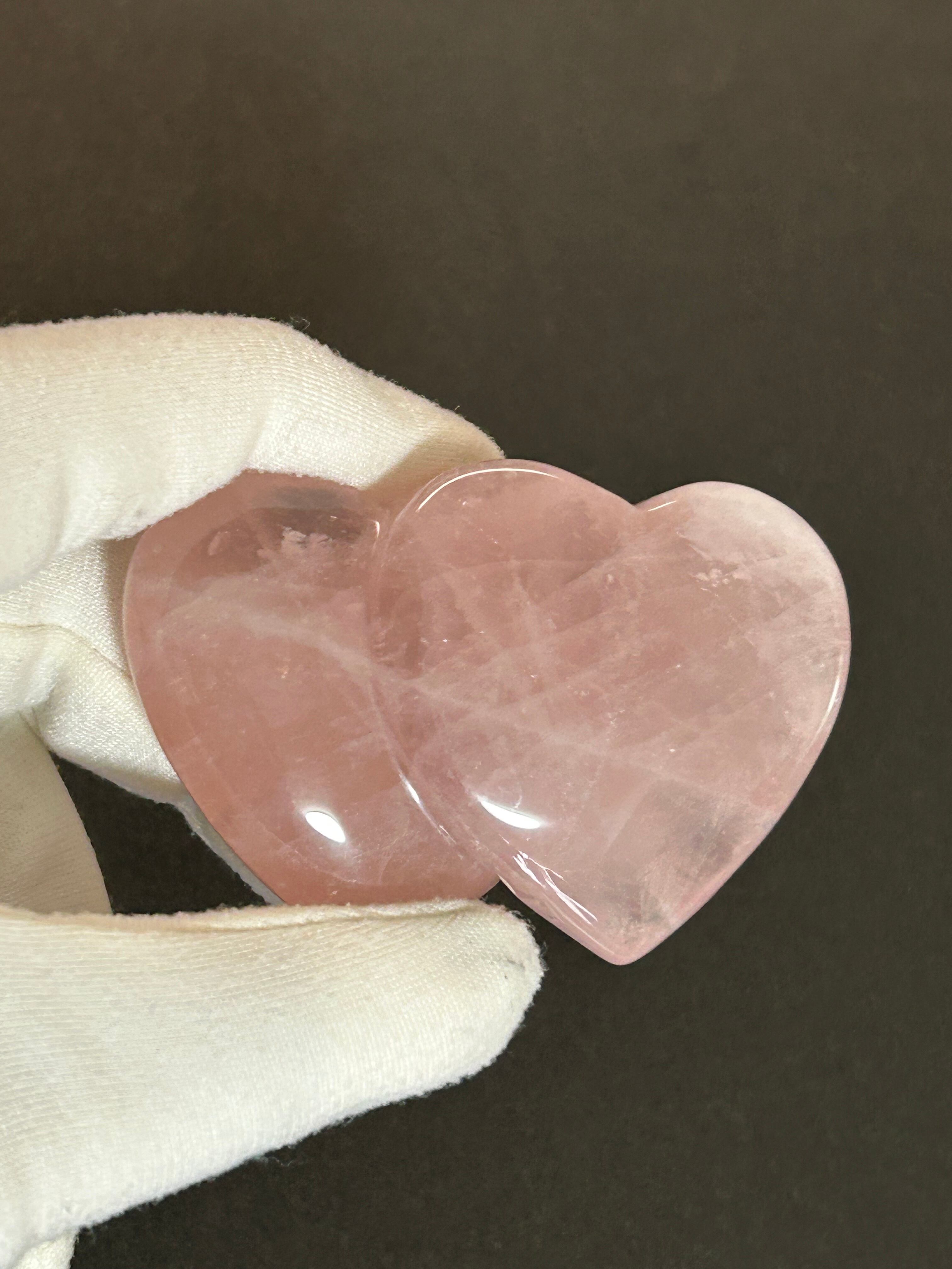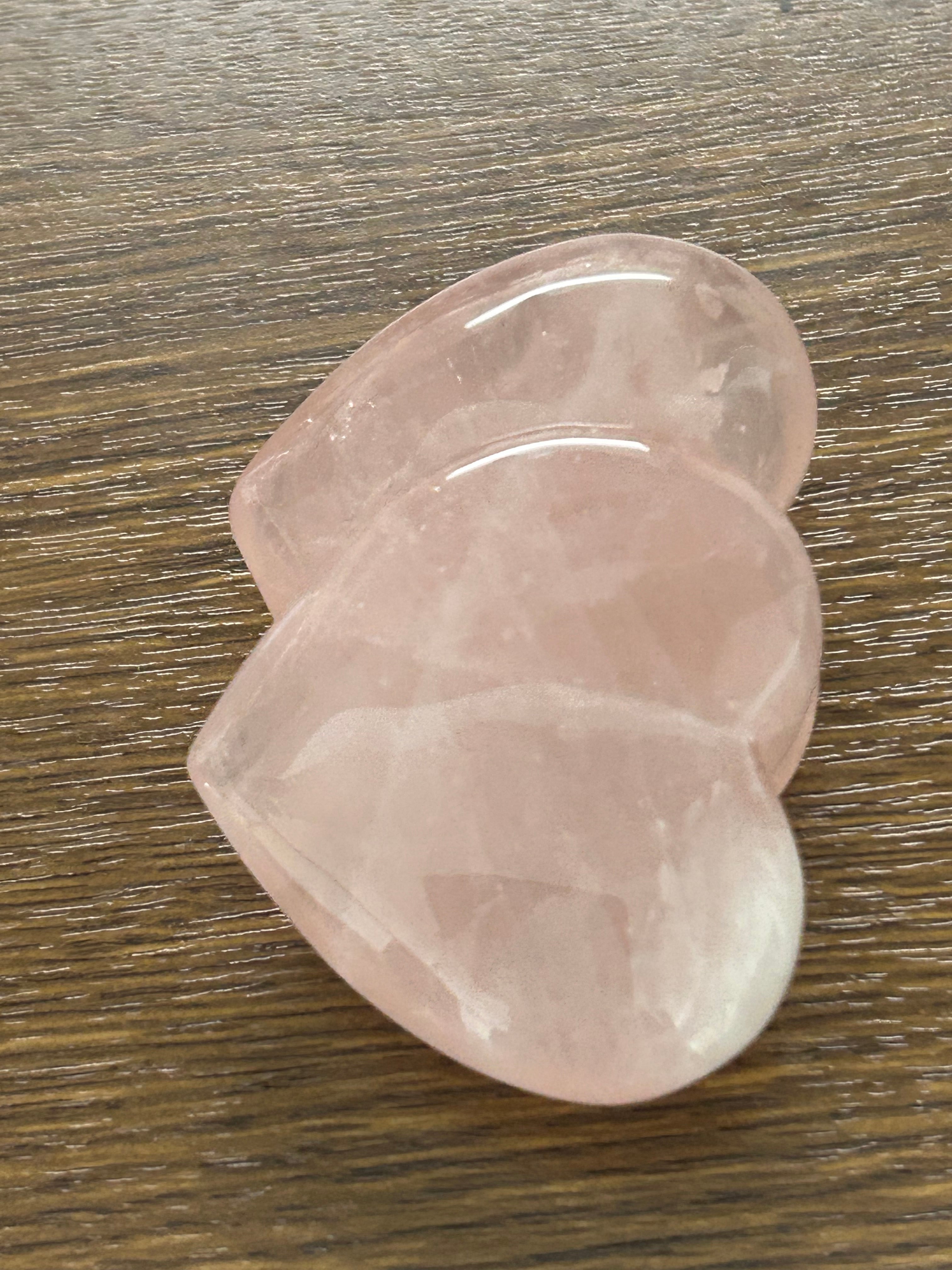 とっても可愛いローズクォーツのダブルハート型です。大きさも十分で手のひらサイズ。愛らしいピンクで小さな虹が入る箇所もあり見ているだけで癒されます。