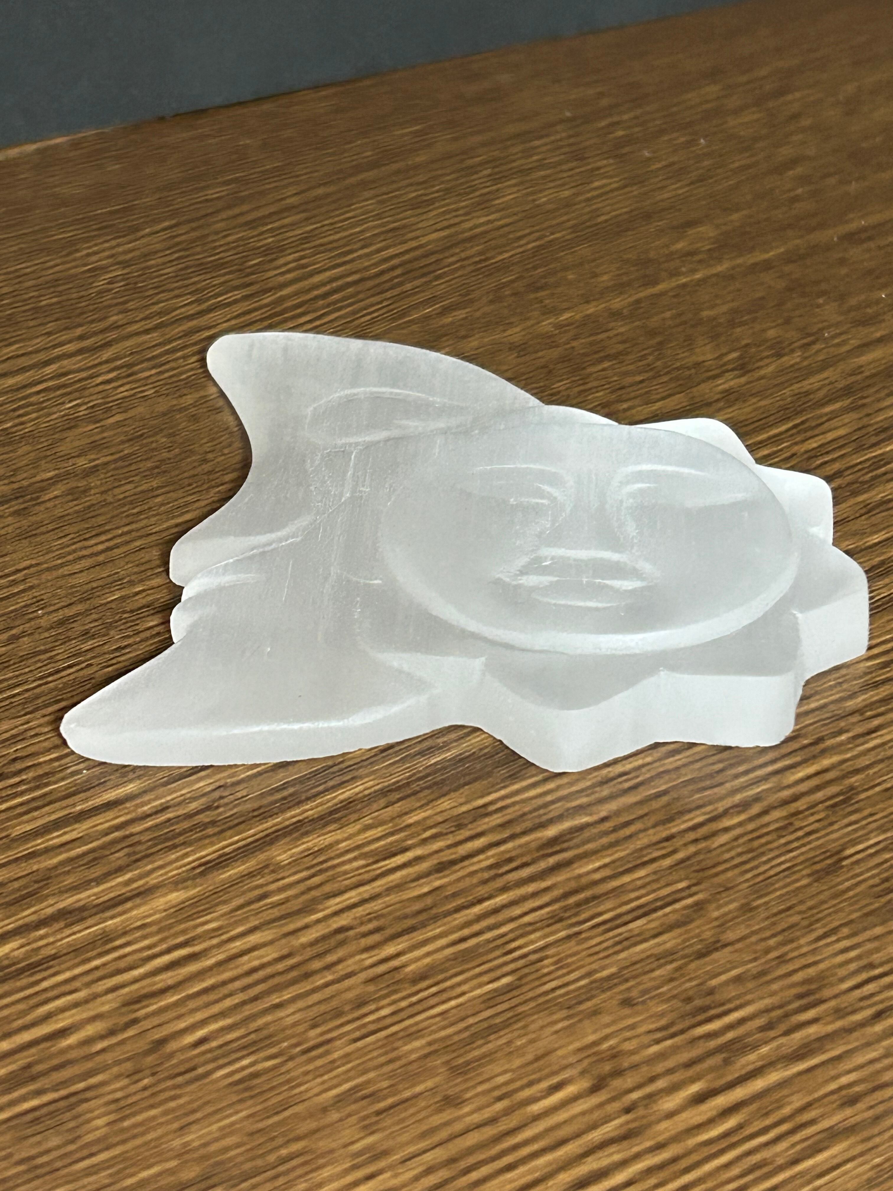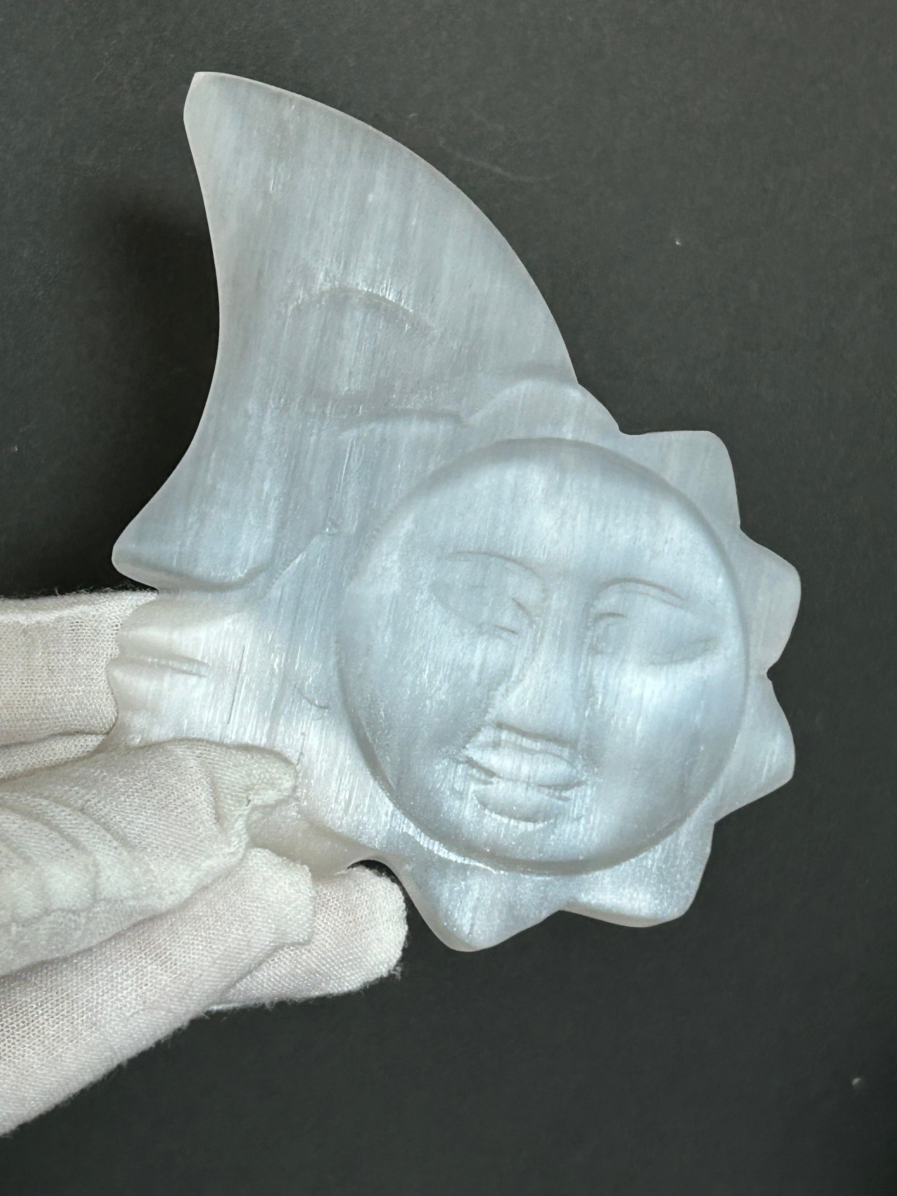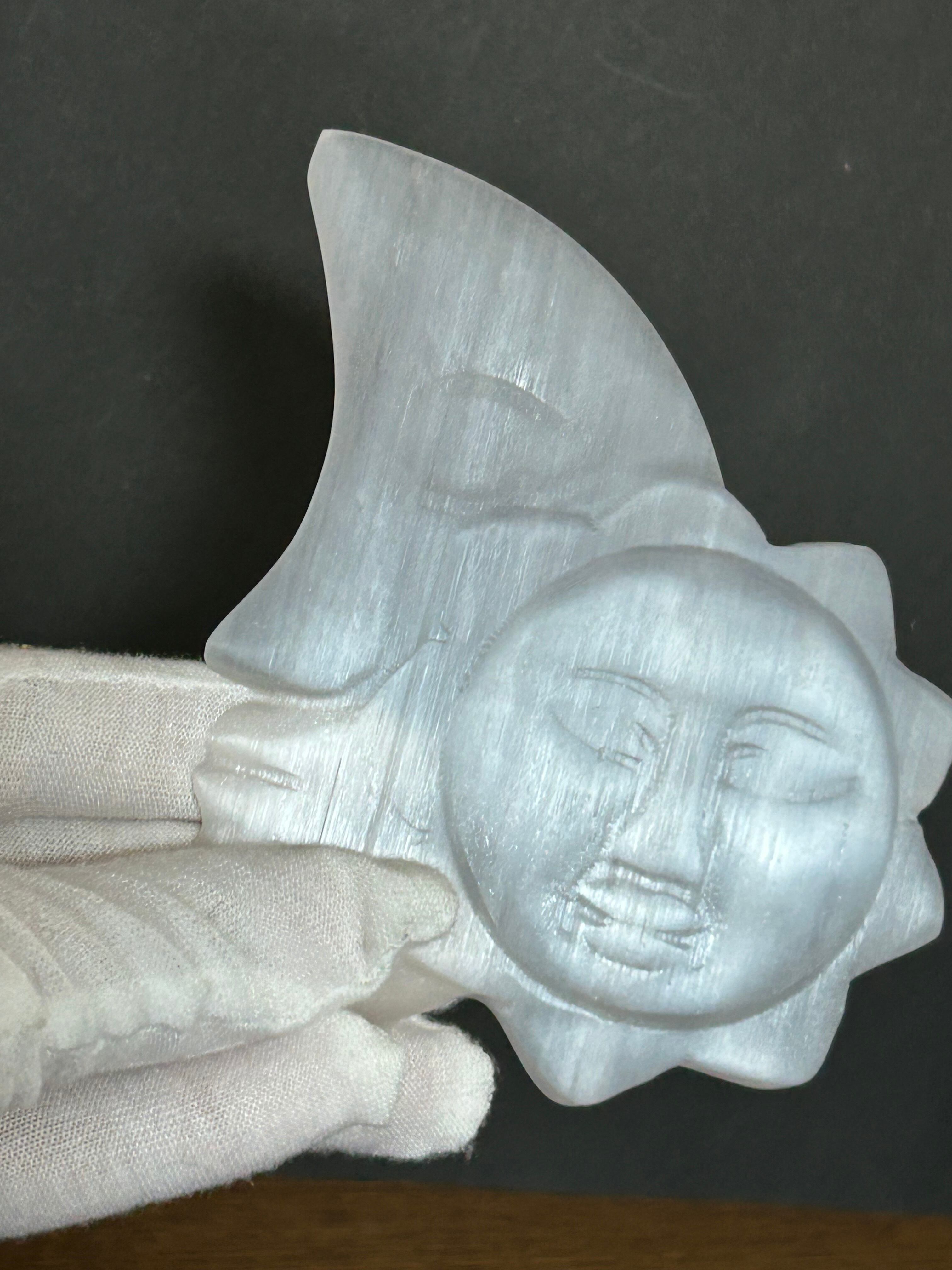 セレナイトの月と太陽彫刻の置物です。加工は少し甘いかな、と思うところはありますが、セレナイトは非常にやわらかい石なのでご自分で模様を付け足したり削ったりするのも容易なのです。私ならここに小さな模様を・・・と想像力を掻き立てられます。