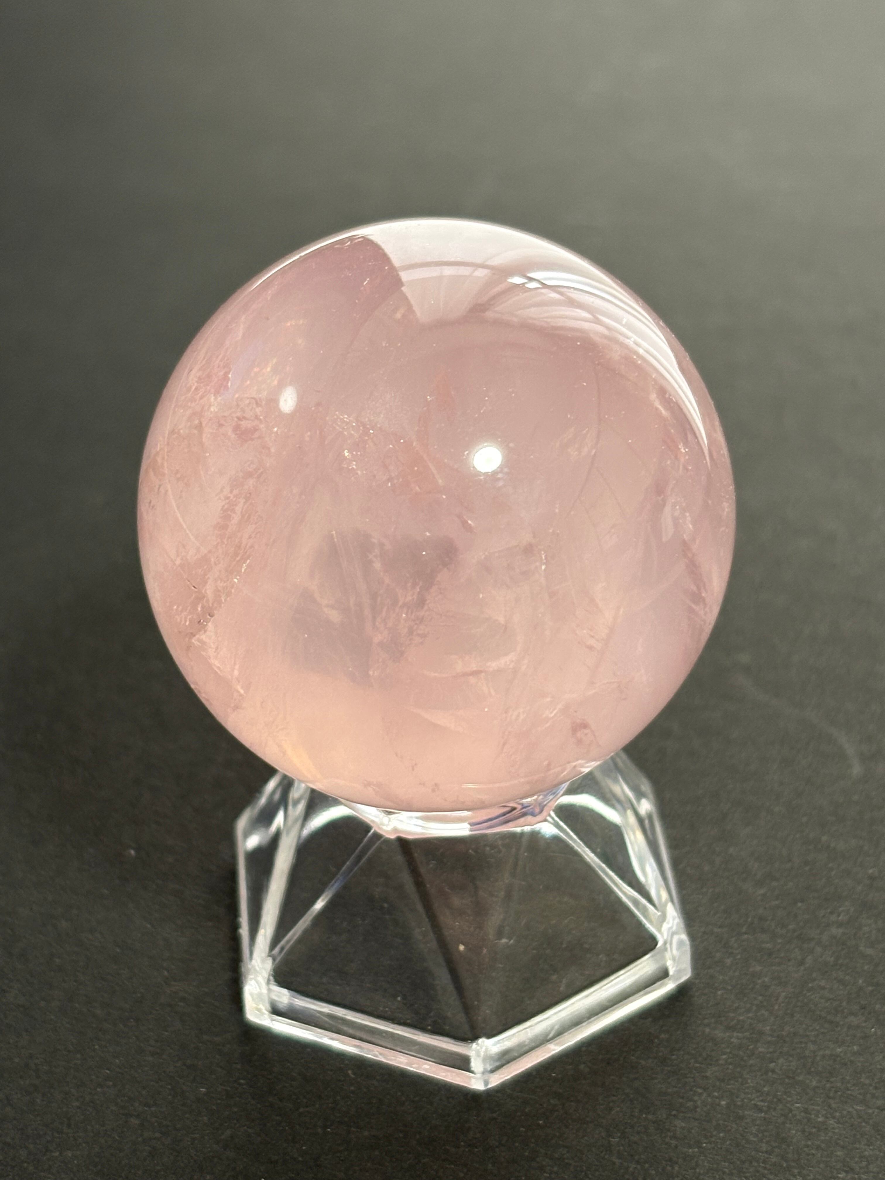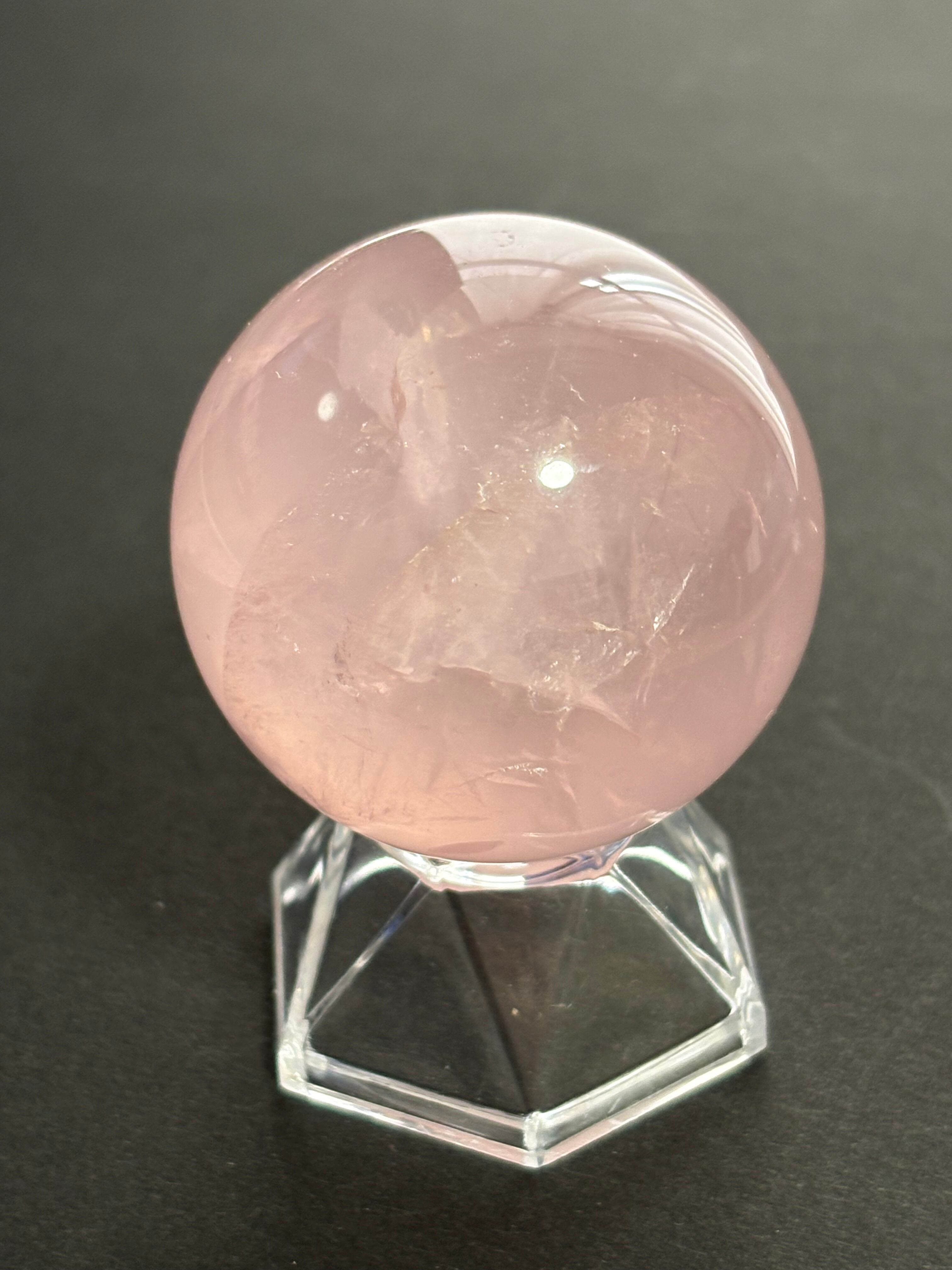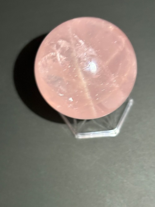 透明度があり、とろみのある愛らしいピンク真ん中の光の筋が非常に太く濃くキラリと光る高品質スターローズクォーツ丸玉です。ただ、一か所欠けがあったのでお値段はぐっとお安くなっています。個人的にはおすすめです(*^_^*)