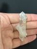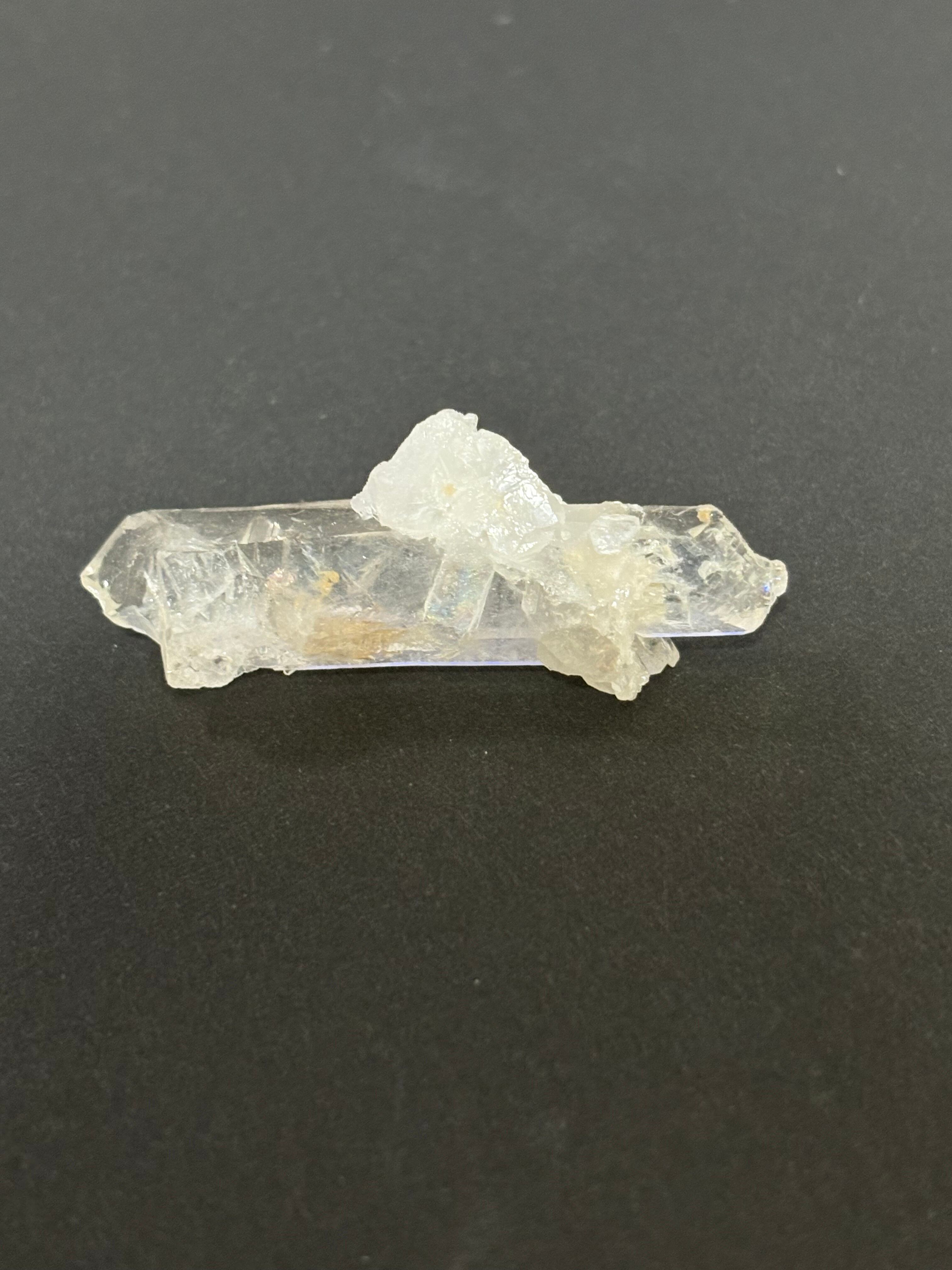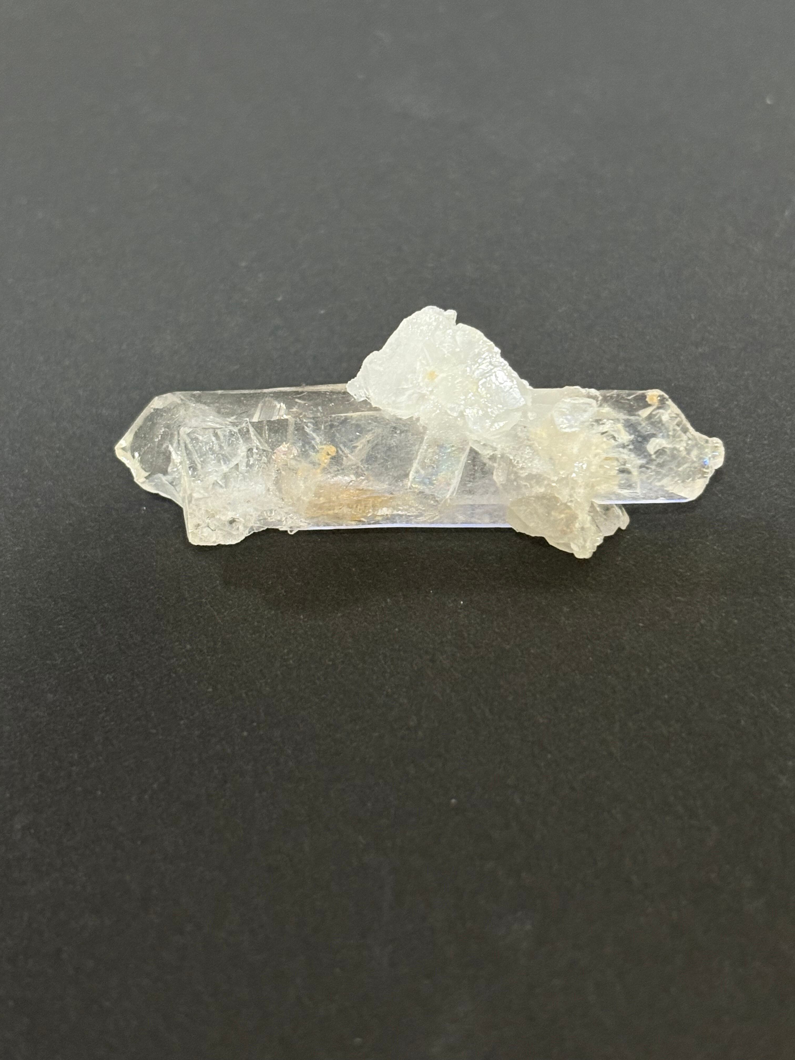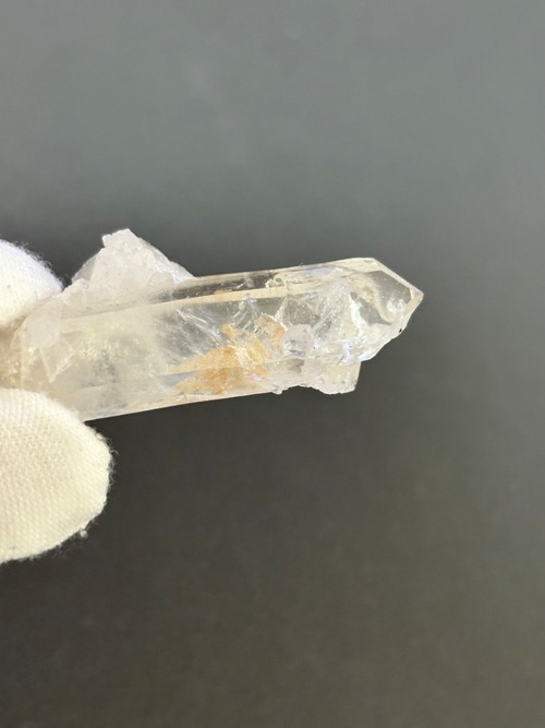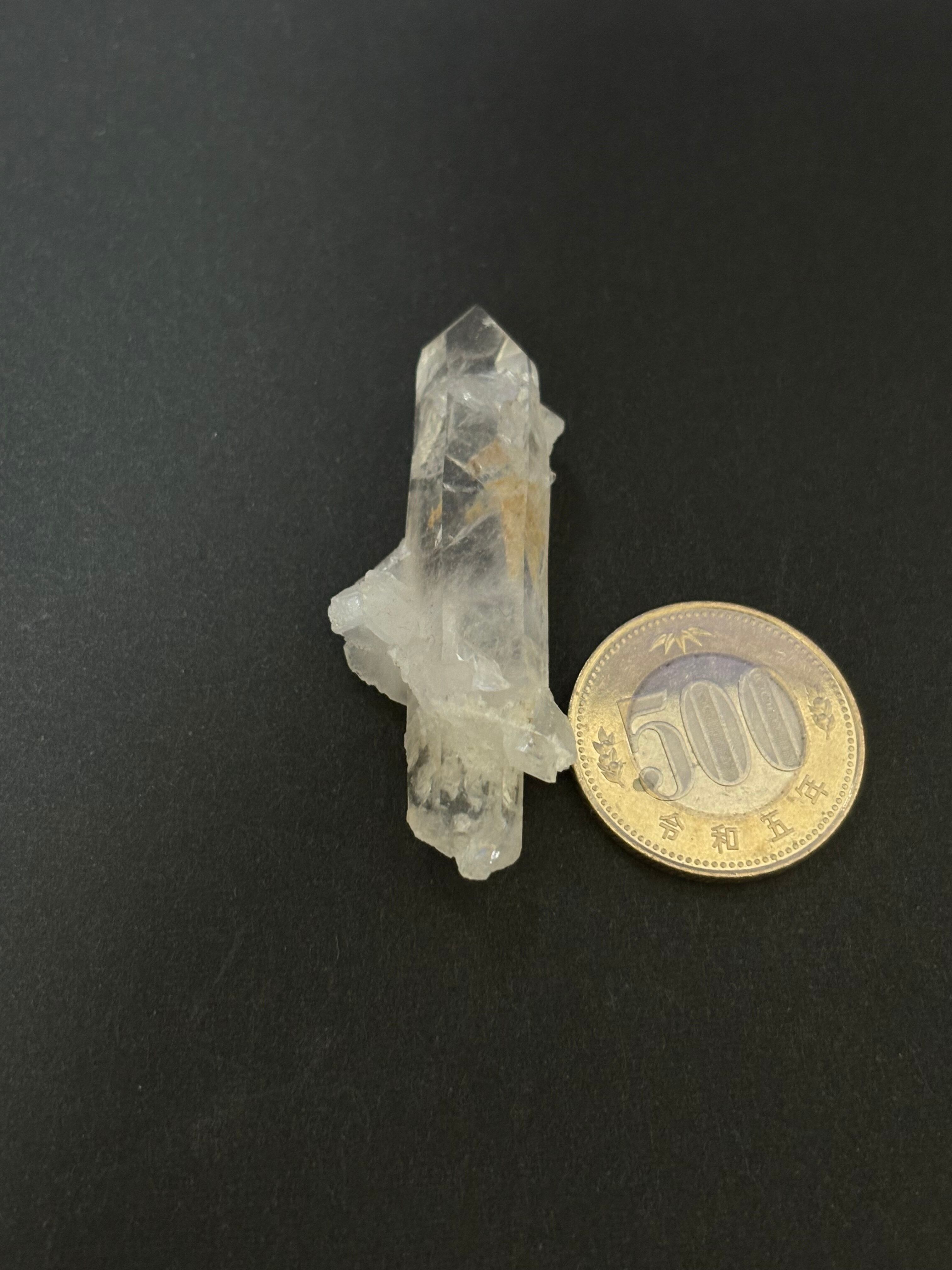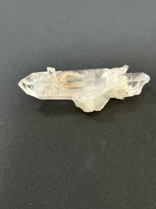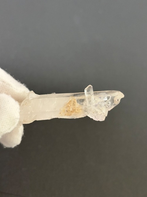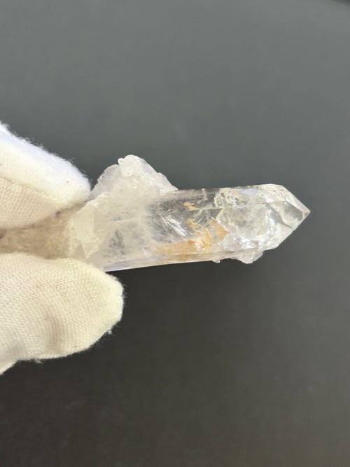 小さめの水晶ナチュラルポイントなのですが優しい雰囲気と神秘的なオーラをまとっていて非常に惹きつけられる水晶です。よく見ると他の水晶とブリッジしていた模様でポイント先端付近をじっと見ると別の水晶の先端が中に入っているのが見えます。またほぼ直角にクロスに入った小さな水晶も透明度が高く小さな虹も入って見どころは満載の素敵な水晶ポイントになります。
