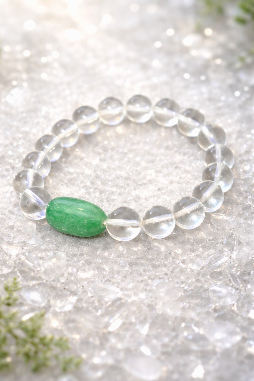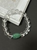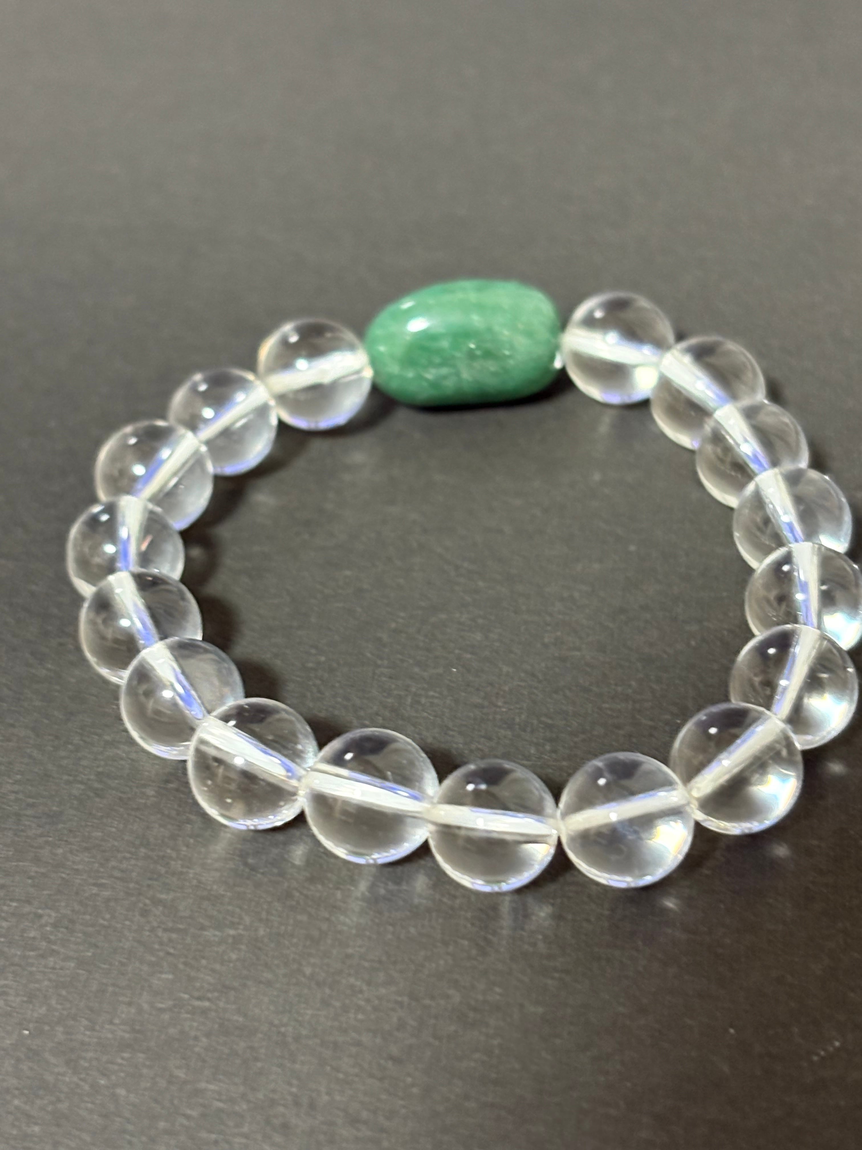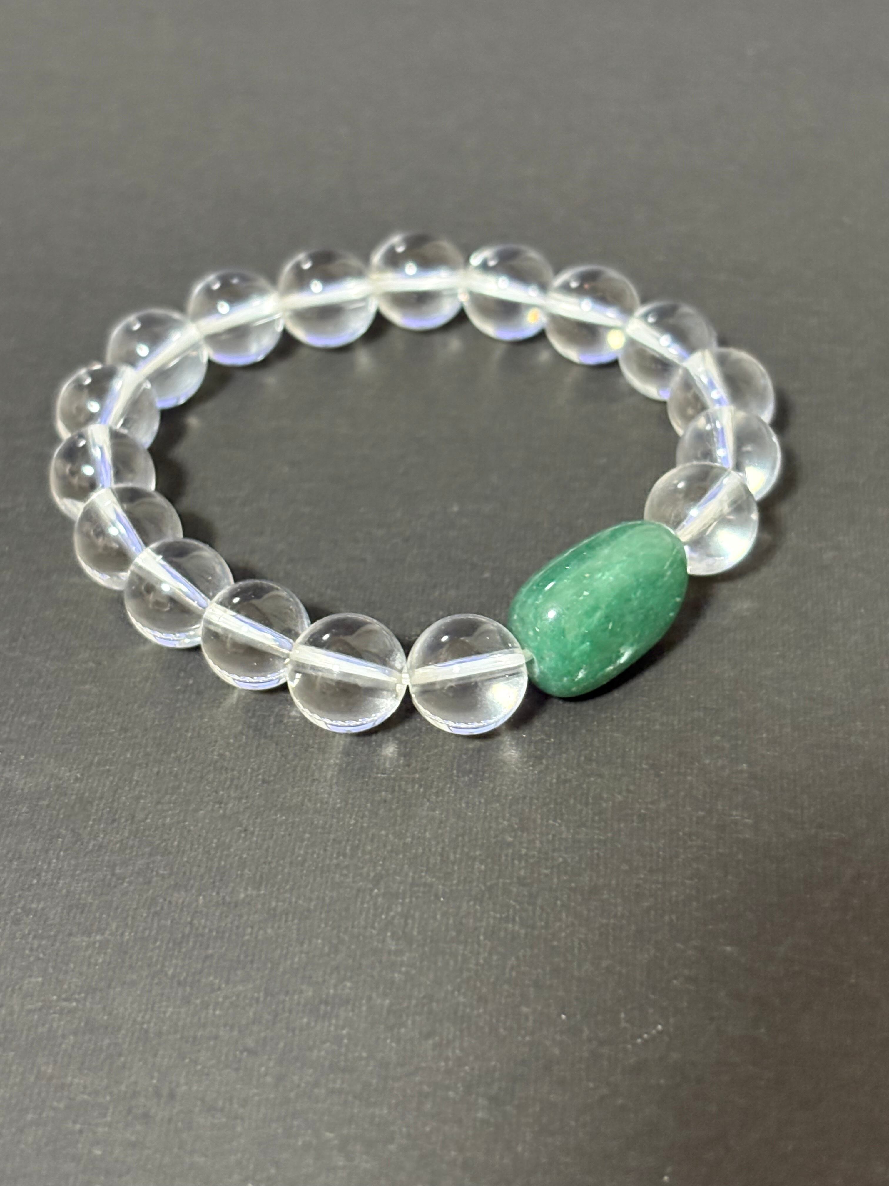 アベンチュリンは癒しと調和・繁栄の石です。潜在意識を活性化してくれる水晶をメインに一粒アベンチュリンを入れることでアベンチュリンの意味を増幅してくれ、怒りや不安を鎮め、深い洞察力を発揮し困難に直面しても冷静に解決策に導きます。また水晶と組み合わせることで自分の中に隠れていた潜在した能力を引き出す効果があり自己肯定感を上げ内側から自信を高める効果があると言われています。