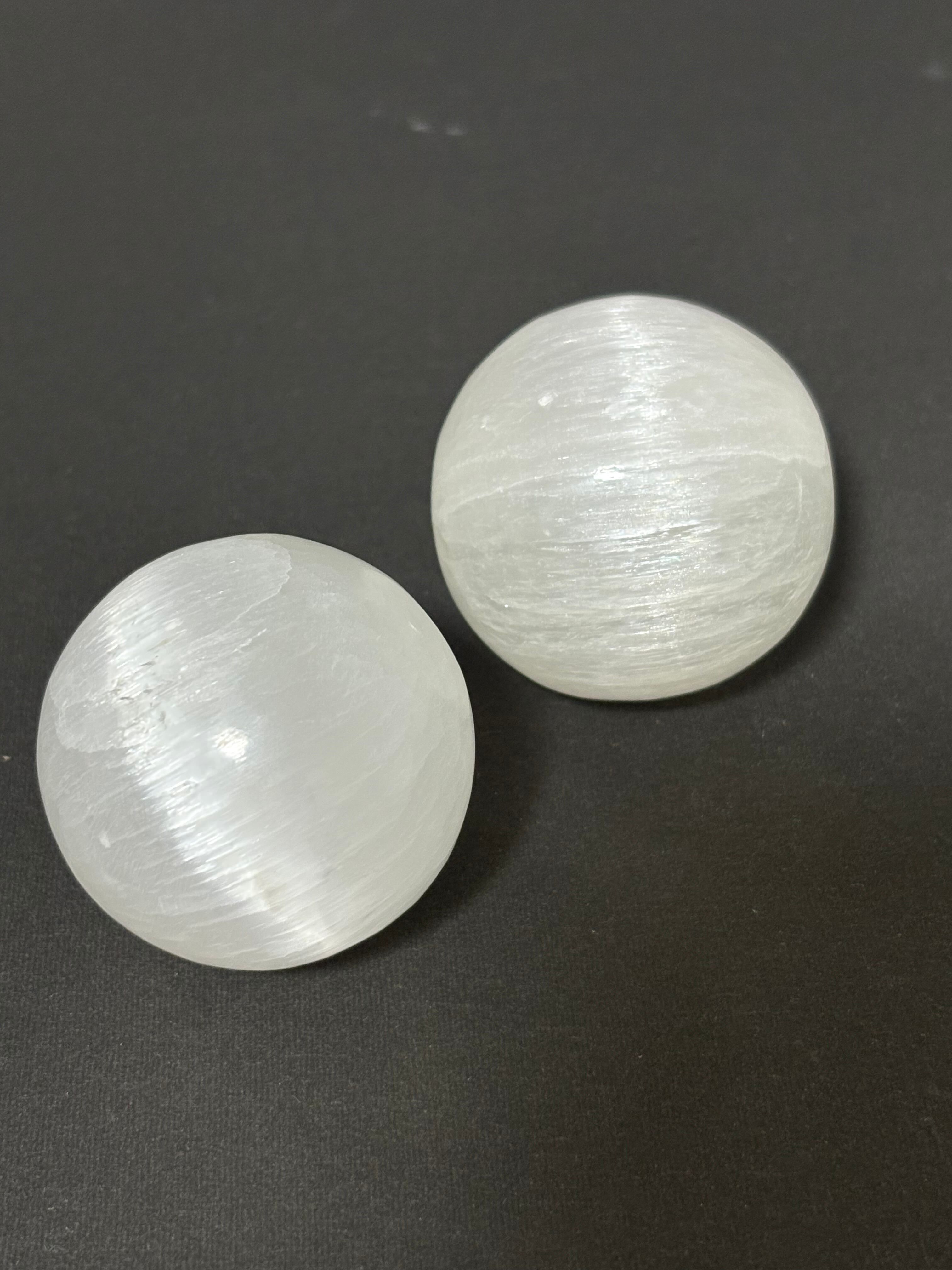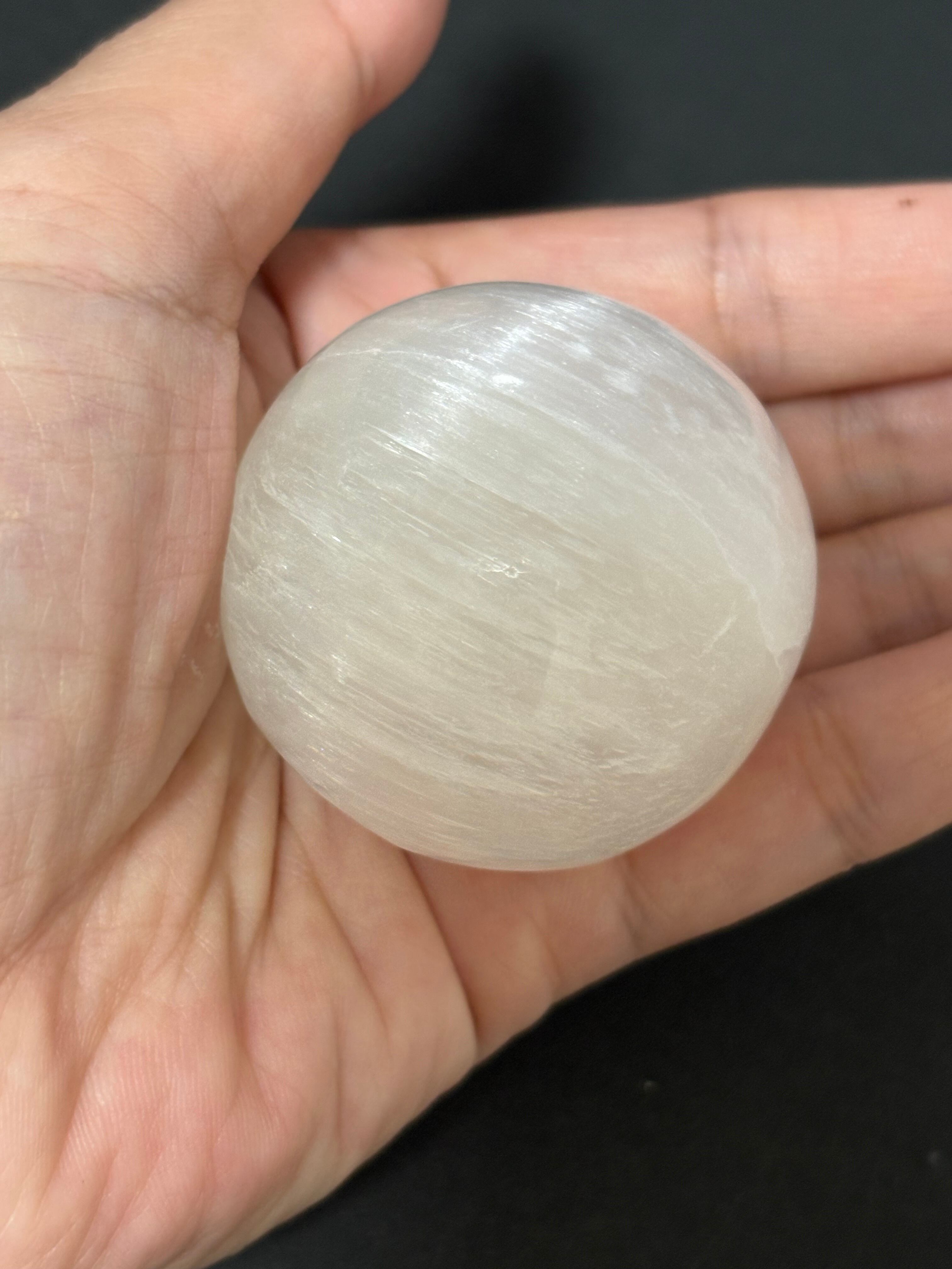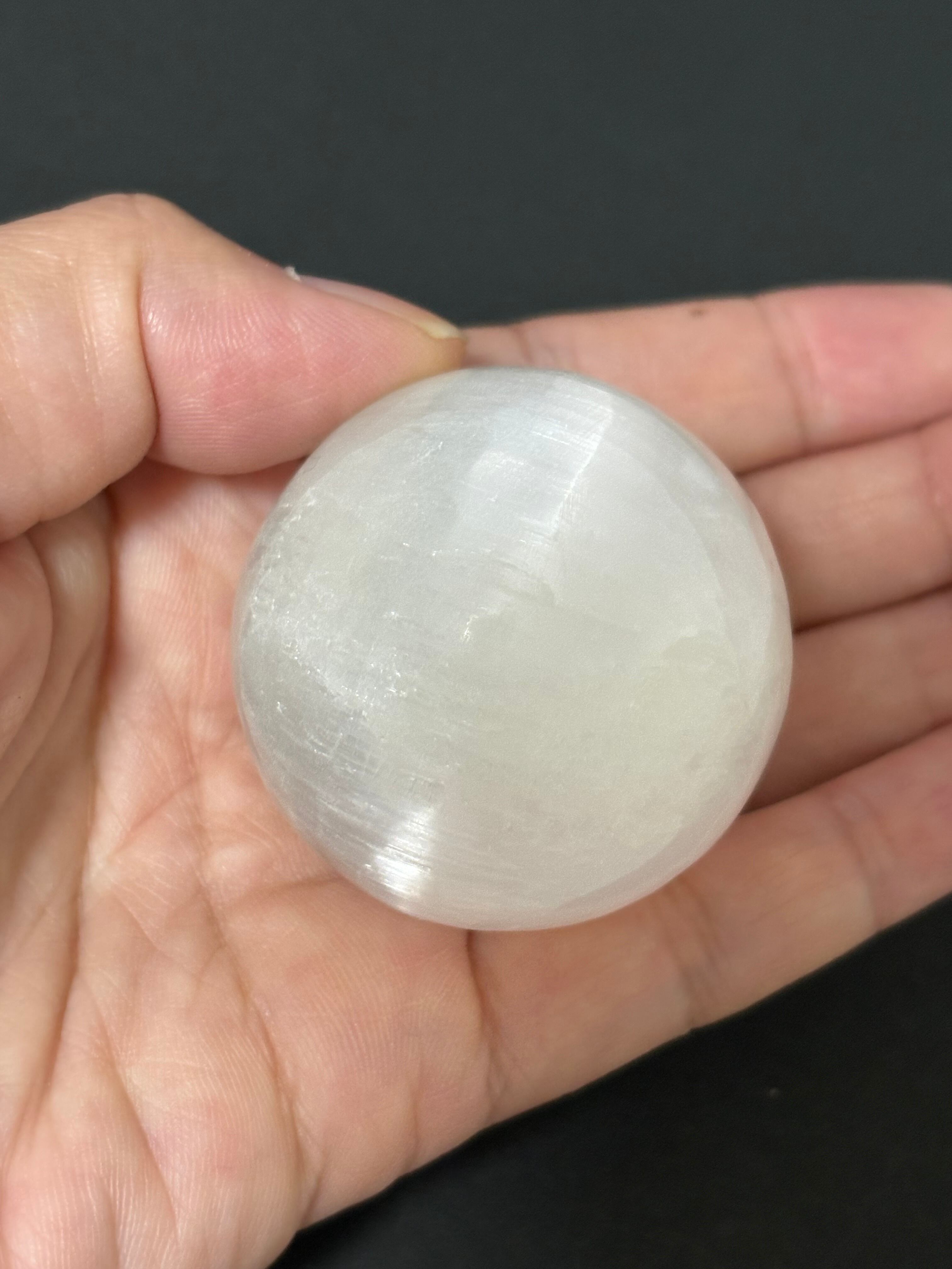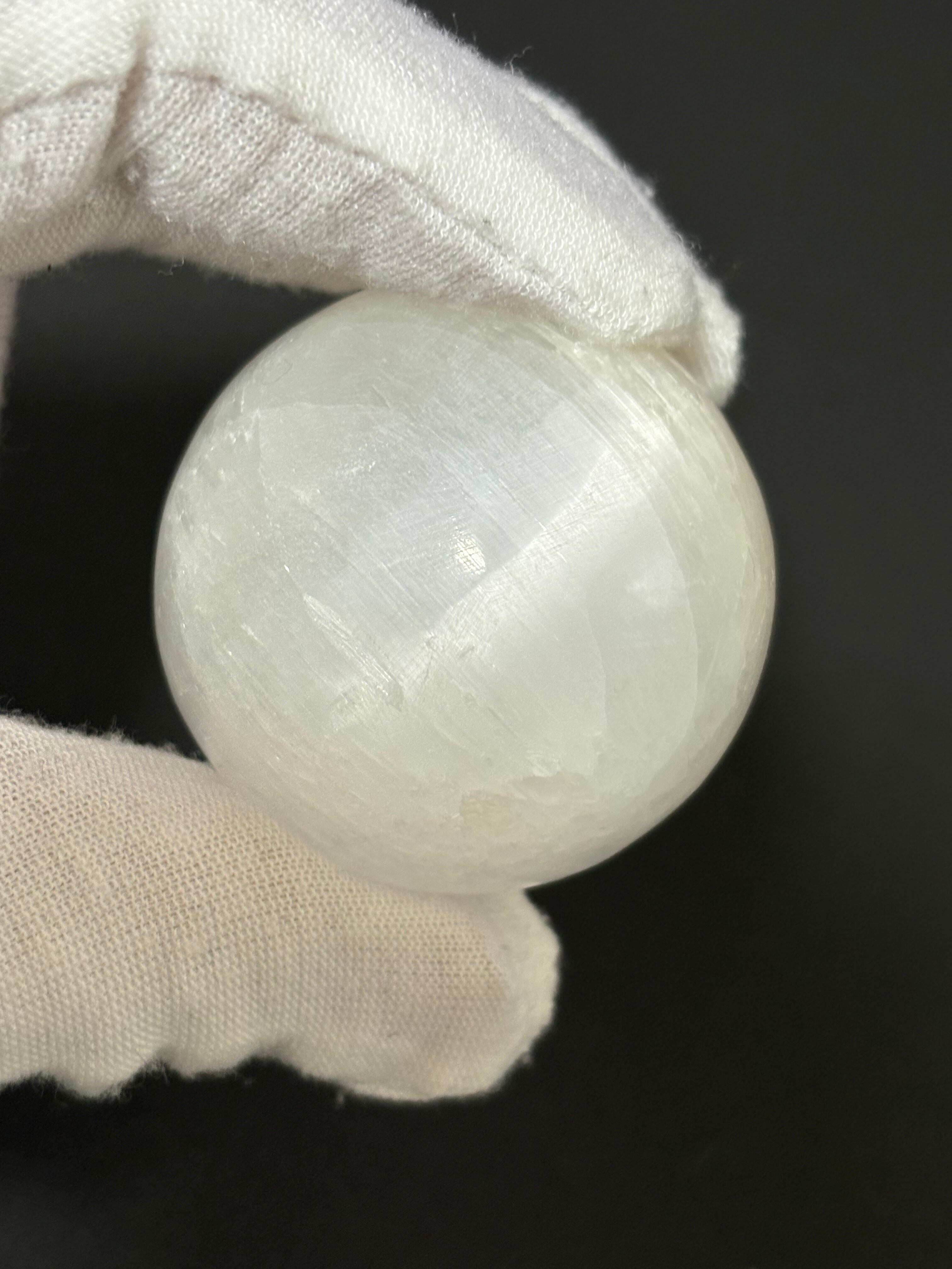 セレナイト丸玉 42mm前後 写真の中のいずれか一点アトランダムに発送させて頂きます。 セレナイトは非常に浄化作用の高い石で、ご覧になった方は「スッとした気分にさせてくれる」とよく、おっしゃています 鬱々した気分の時にスッと気分を変えてくれる何かスッとした風が吹き抜けていくかのような石です。 色は白、中にすりガラスのように透明な部分があったりキャッツアイ効果も見られます。 ただ、柔らかい石なので傷つきやすく水にも弱く取り扱いにはお気をつけくださいませ。