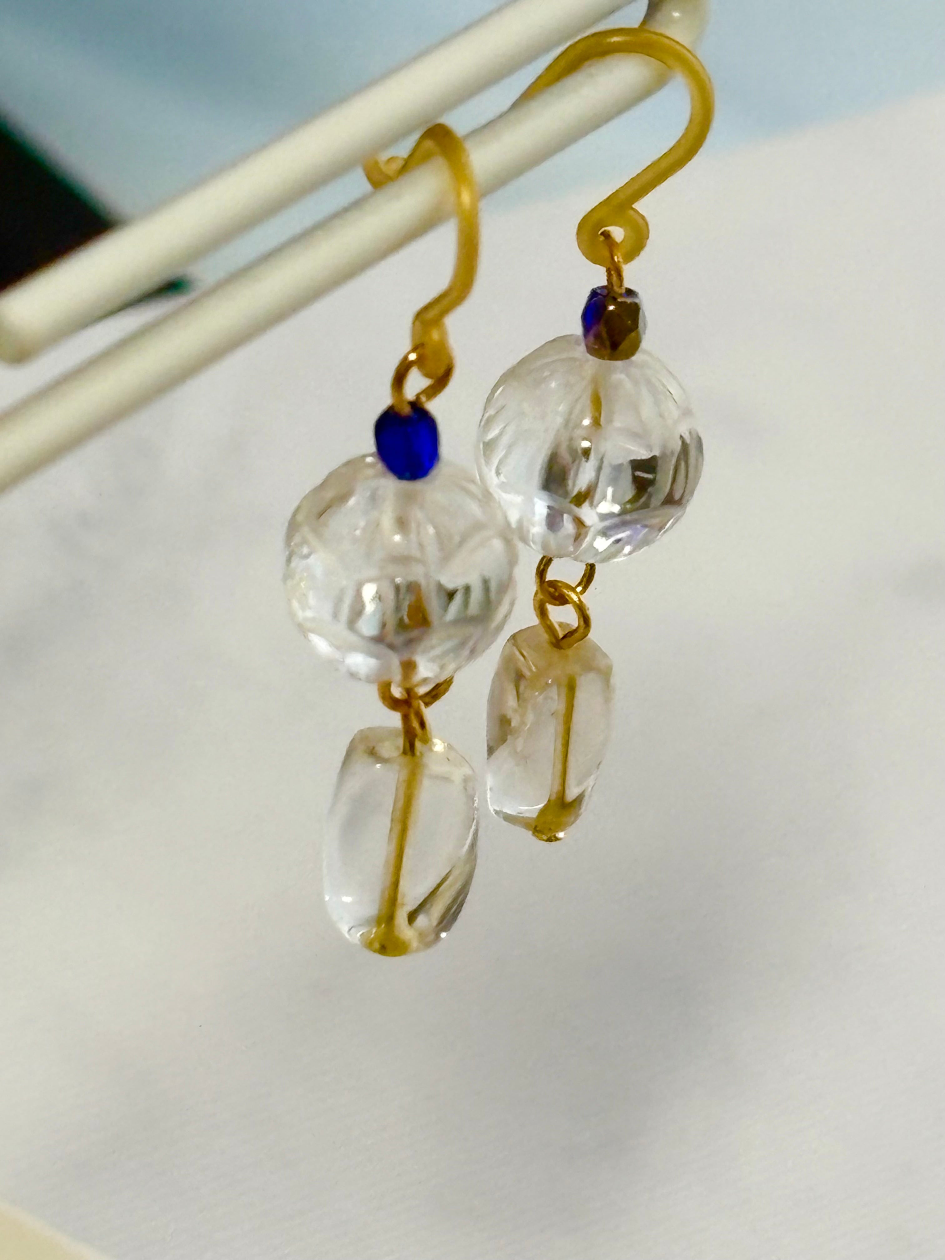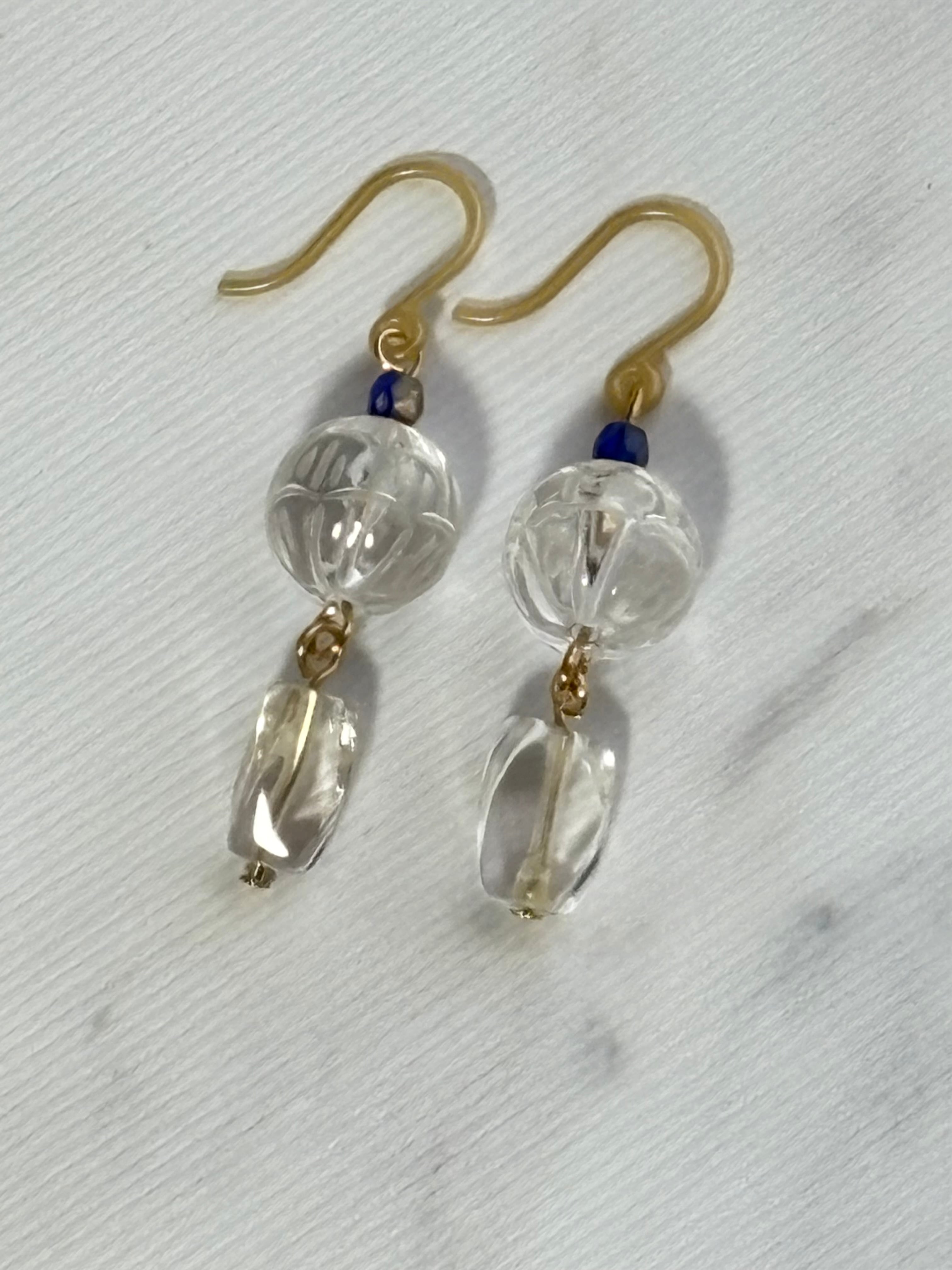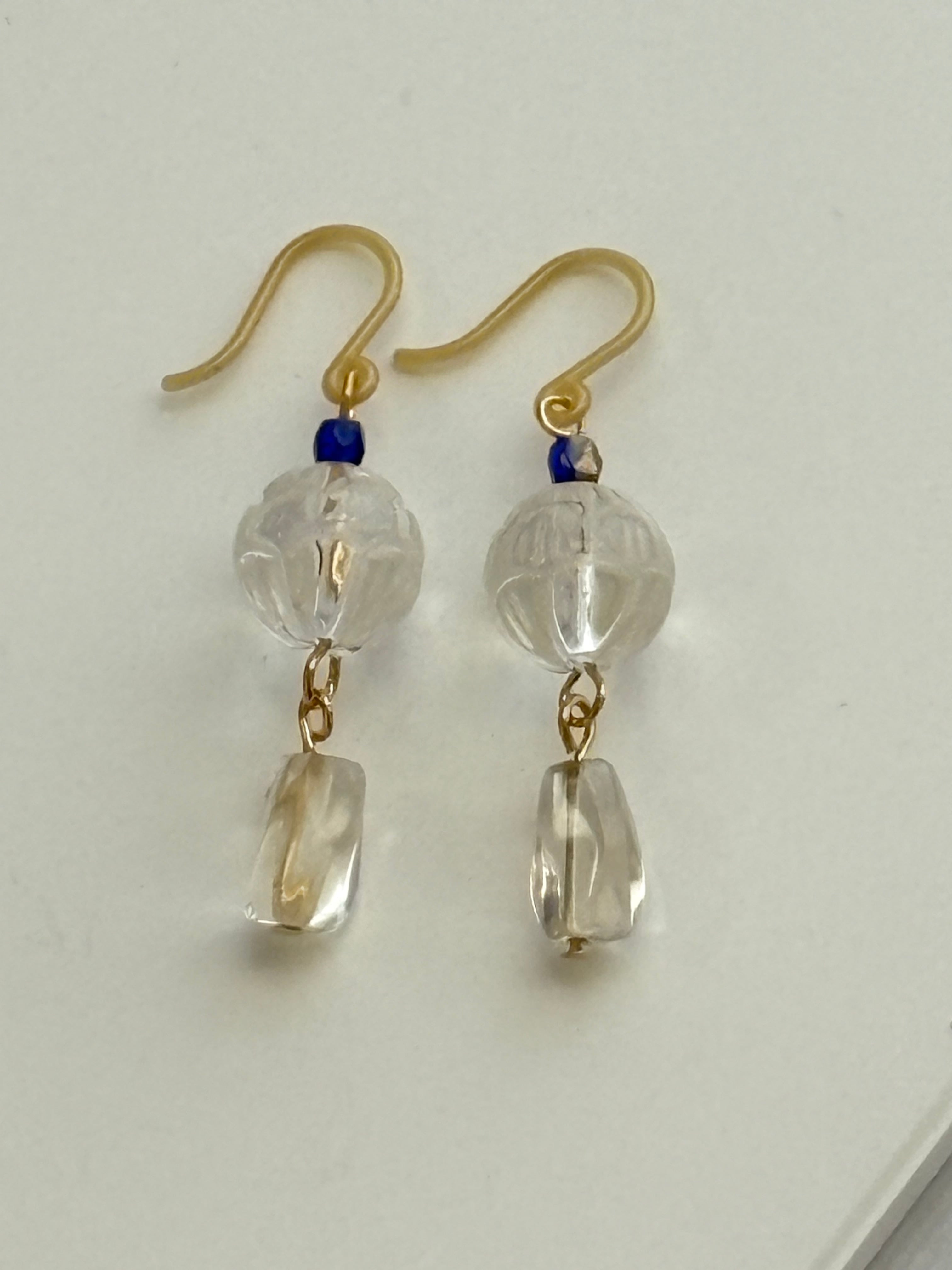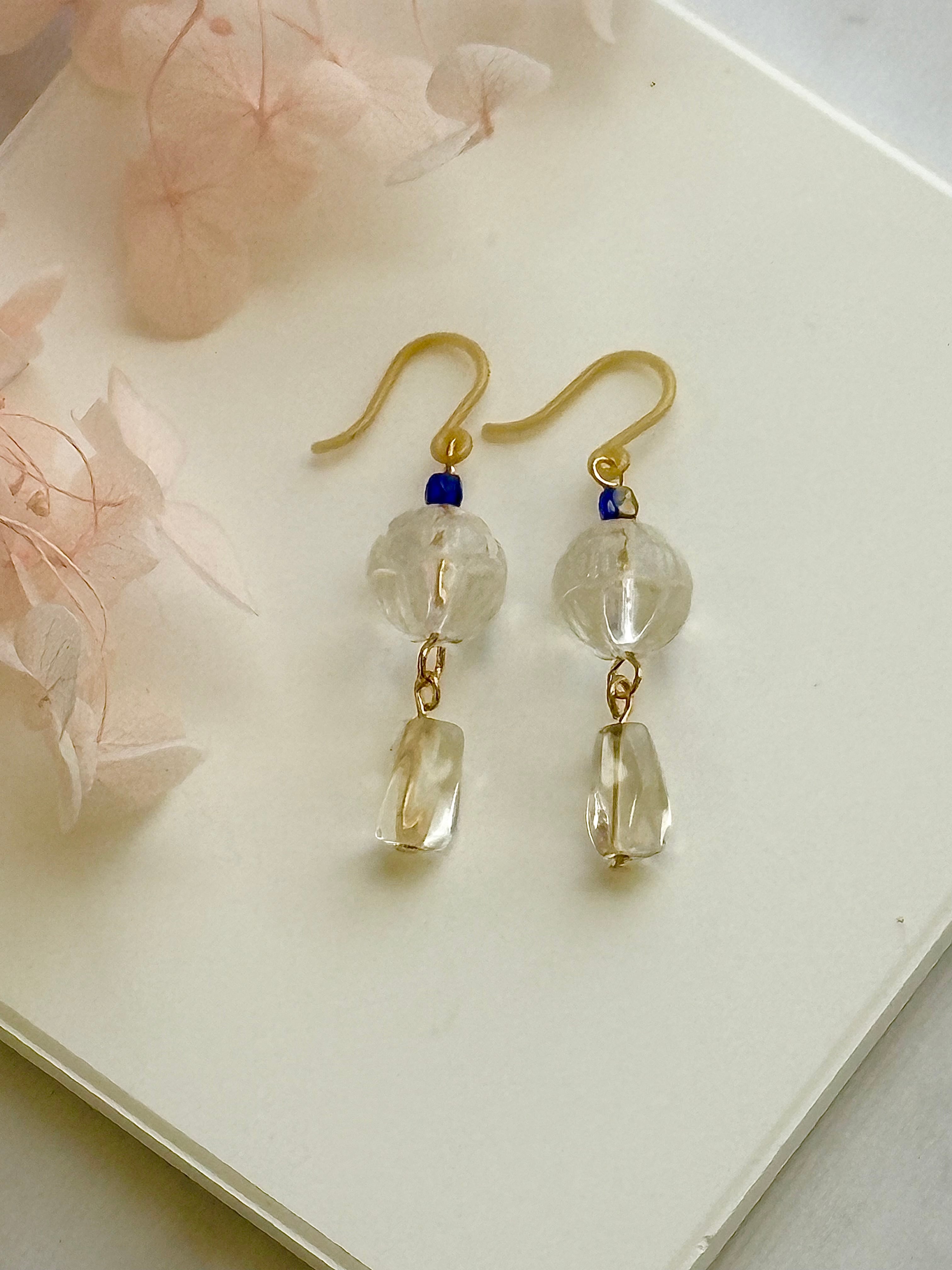 心穏やかになる蓮の花を形どった水晶と怒りや不安を鎮めてくれるスワロフスキービーズのブルーが目を引き、縦長のスモーキークォーツがグラウディングを助ける揺れるタイプのピアスです。