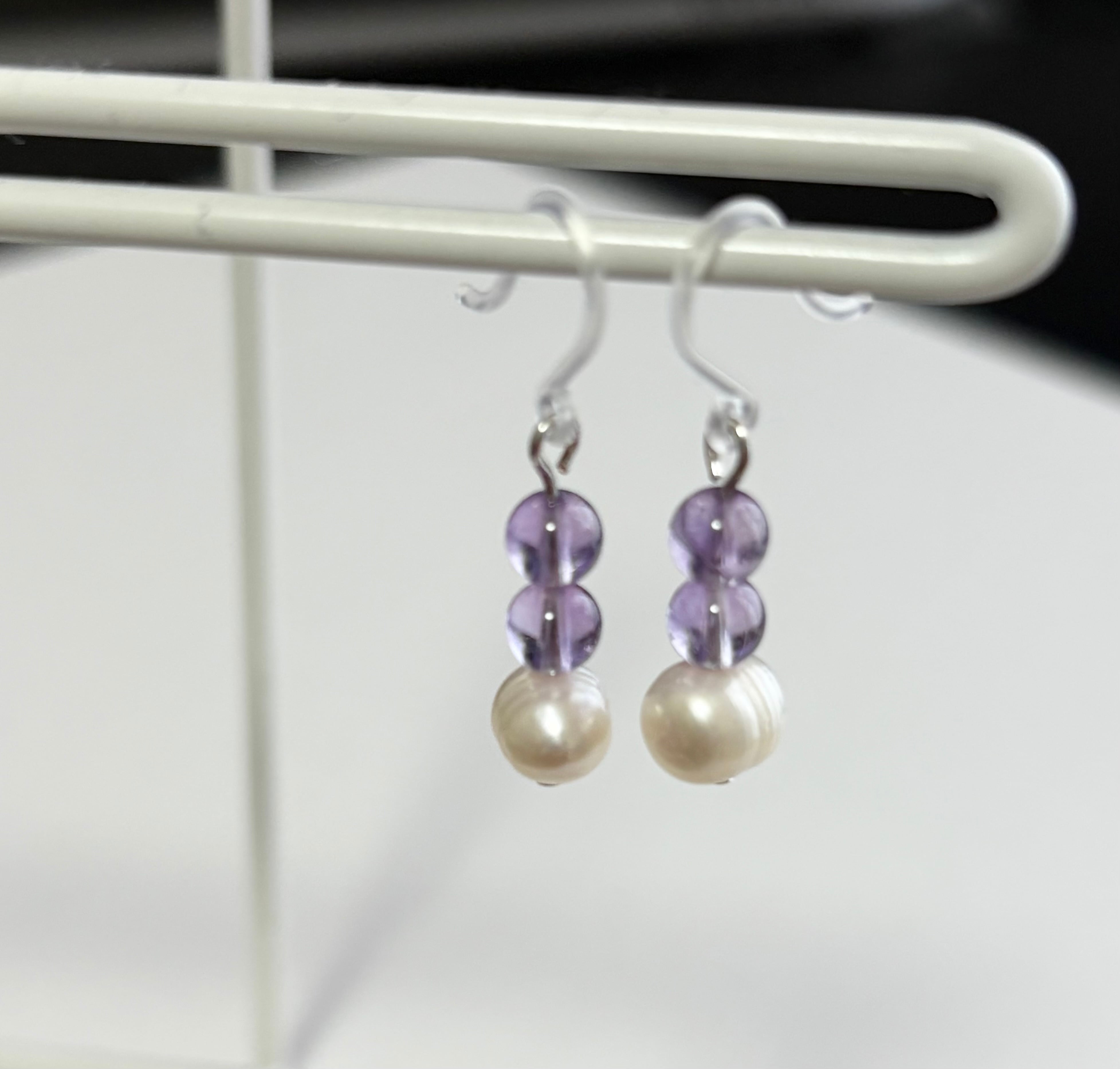 淡水パールとアメジストが織りなす美しいコントラストは、その日の気分を明るくしてくれることでしょう。どの個体が届くかはお楽しみですが、どれも心を躍らせる素敵なピアスです!