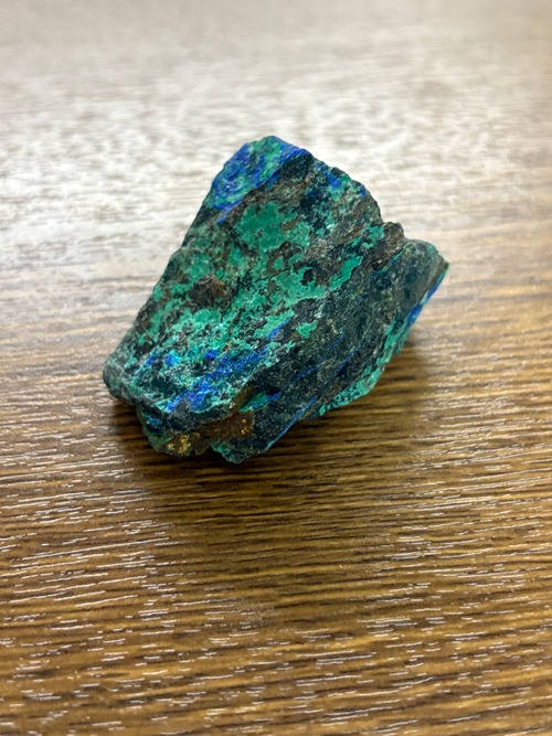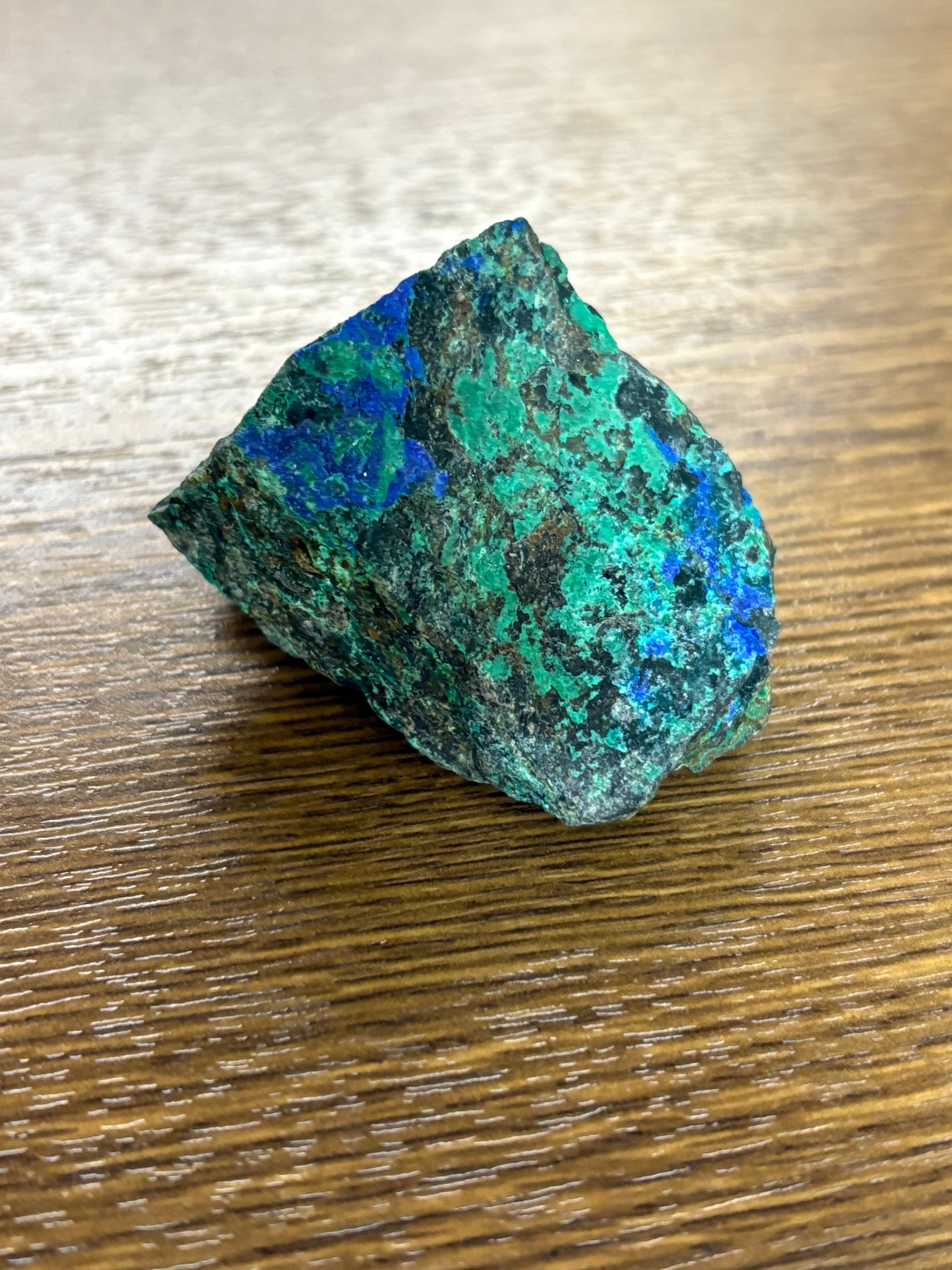 アズライトとマラカイトが融合した独自の色合いと模様を持つ、パワーを秘めた天然石です。緑と青のコントラストが目を引き、手に取るたびに心を惹きつけます。