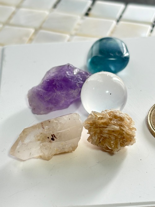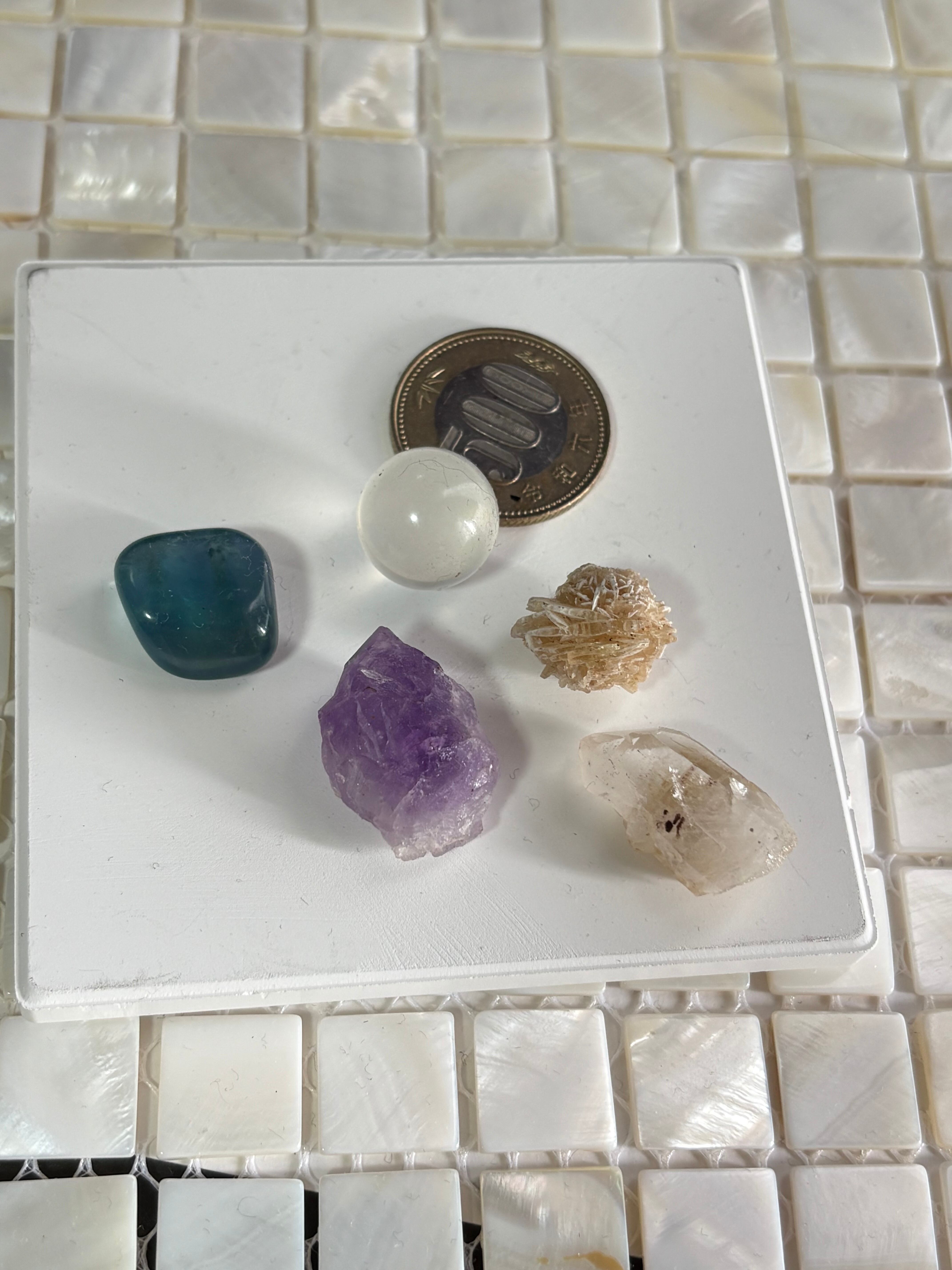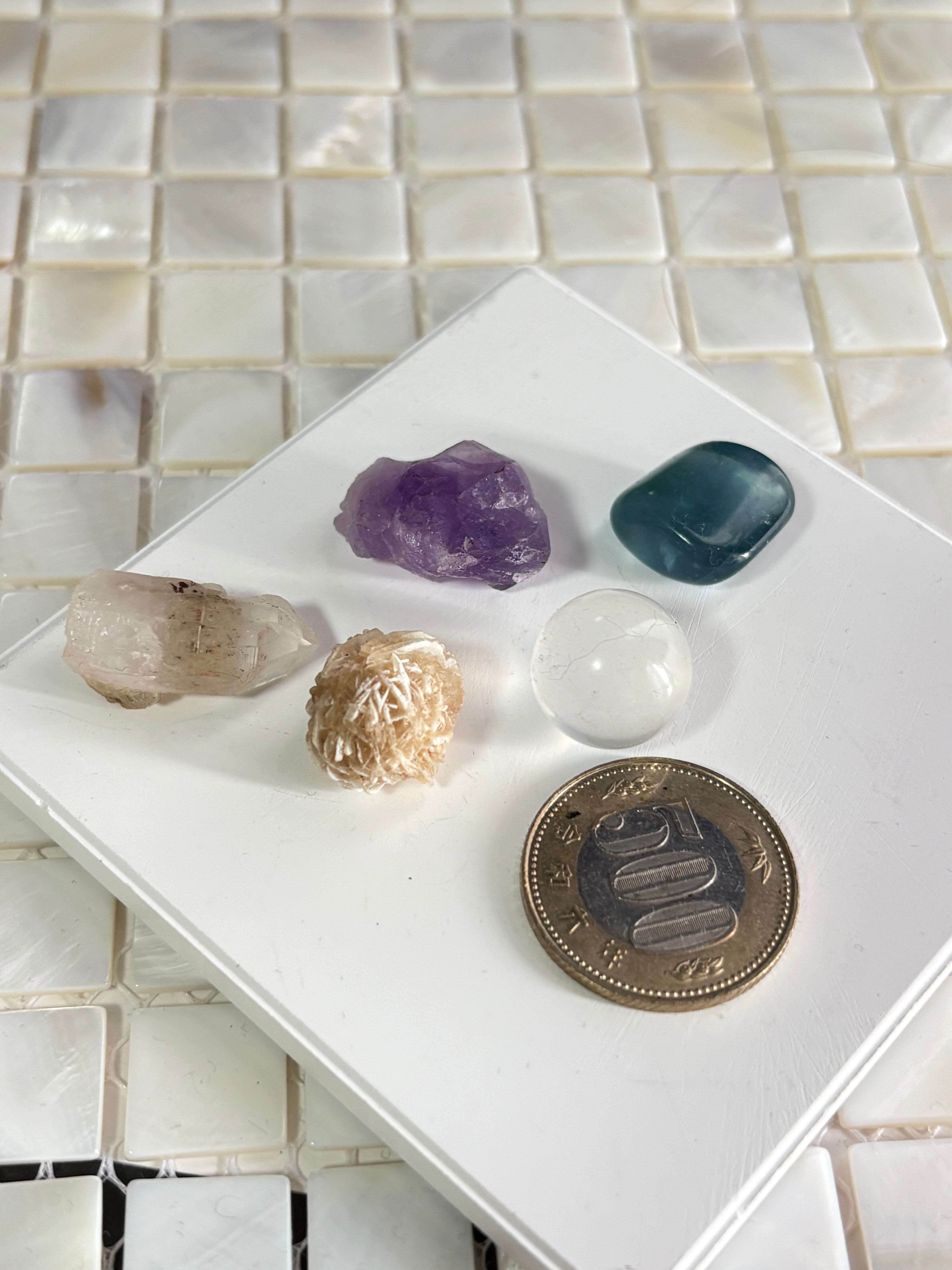 アメジスト,メタモルフォーゼ,水晶,砂漠の薔薇,フローライトのセットです。