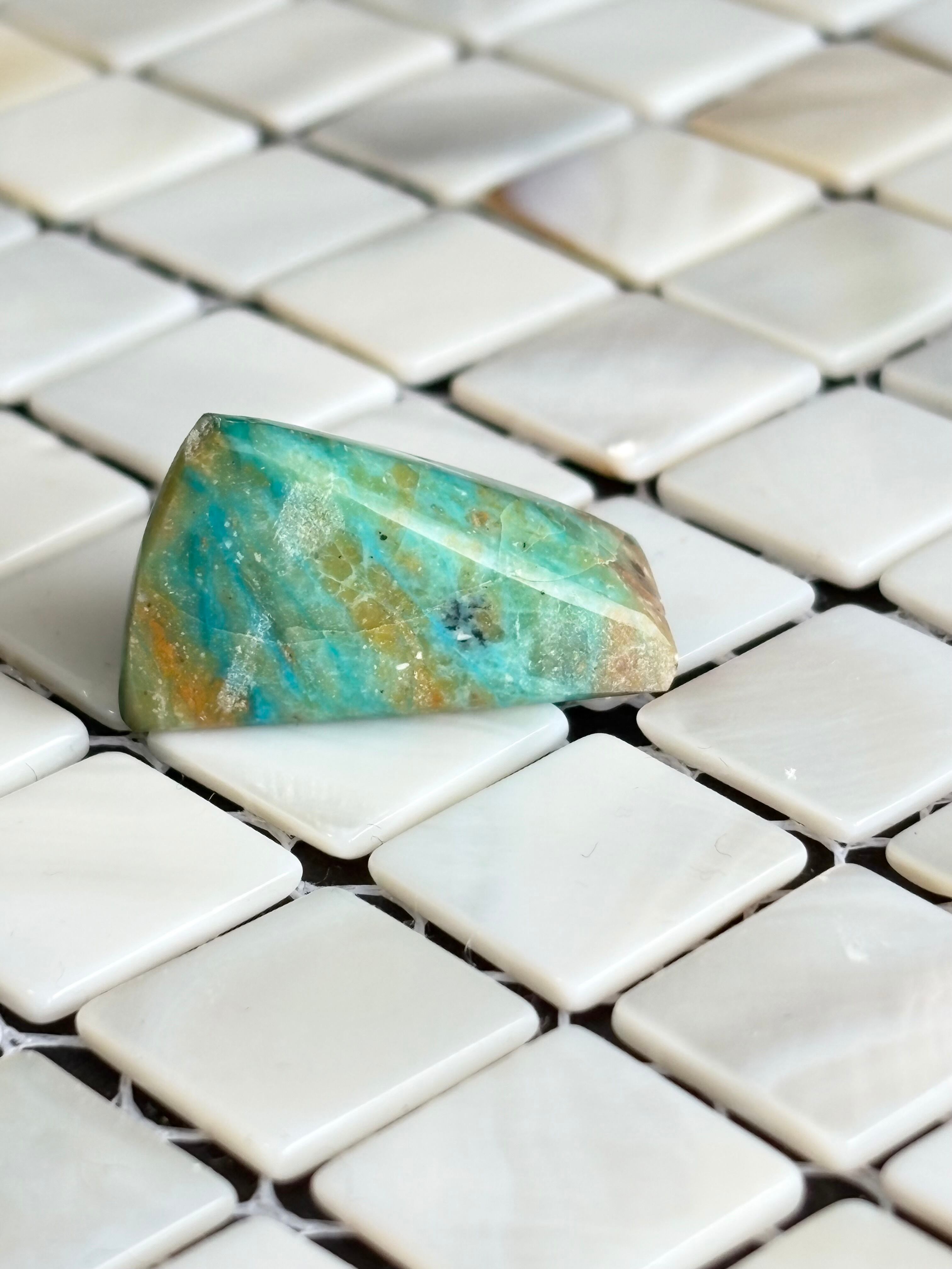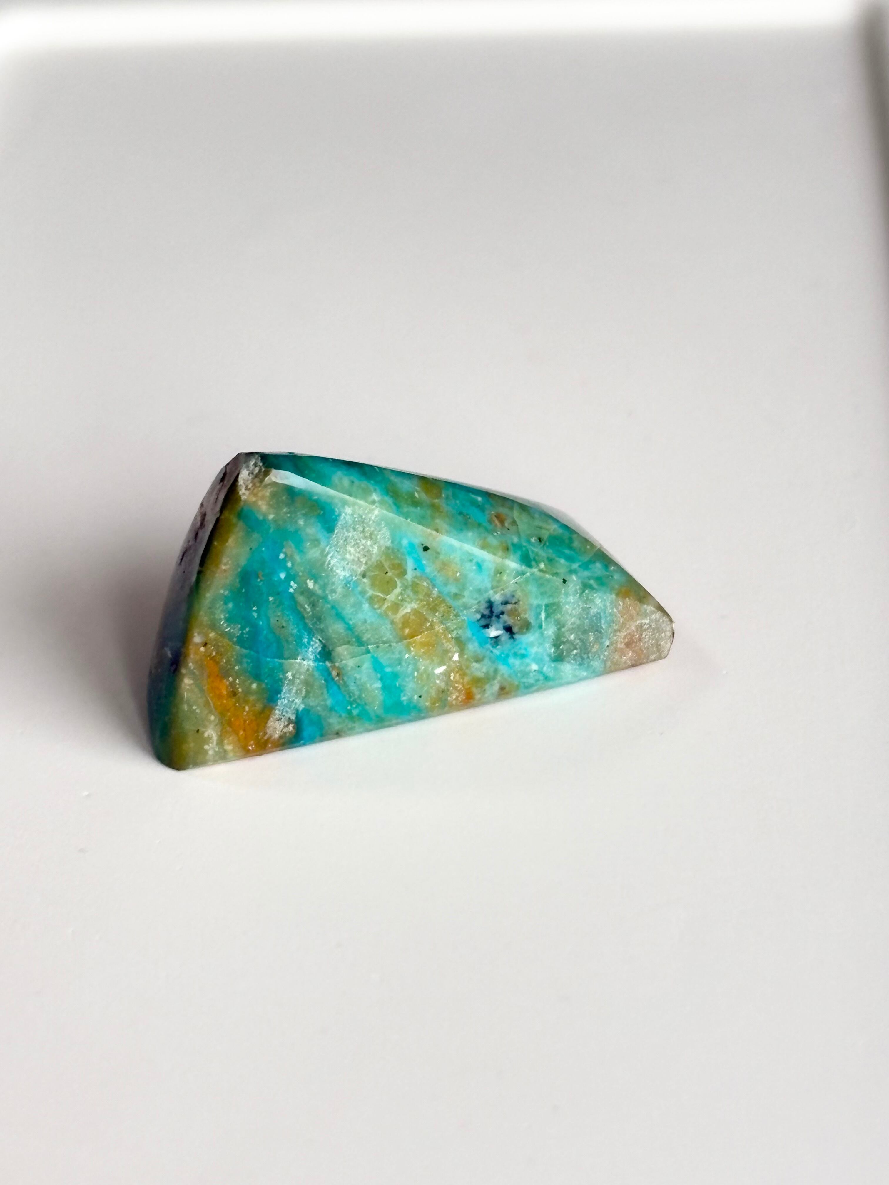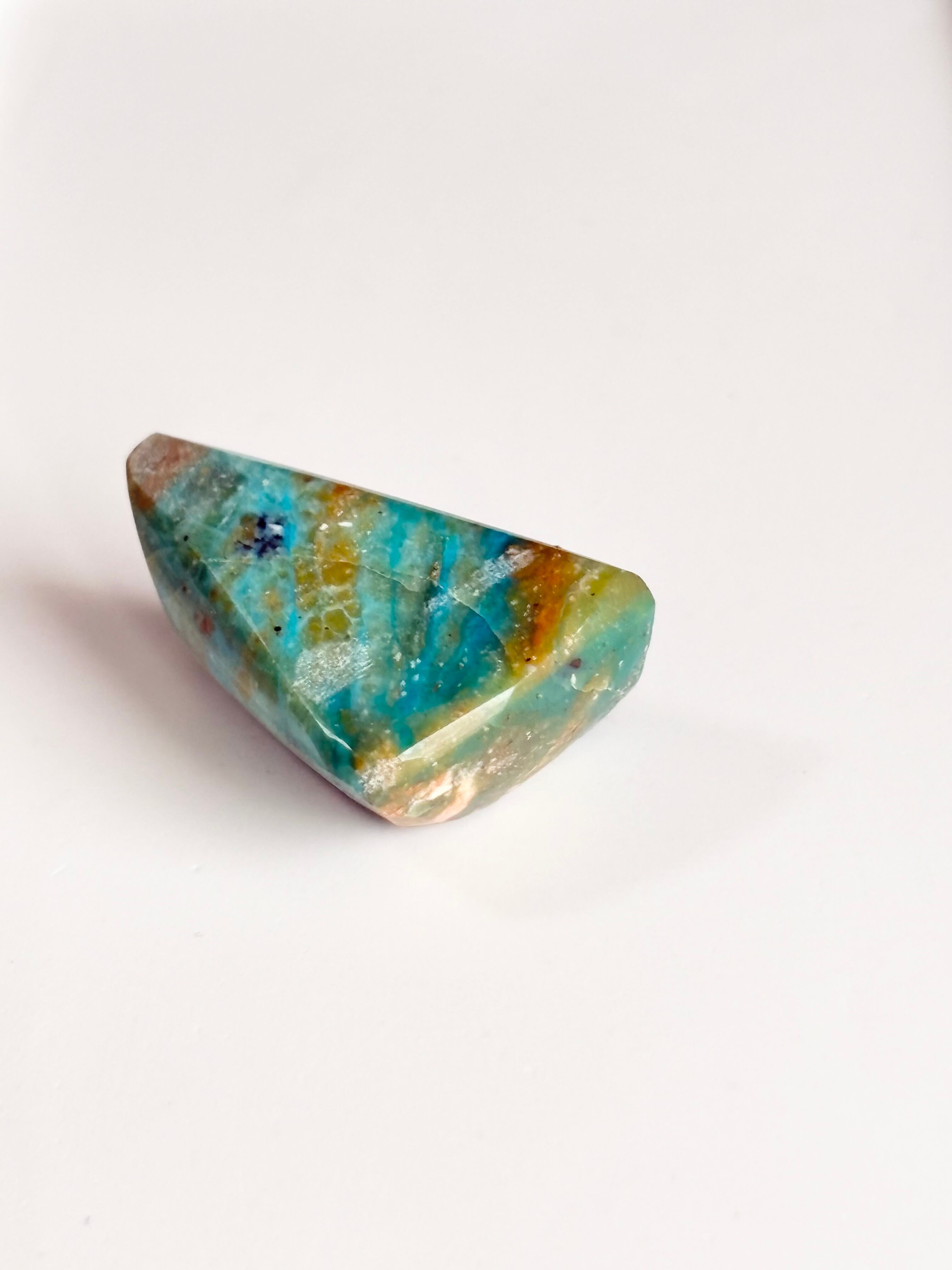 鮮やかなブルーが魅力のブルーオパール原石です。この石は、優しい色合いと自然なフォルムが特徴で、お部屋のインテリアアイテムとしてぴったりです!(*^_^*)