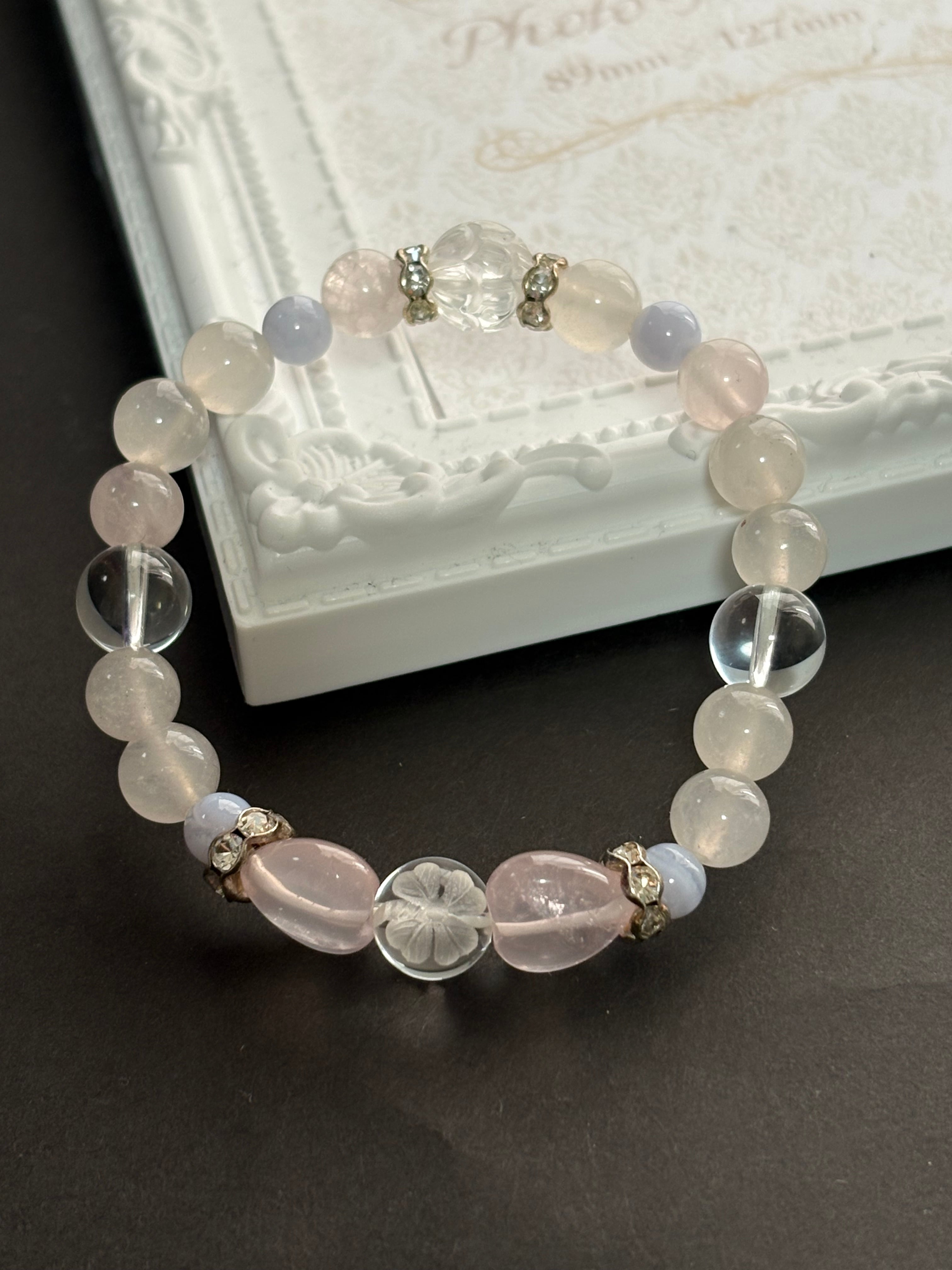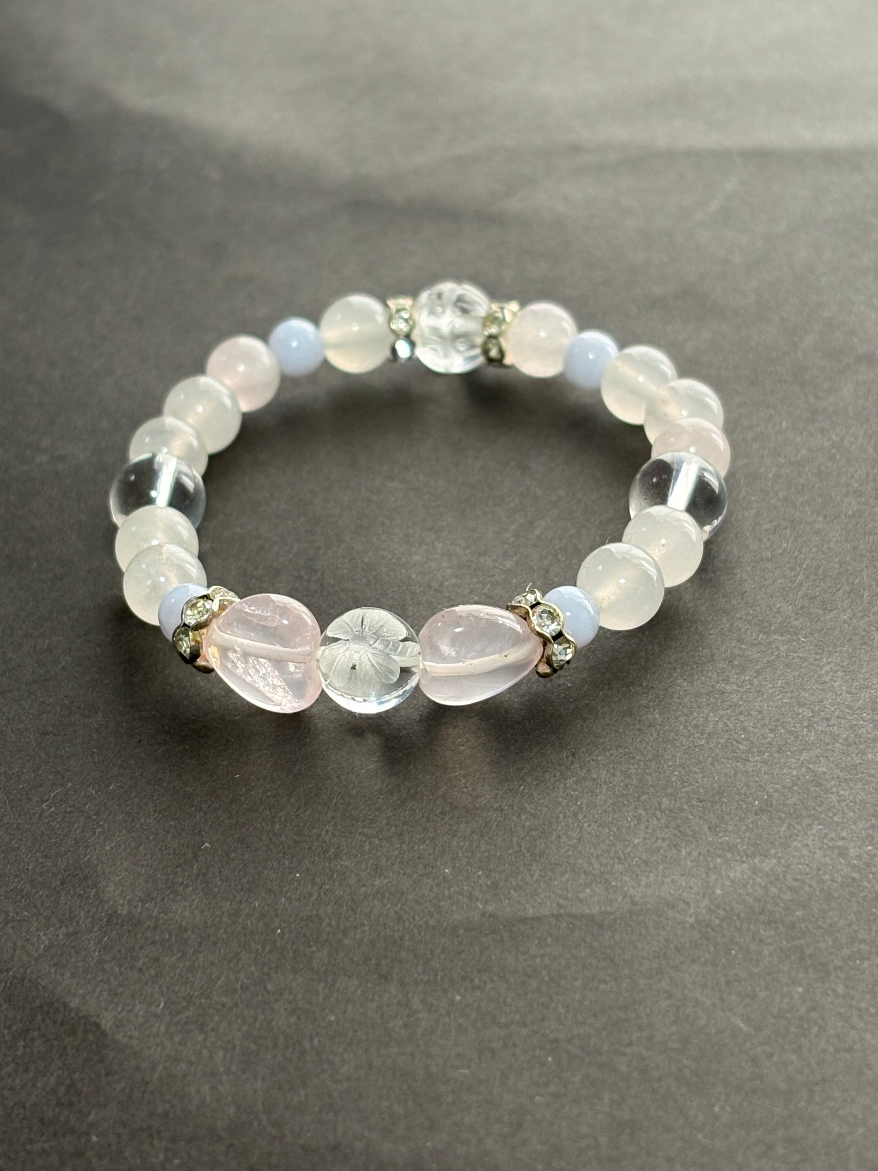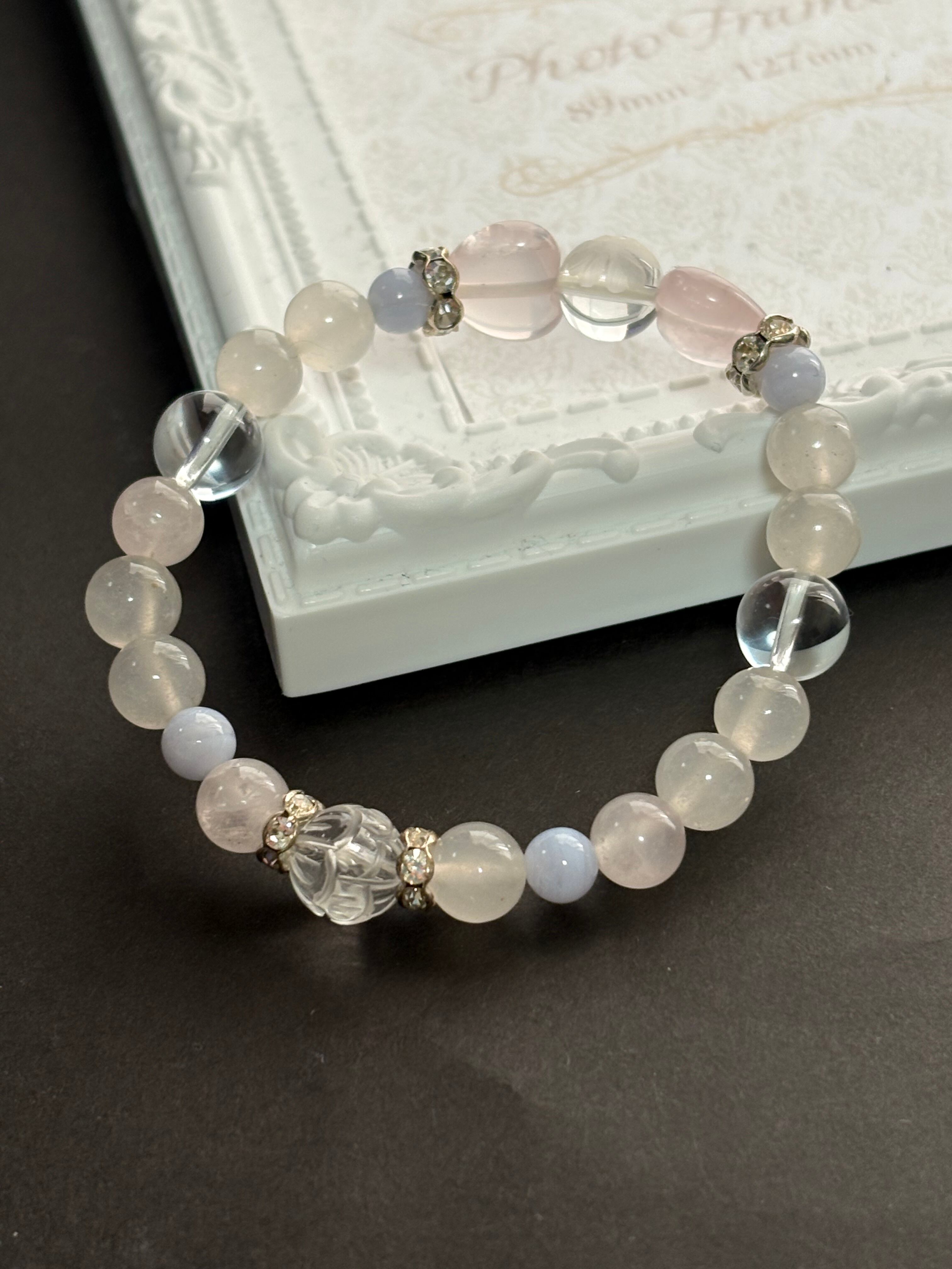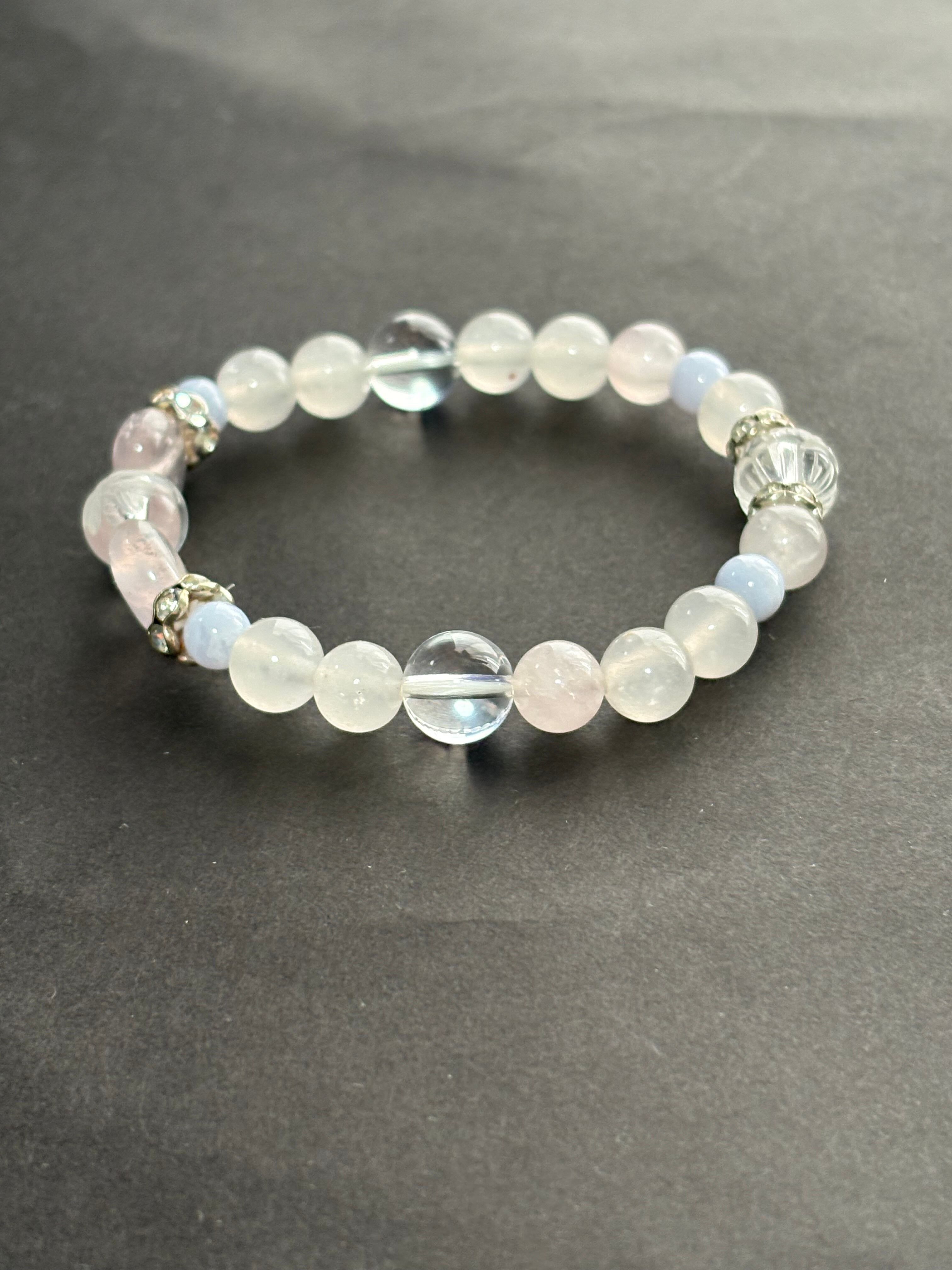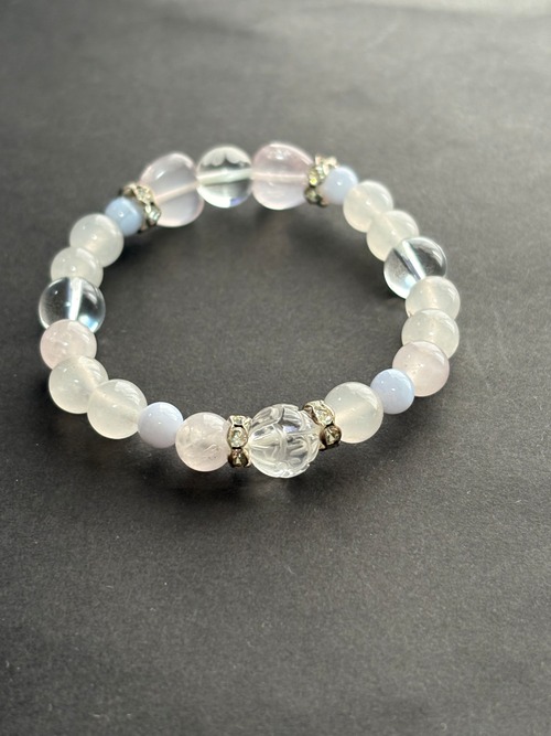 ローズクォーツは、愛と友情を育む石とされ、心の平和をもたらしてくれるでしょう。ブルーレースは穏やかなエネルギーを持ち、コミュニケーションを円滑にする手助けをしてくれるといわれています。このブレスレットは、日常のコーディネートに彩りを加え、自分らしさを表現するのに最適です。