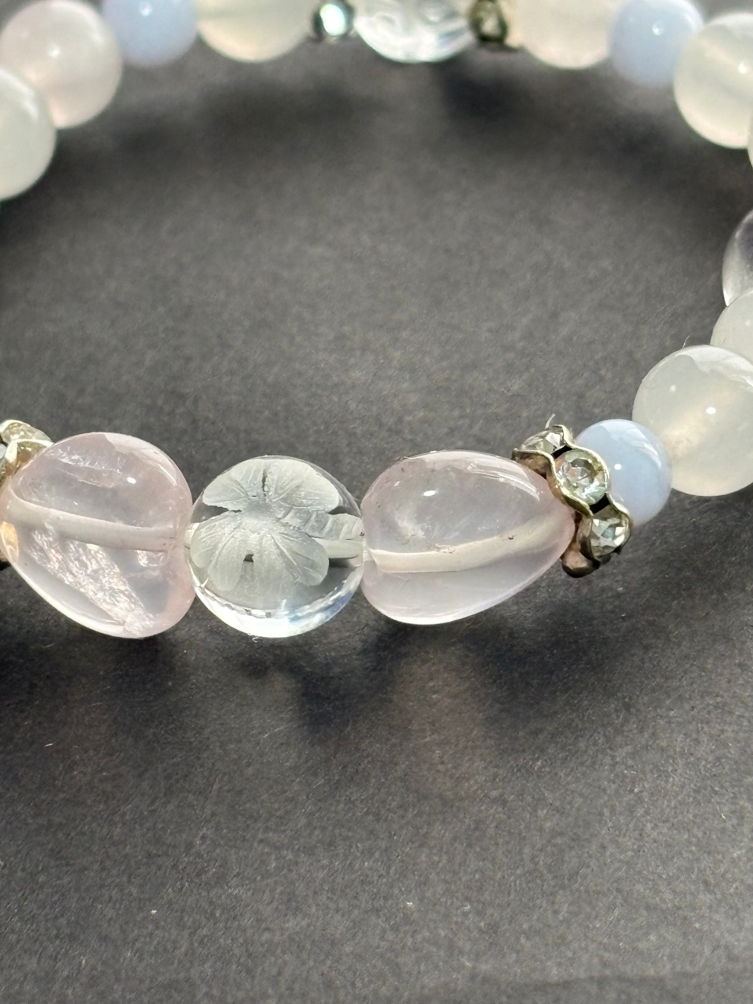 透明度の高い美しいローズクォーツのハート型があったので幸せを呼ぶ「四つ葉のクローバー」彫刻入り水晶を挟んでみました、ミルキーなローズクォーツとヒーリング効果の高いブルーレース,泥の中でも美しく咲く「蓮の花」彫刻水晶と一緒に優しい感じブレスレットになりました(*^_^*)