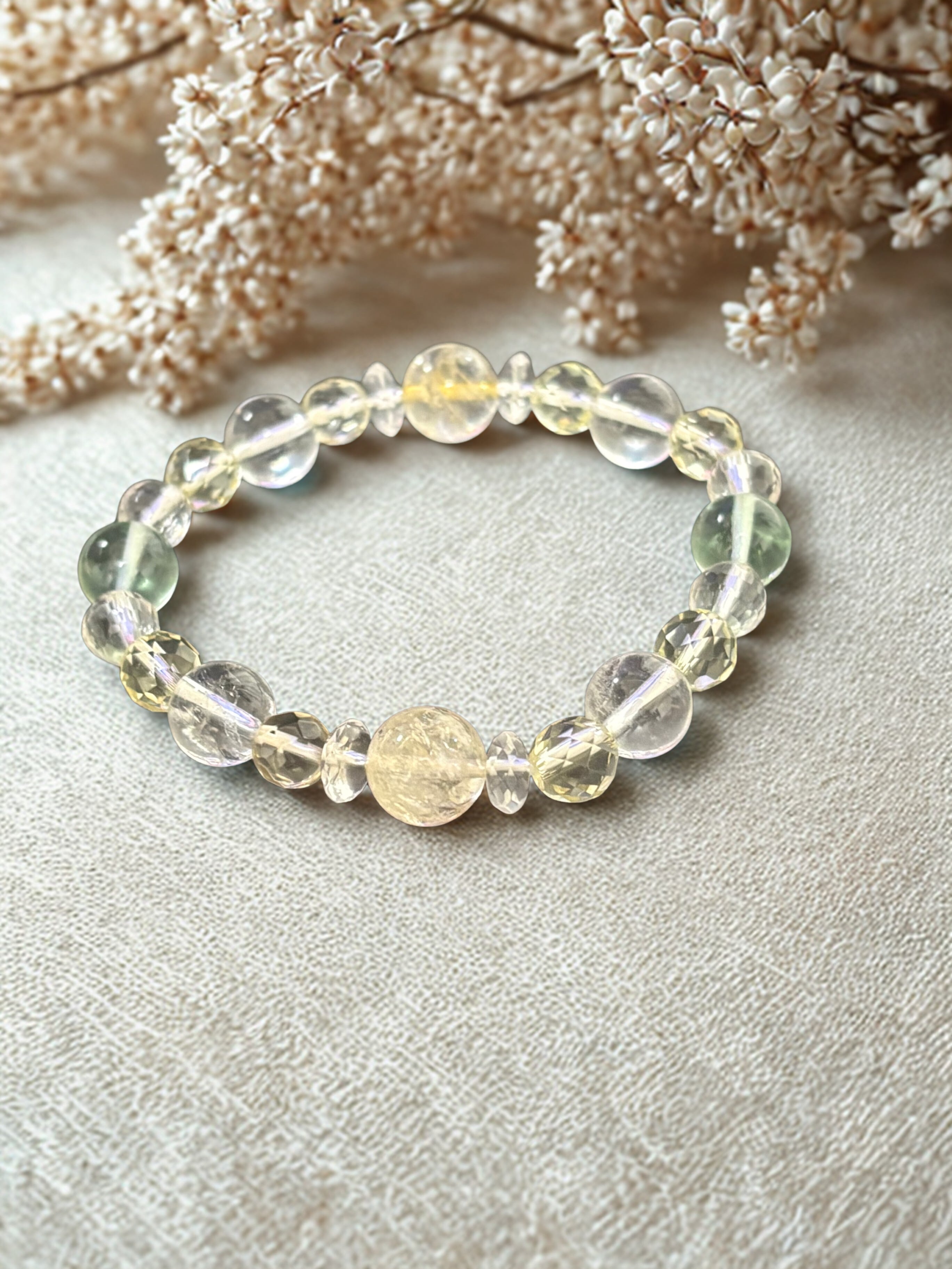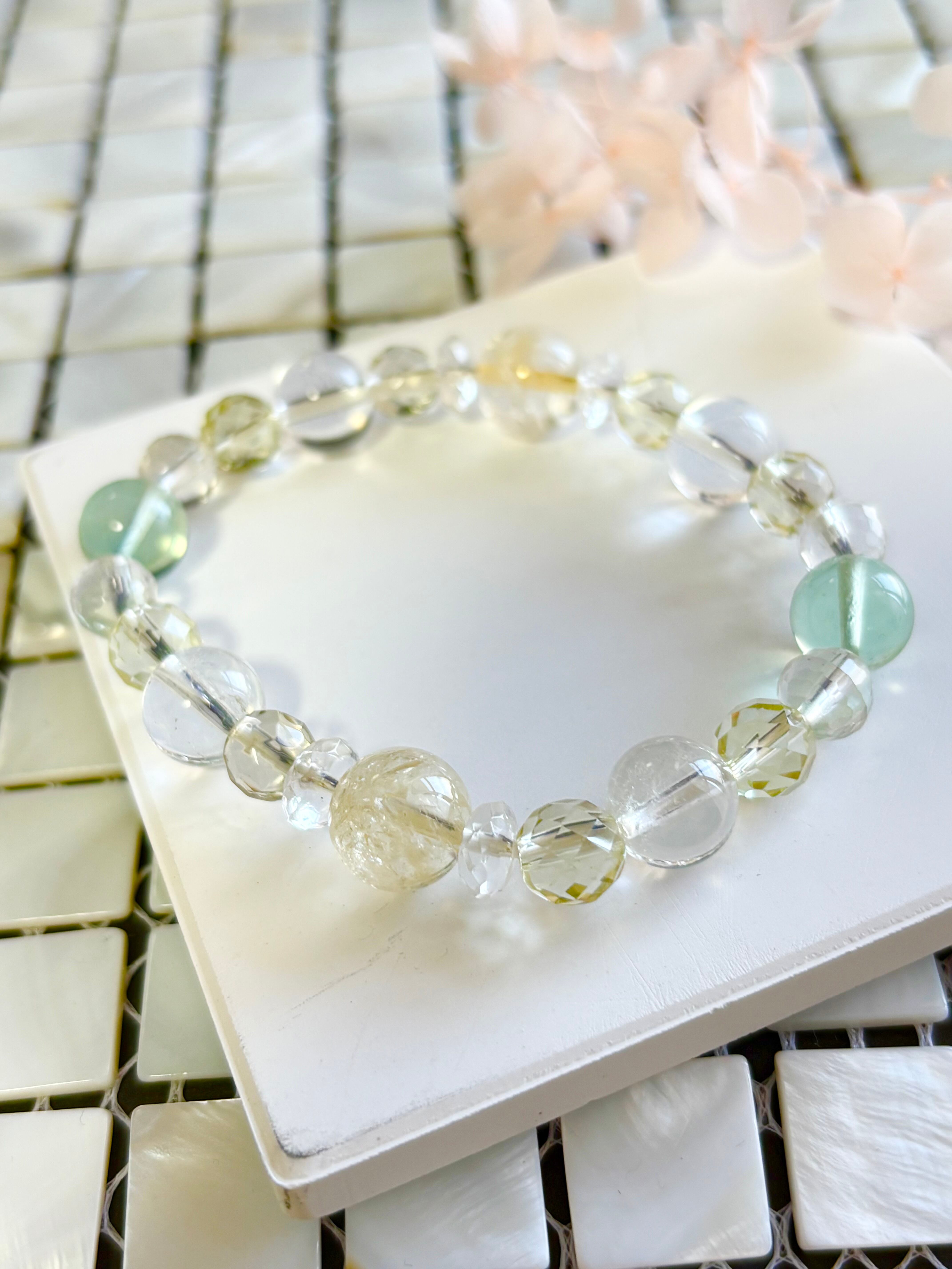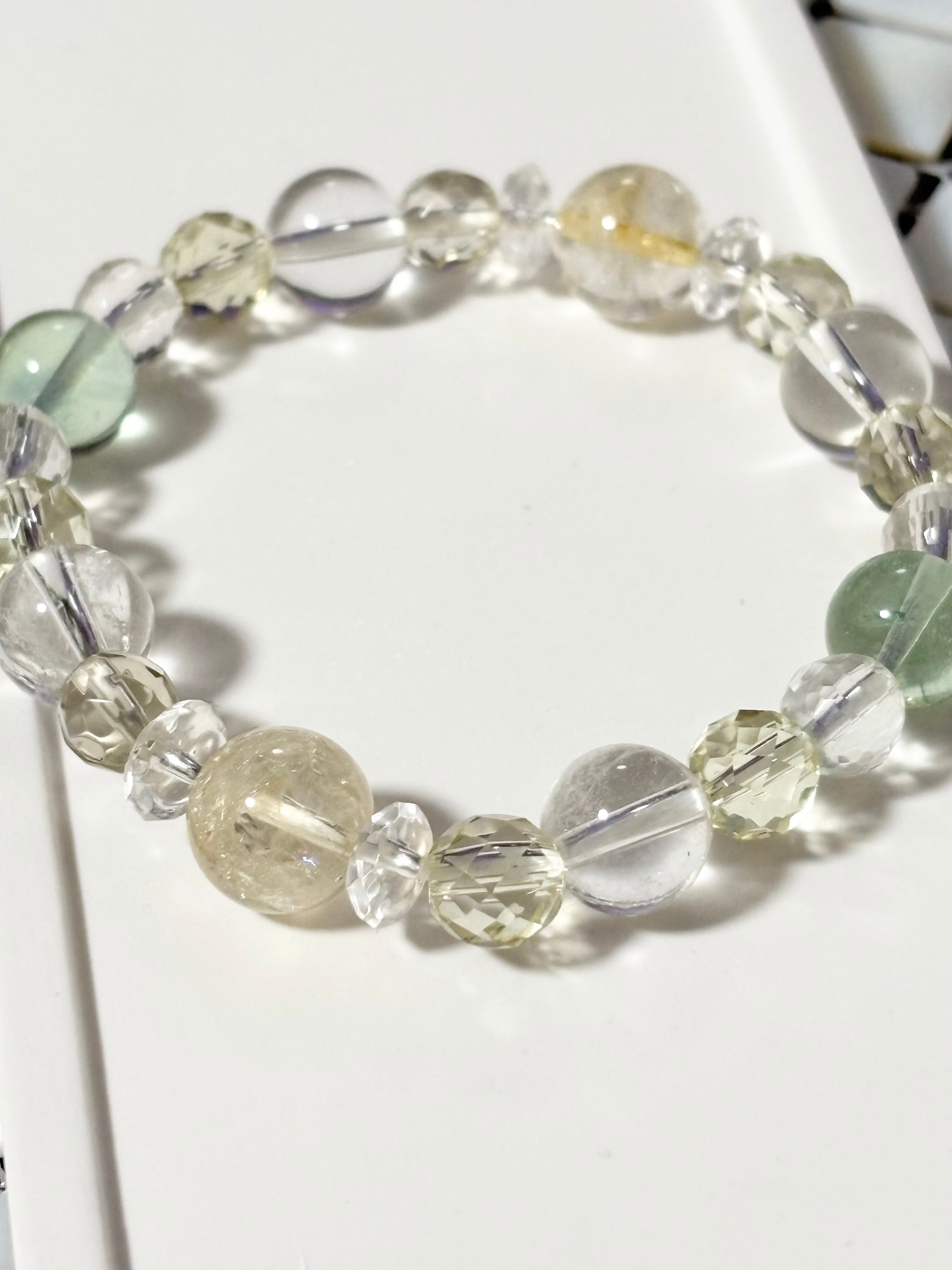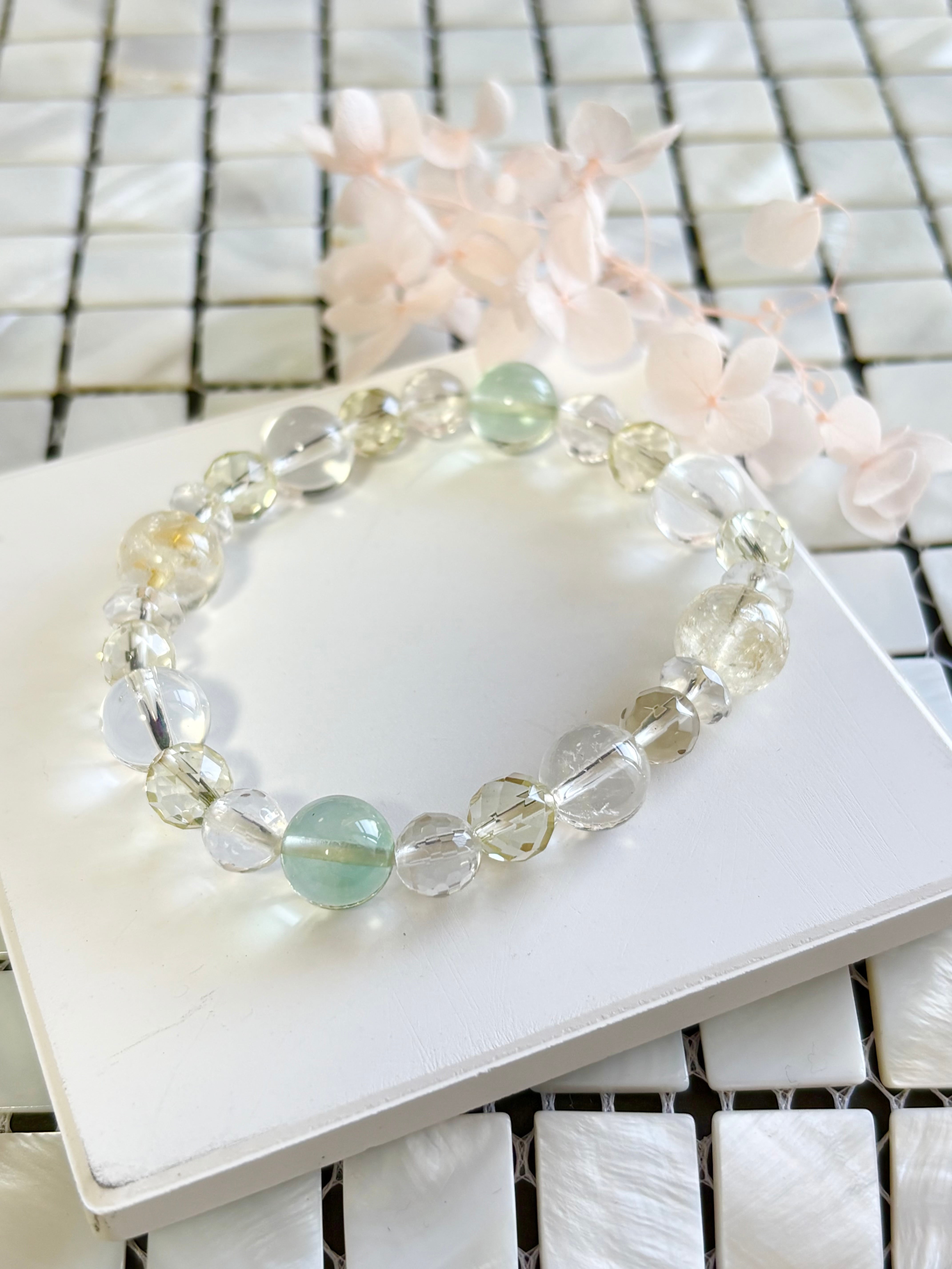 金運アップ,豊穣,幸運を呼ぶ石と呼ばれるシトリンを中心に,浄化,癒し,暗闇で光を灯してくれるフローライト,同じく癒し効果が高く幸福,明朗,壮健の石であるレモンクォーツを取り入れた爽やかなブレスレットです。クリエイターの方にも最適なブレスレットです。