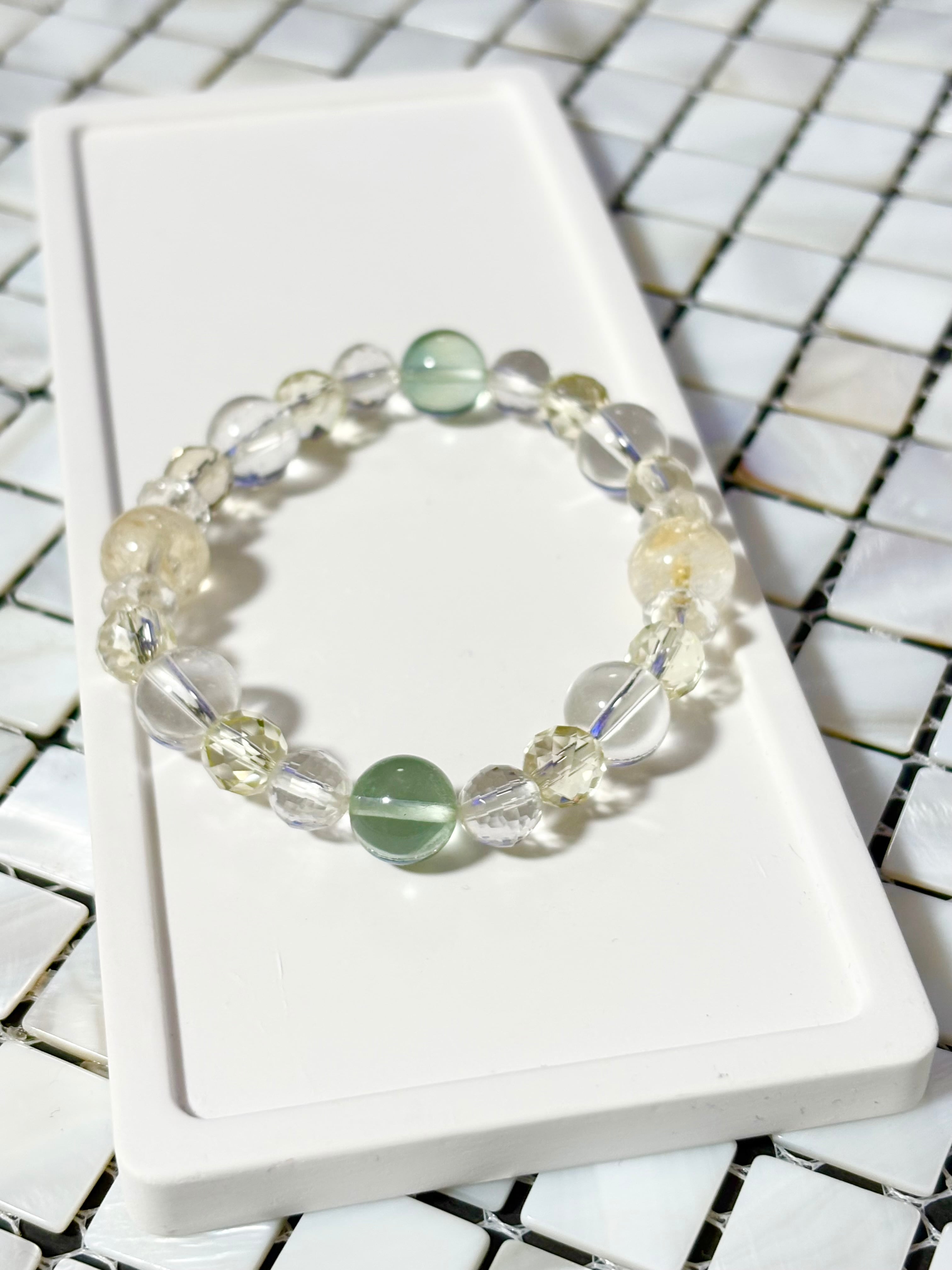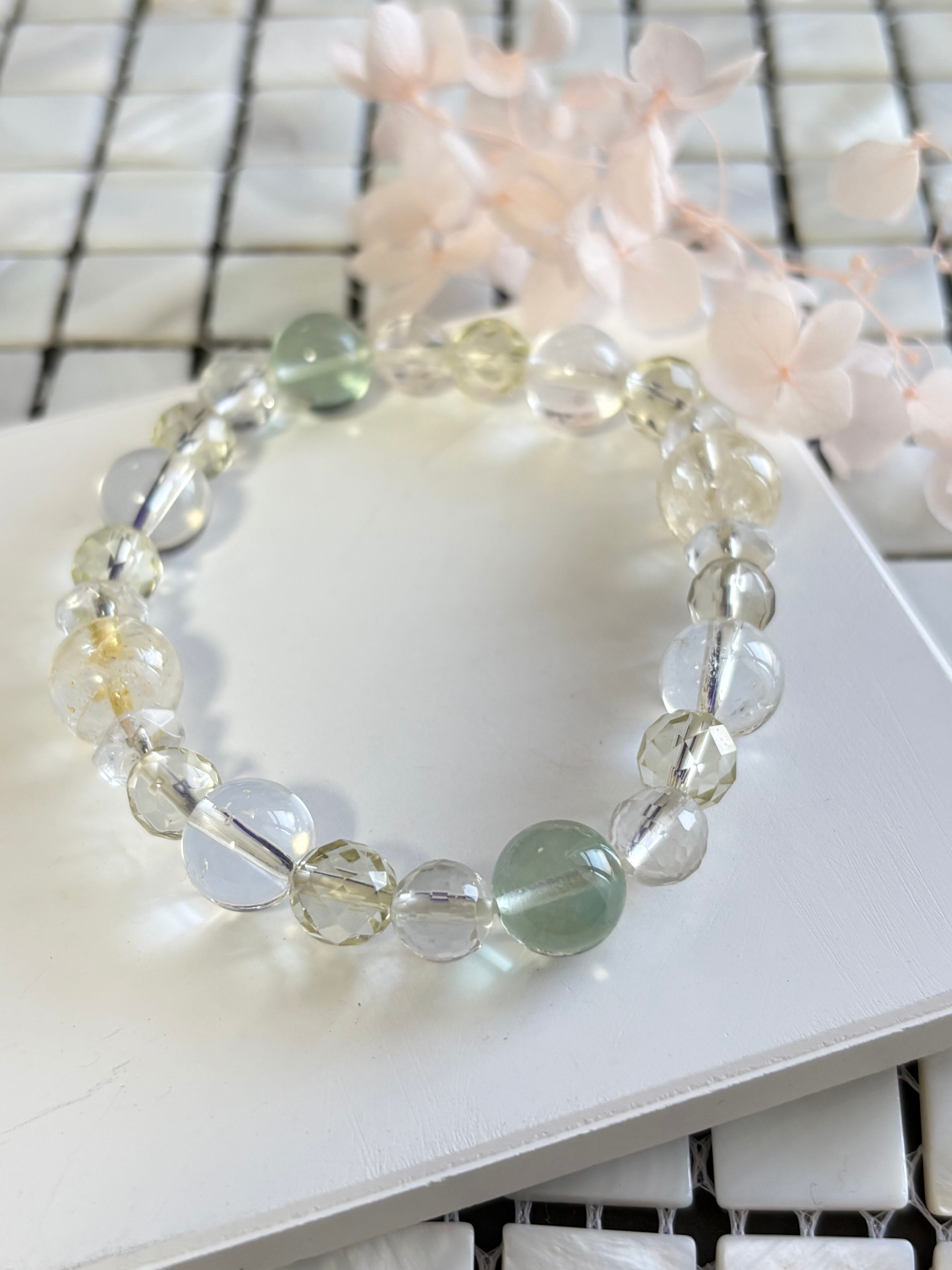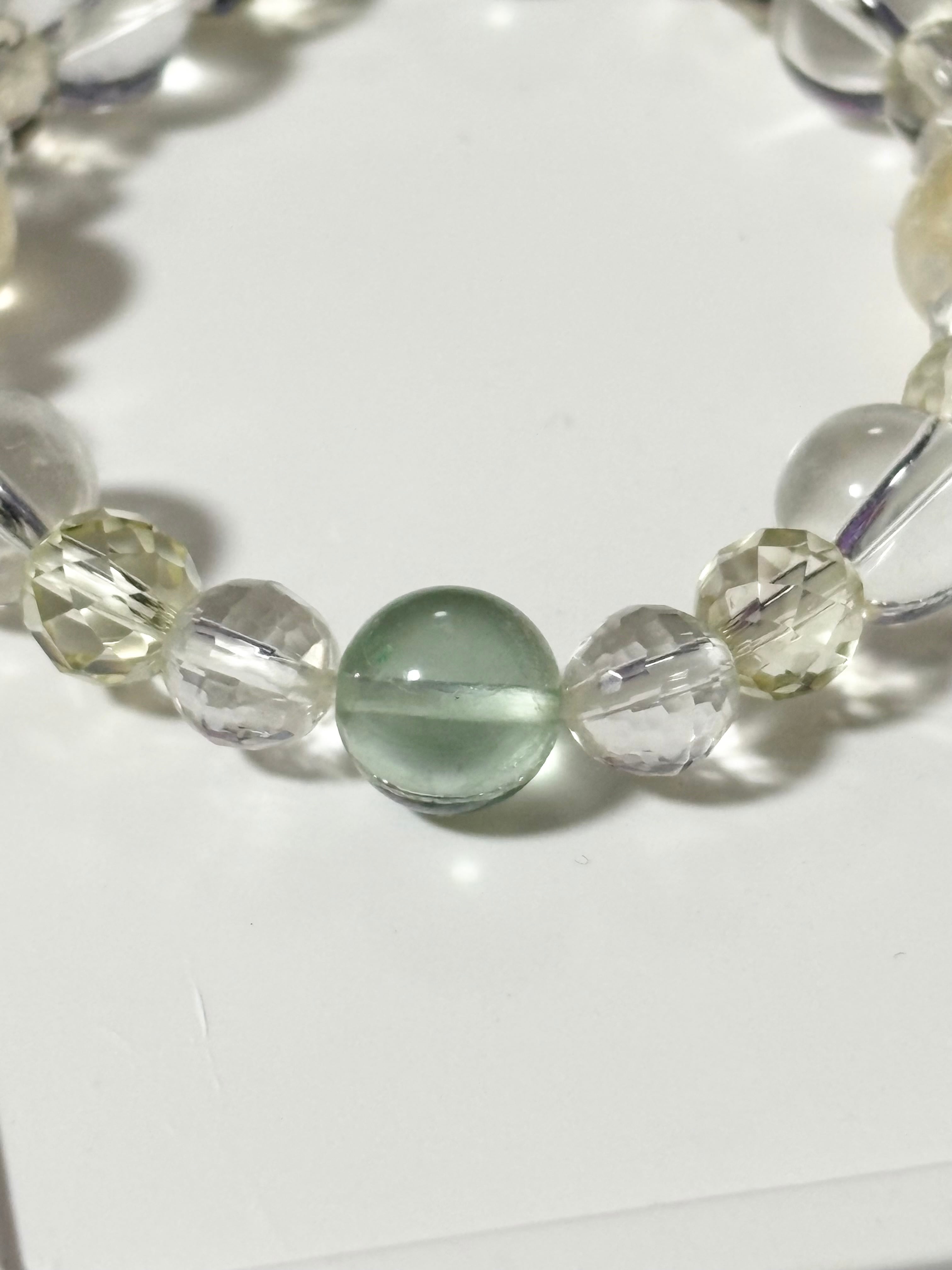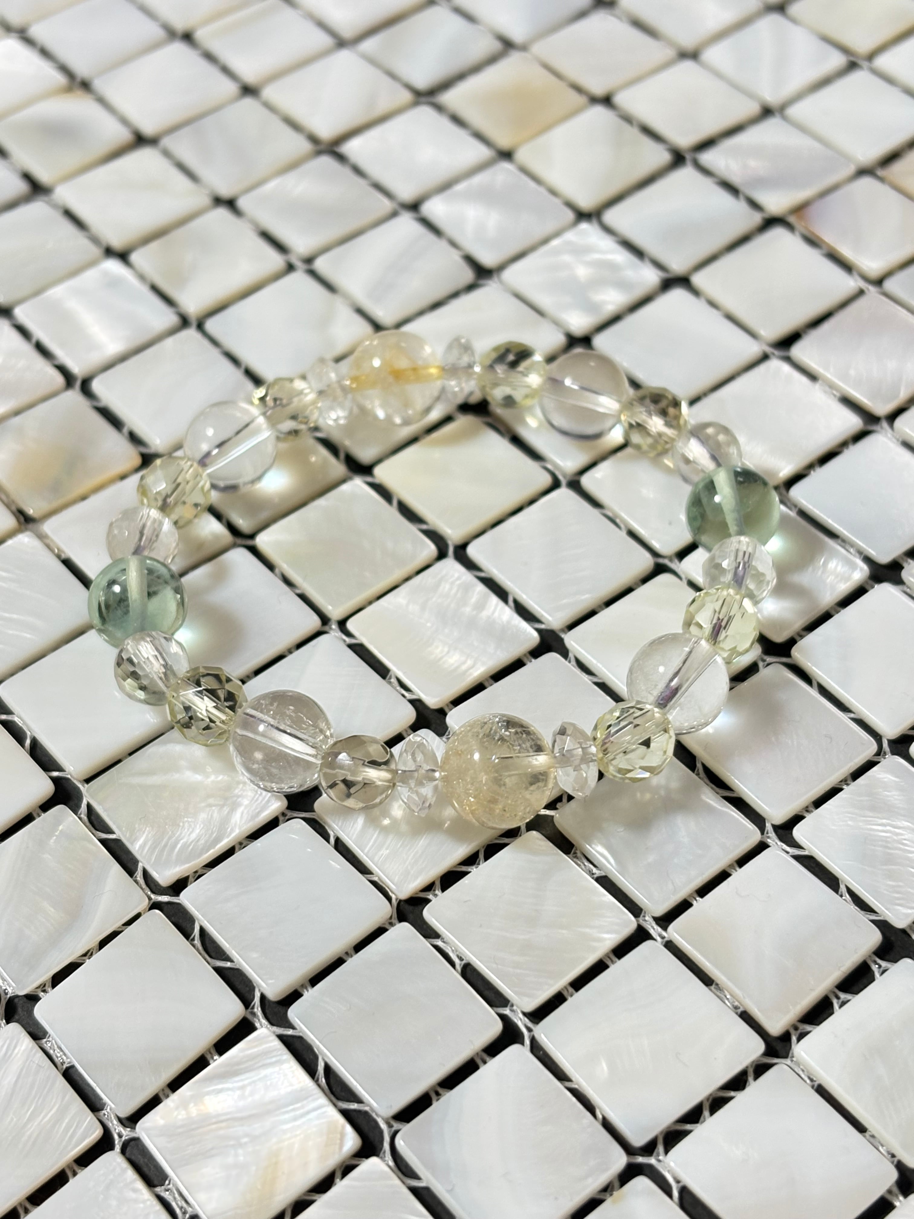 金運アップ,豊穣,幸運を呼ぶ石と呼ばれるシトリンを中心に,浄化,癒し,暗闇で光を灯してくれるフローライト,同じく癒し効果が高く幸福,明朗,壮健の石であるレモンクォーツを取り入れた爽やかなブレスレットです。クリエイターの方にも最適なブレスレットです。