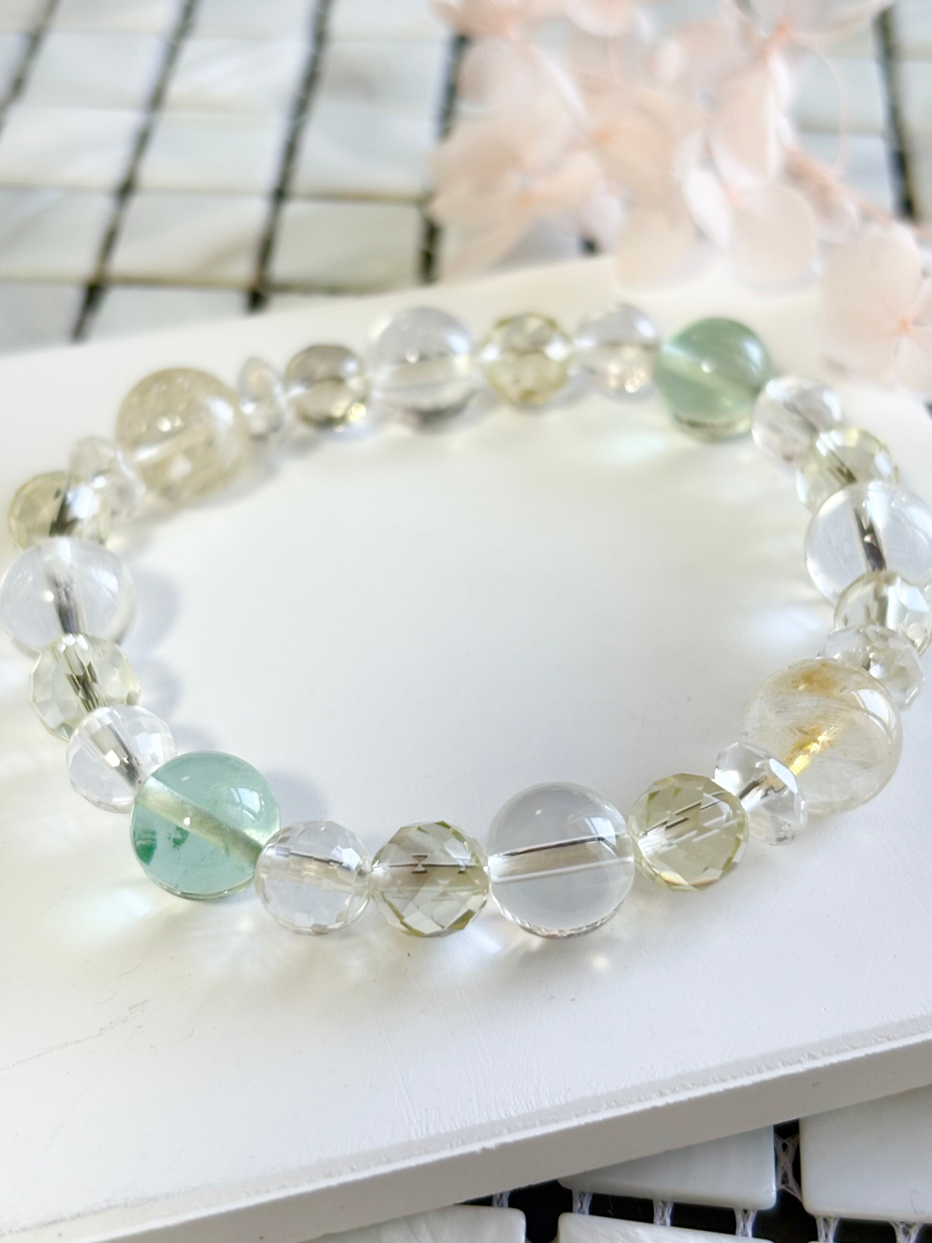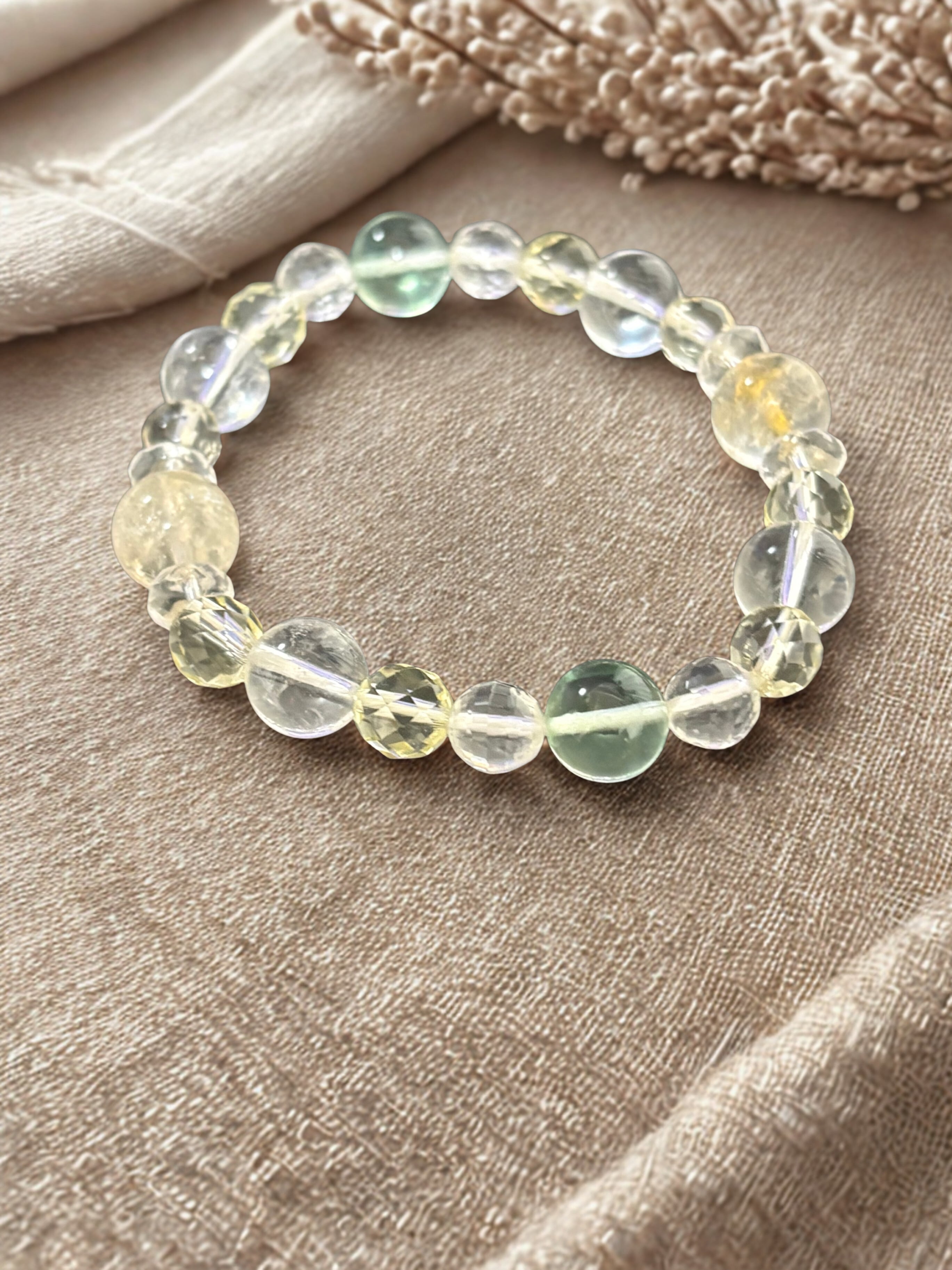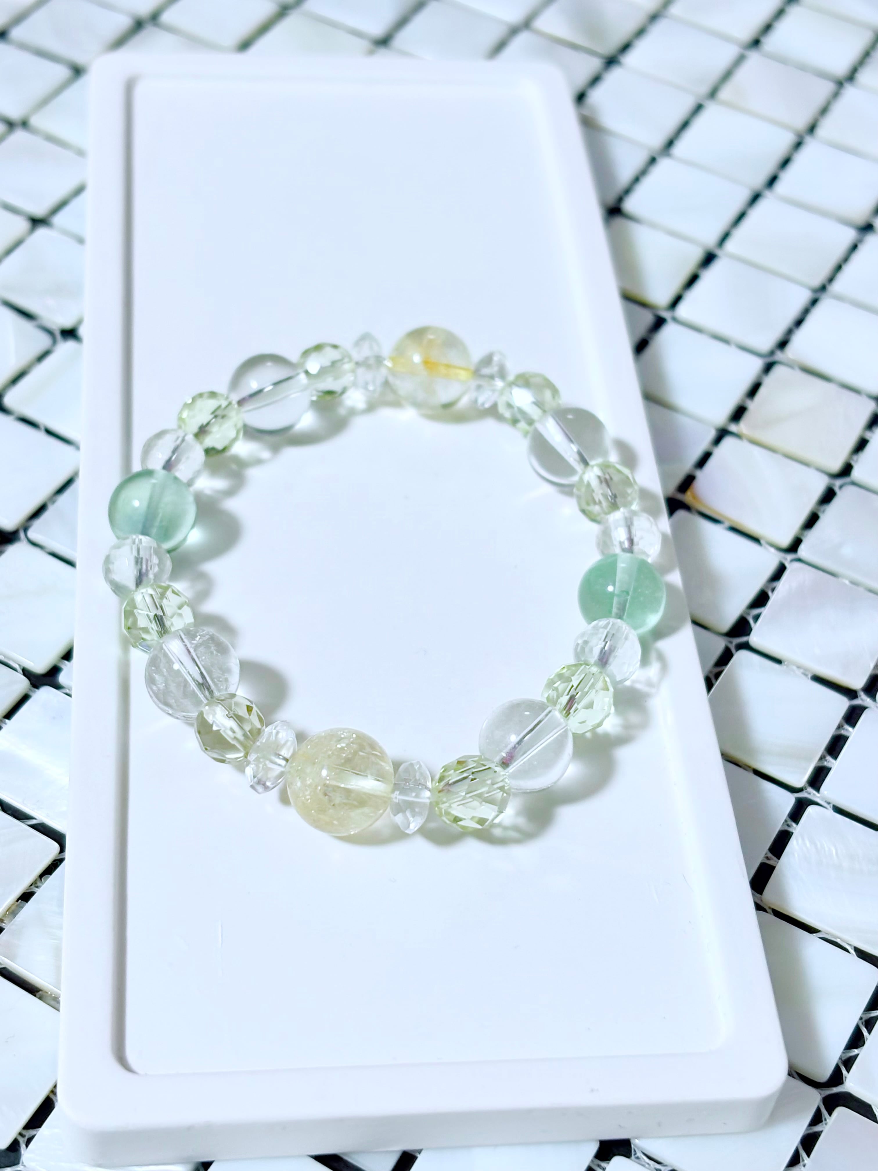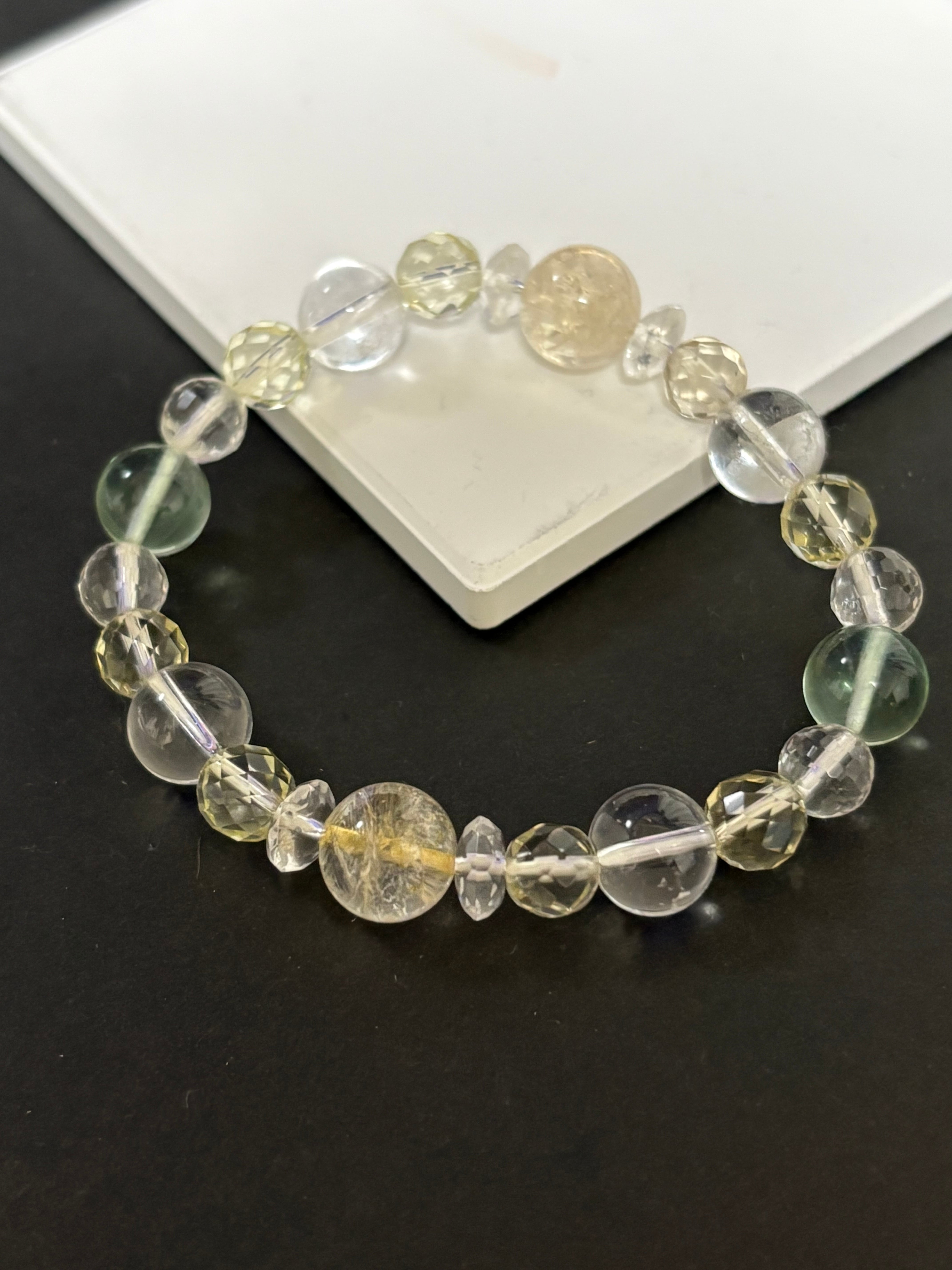 金運アップ,豊穣,幸運を呼ぶ石と呼ばれるシトリンを中心に,浄化,癒し,暗闇で光を灯してくれるフローライト,同じく癒し効果が高く幸福,明朗,壮健の石であるレモンクォーツを取り入れた爽やかなブレスレットです。クリエイターの方にも最適なブレスレットです。