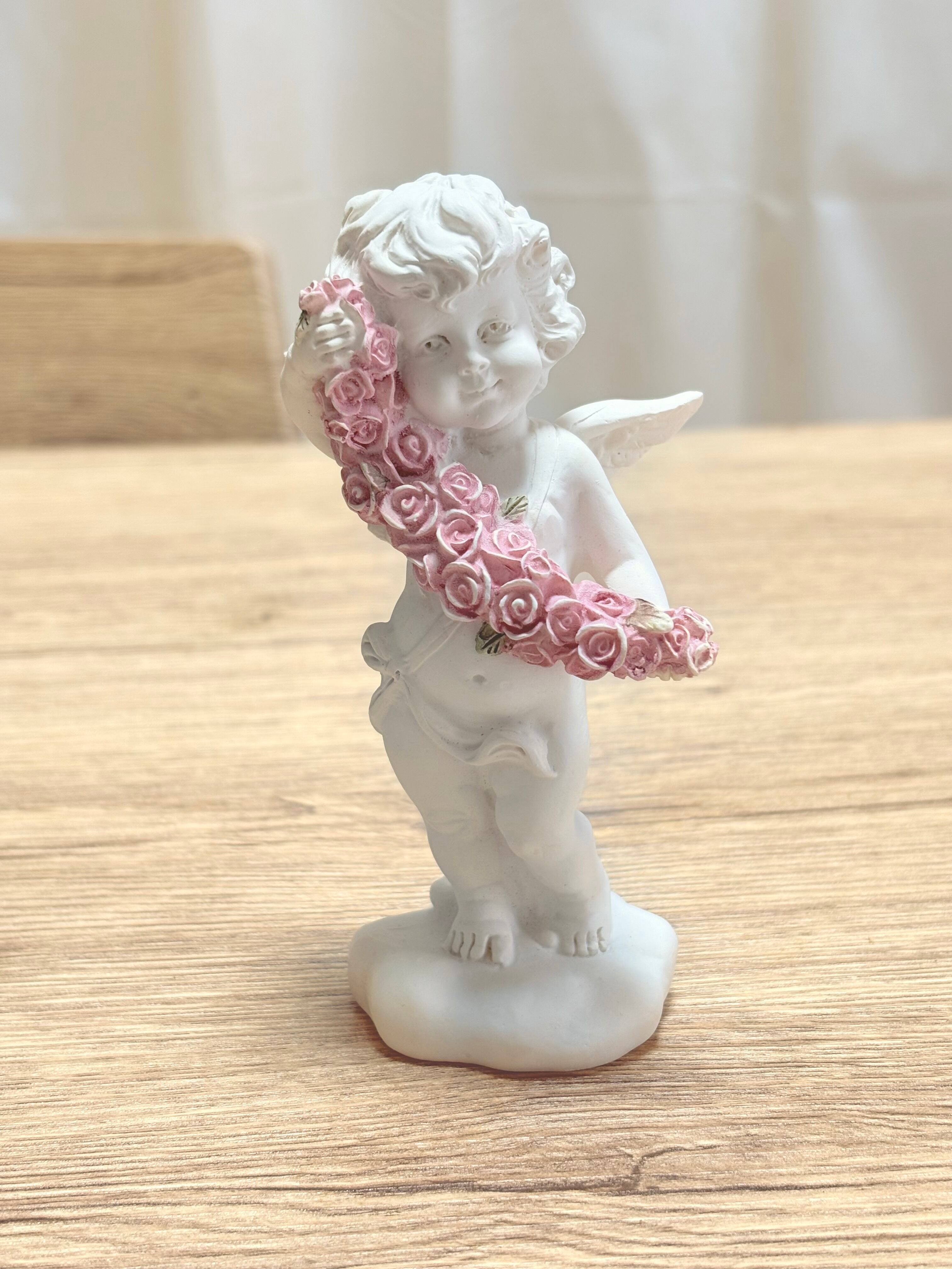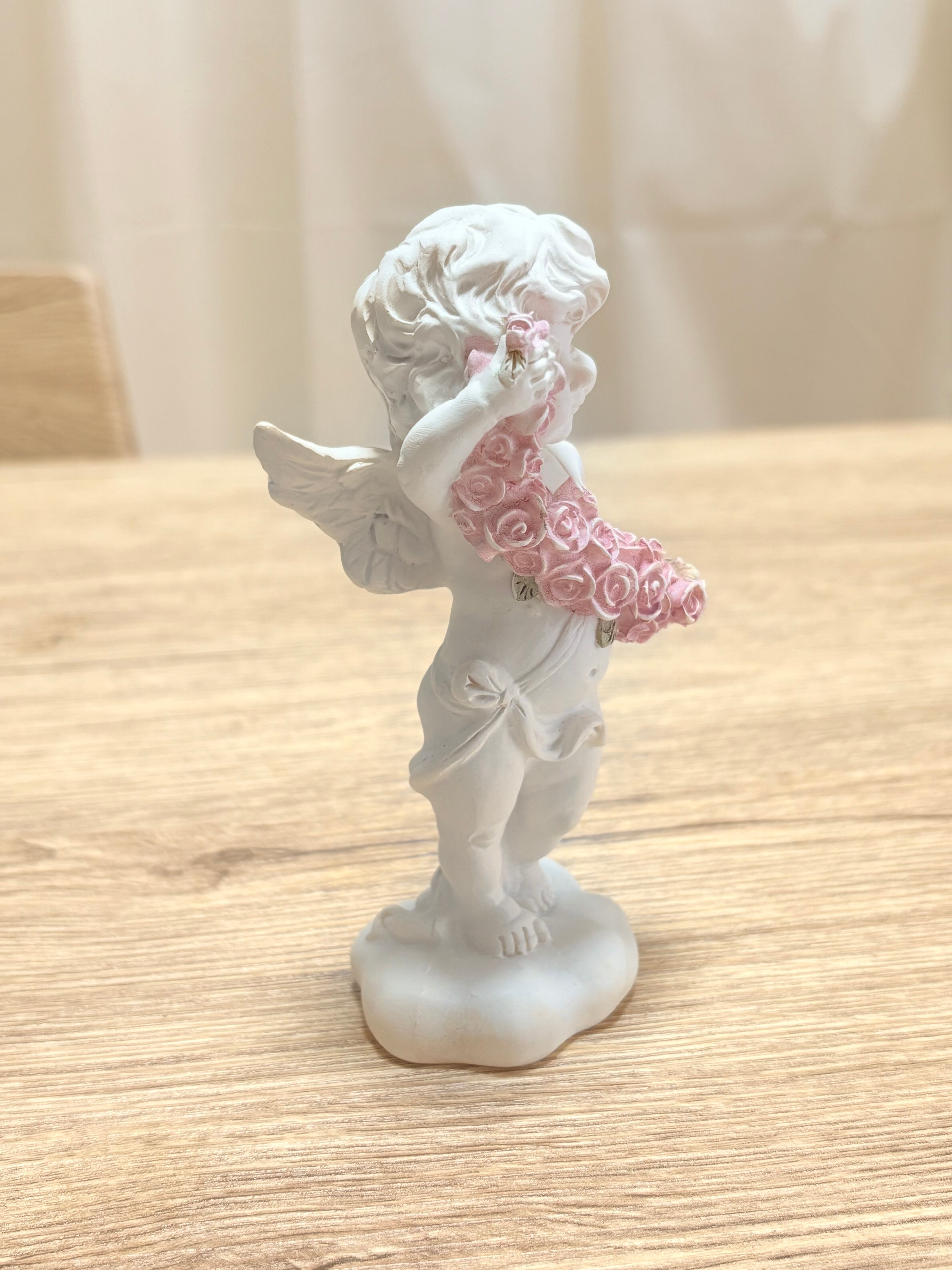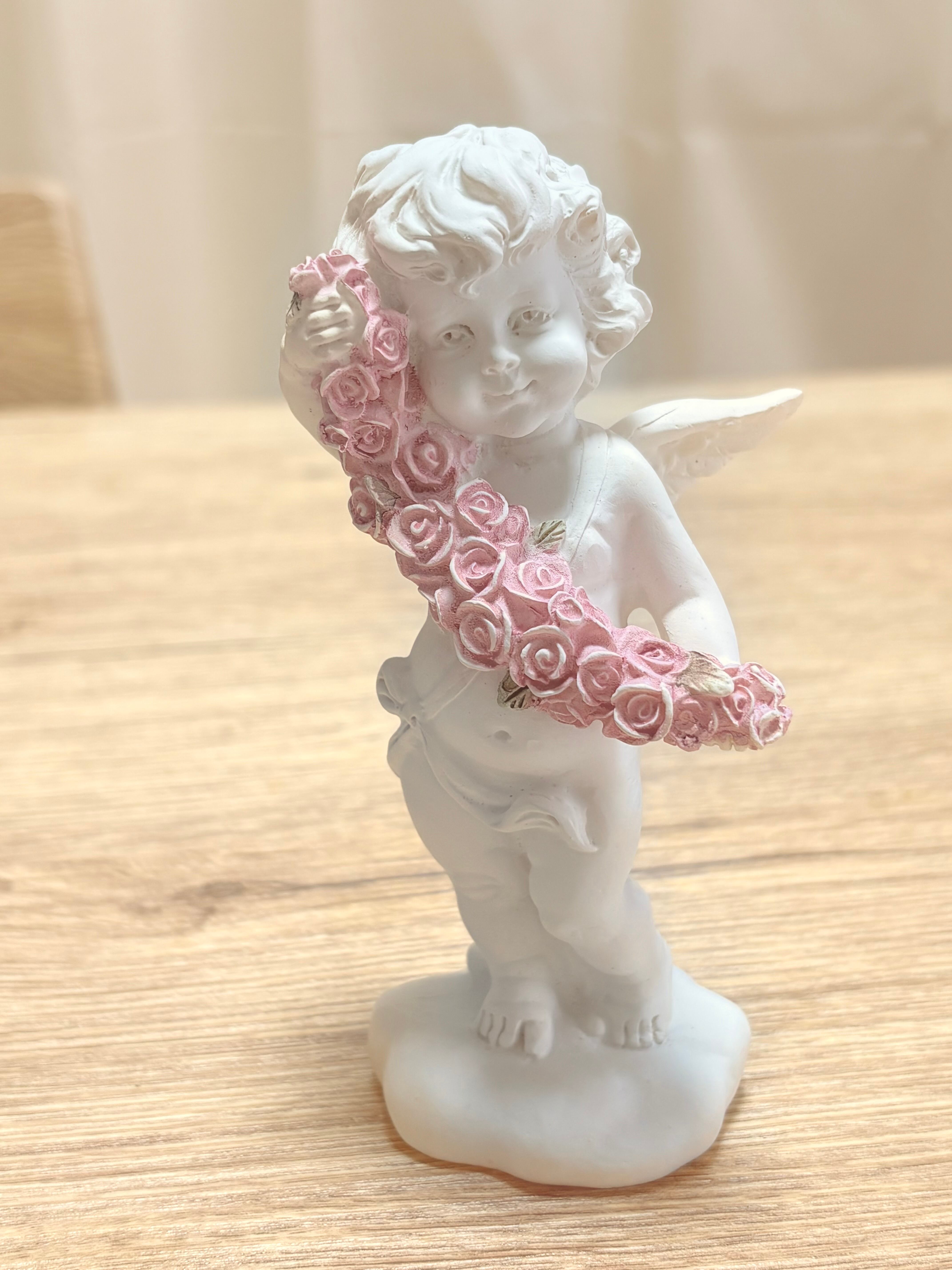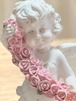 可愛い お月さま型のローズを持つ天使です。天使の笑顔が可愛らしくローズのピンクがパッとお部屋を華やかにしてくれます。
