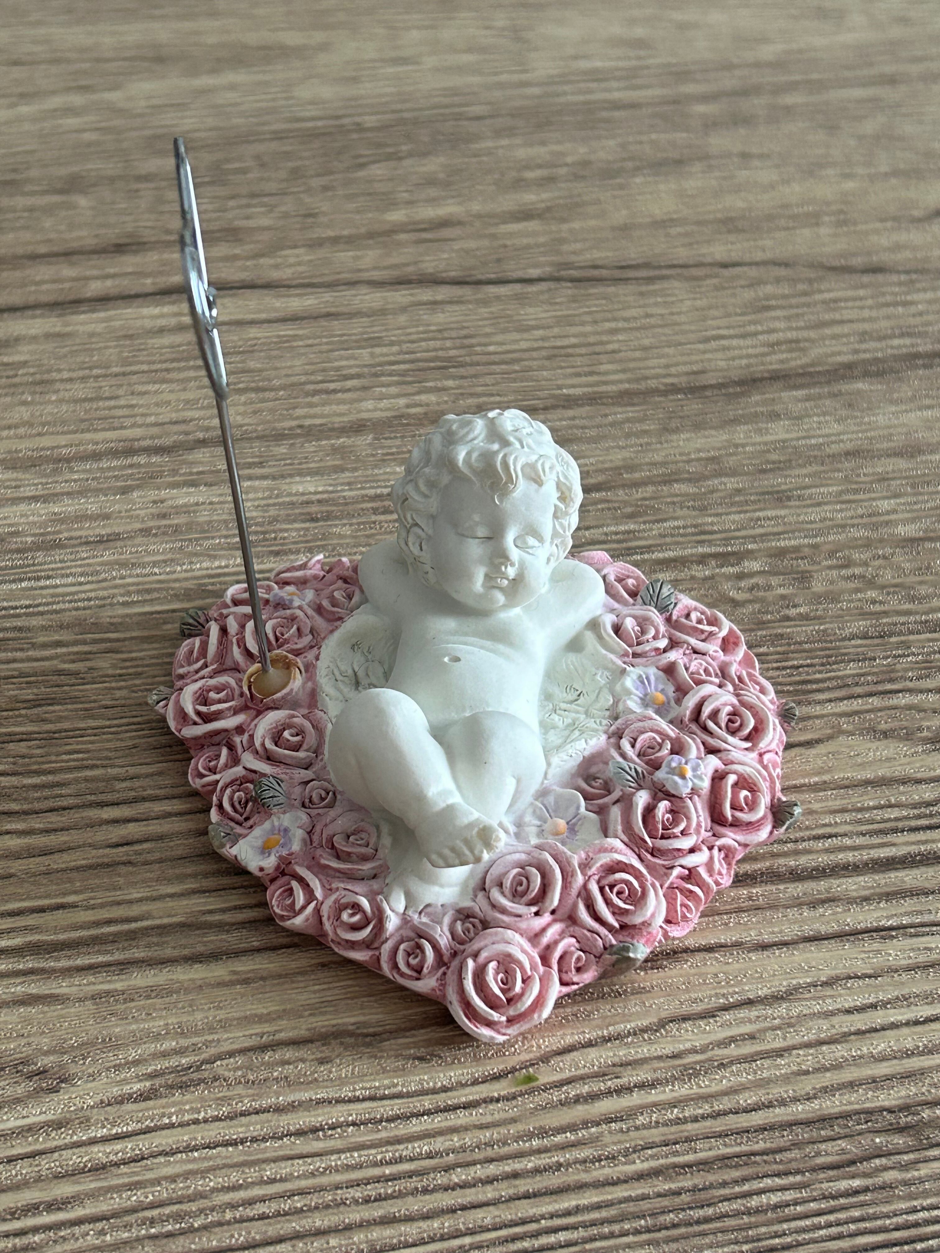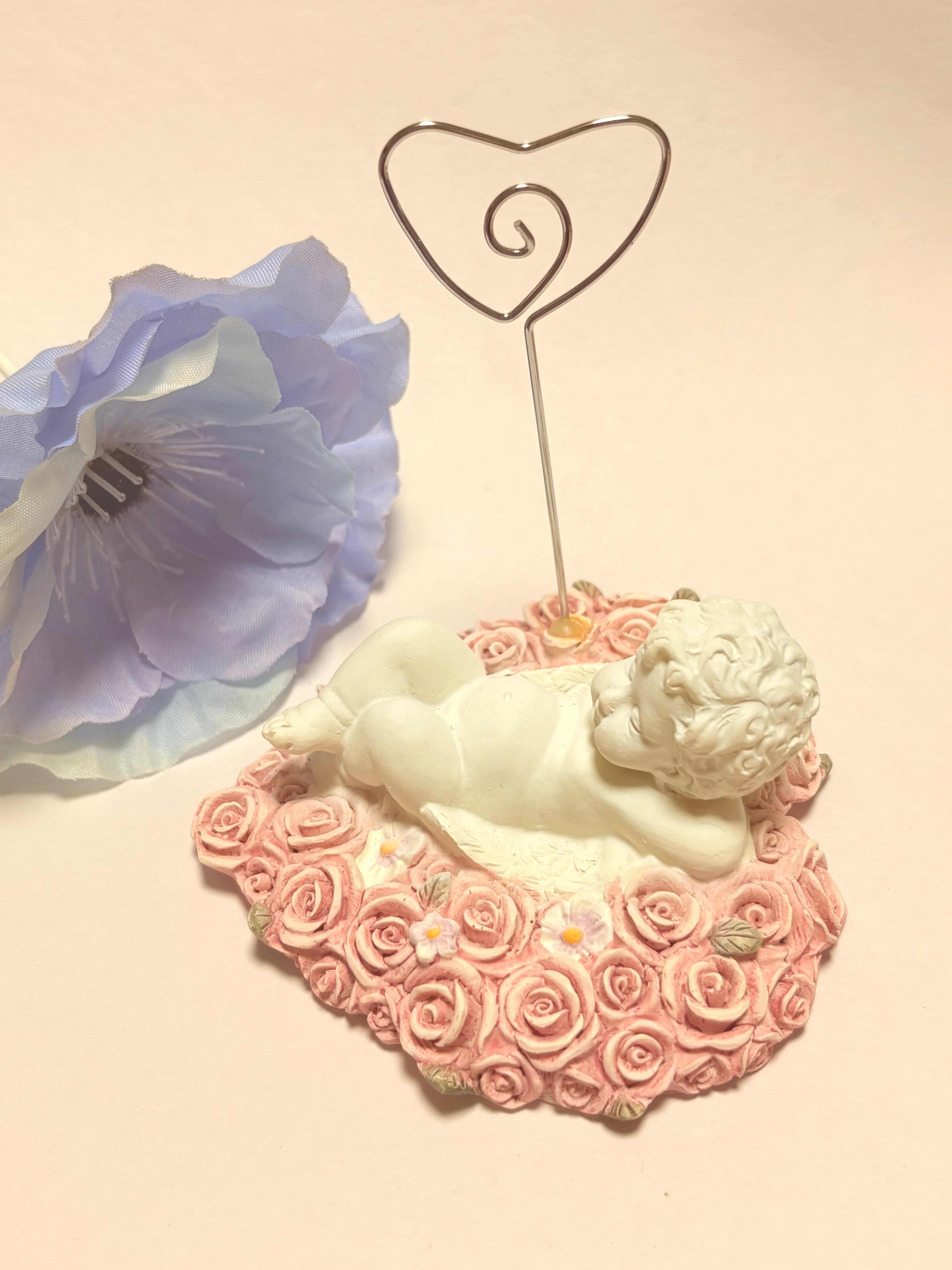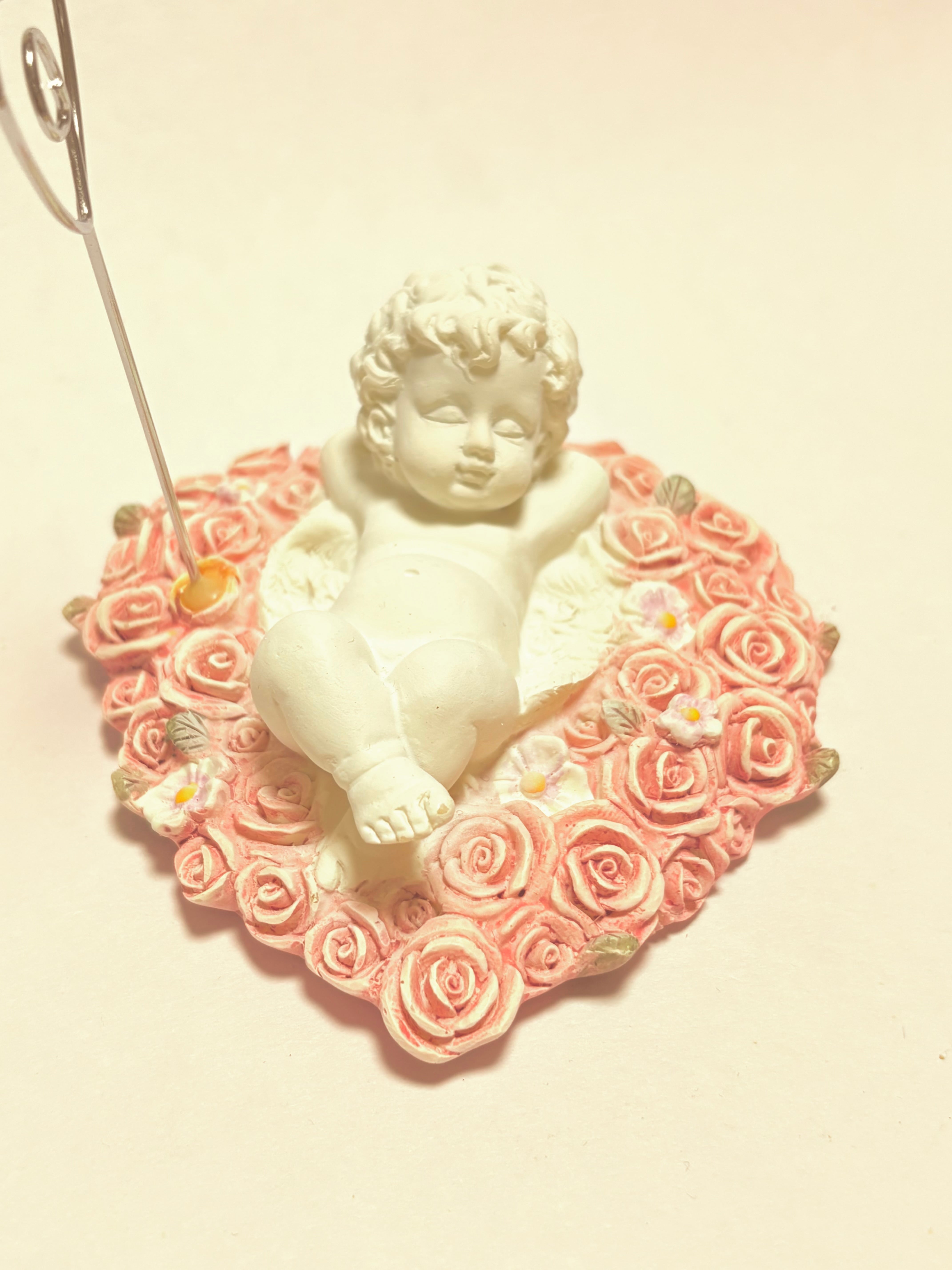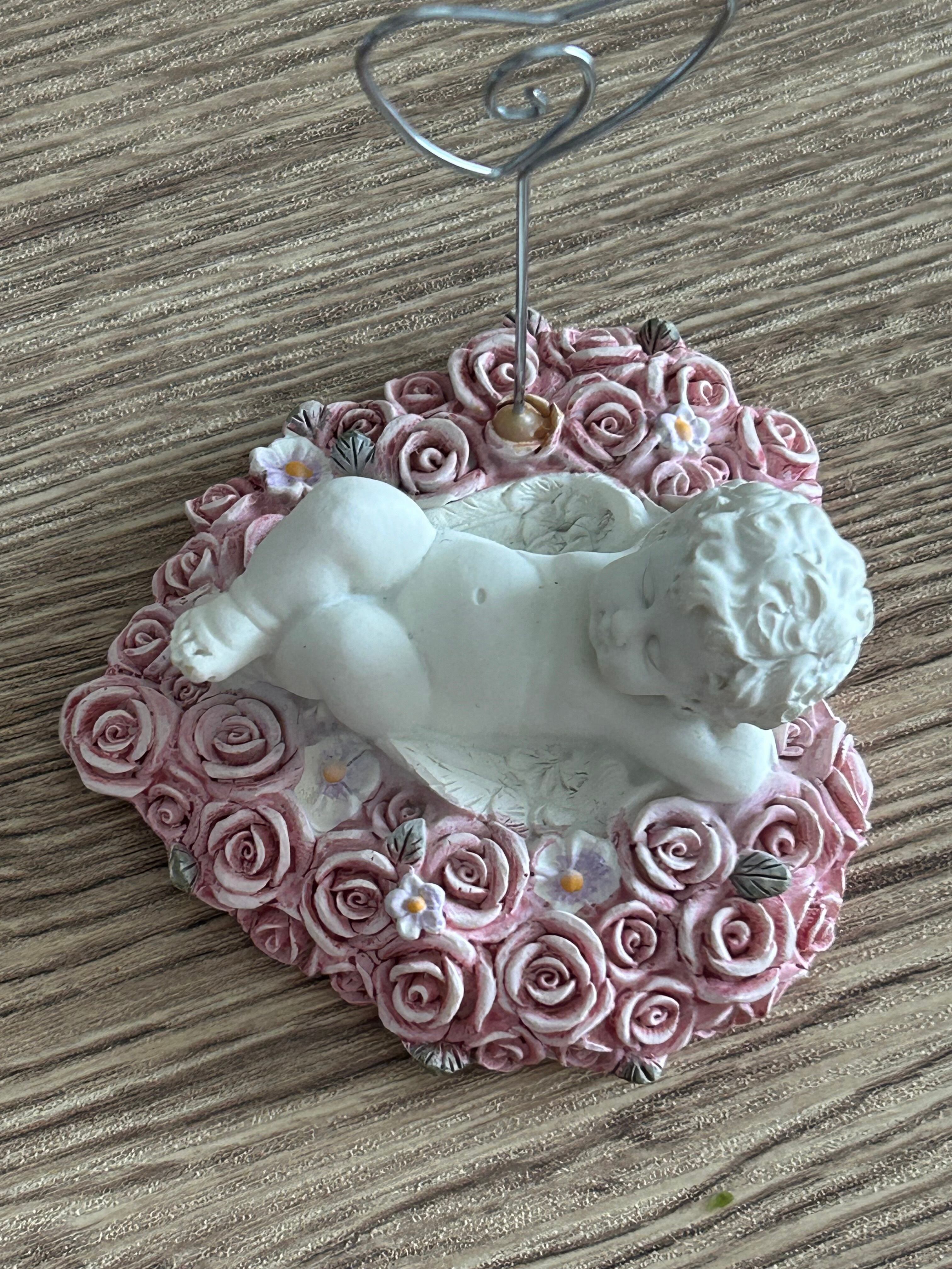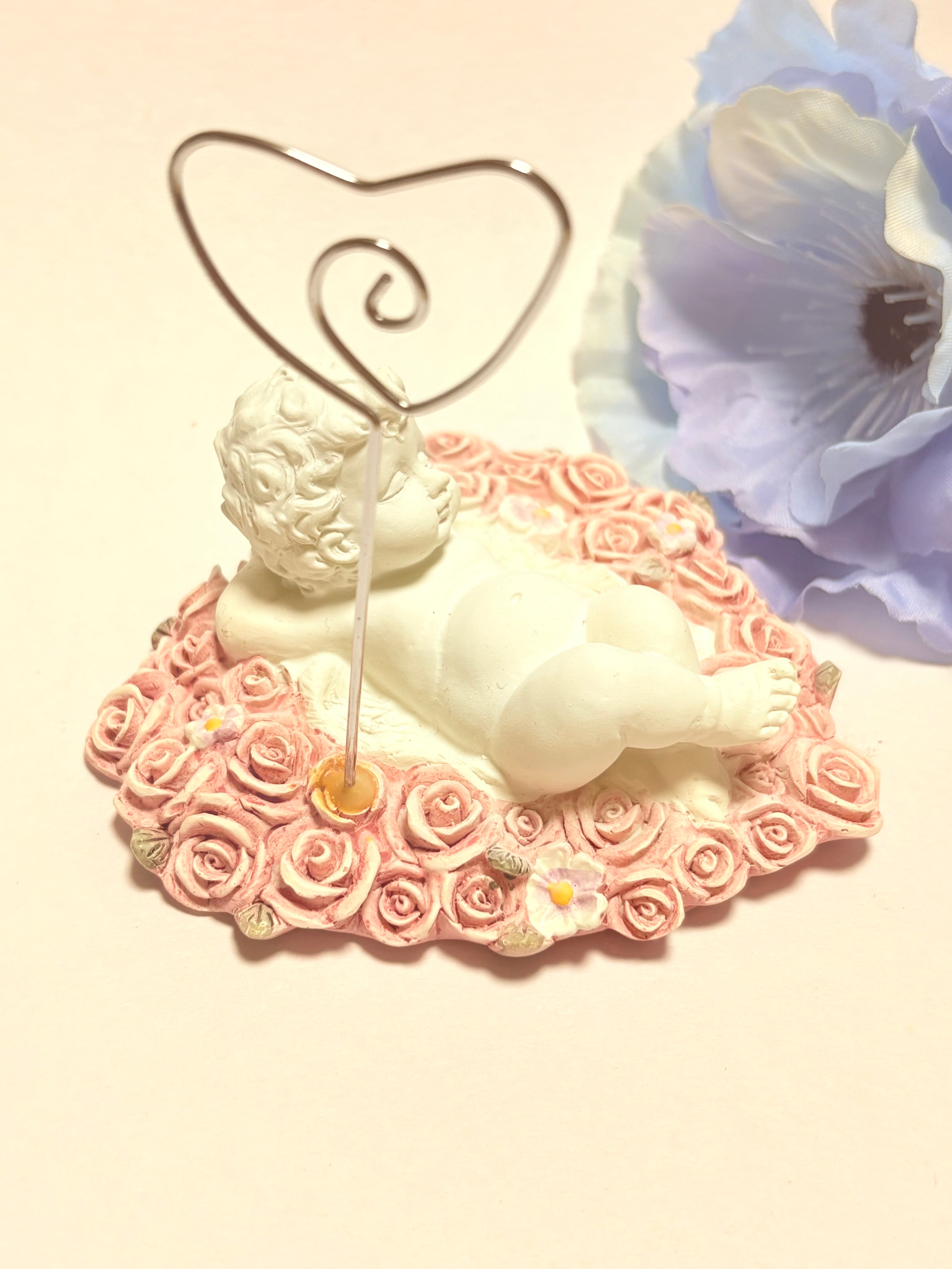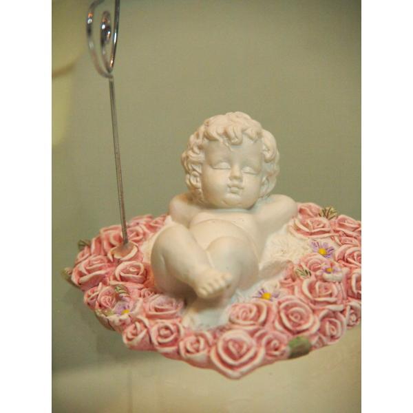 約90mm×90mm 可愛いピンクのハートのローズの上に 幸せそうに眠る天使のメモクリップです。 これに大事なメモを挟んでおくと もう大事なことを忘れませんね(*^_^*) 出来るだけ忠実に商品のイメージをお伝えしようと心がけて おりますが、実際の商品とは色、イメージが異なる場合がありますので ご了承下さい。