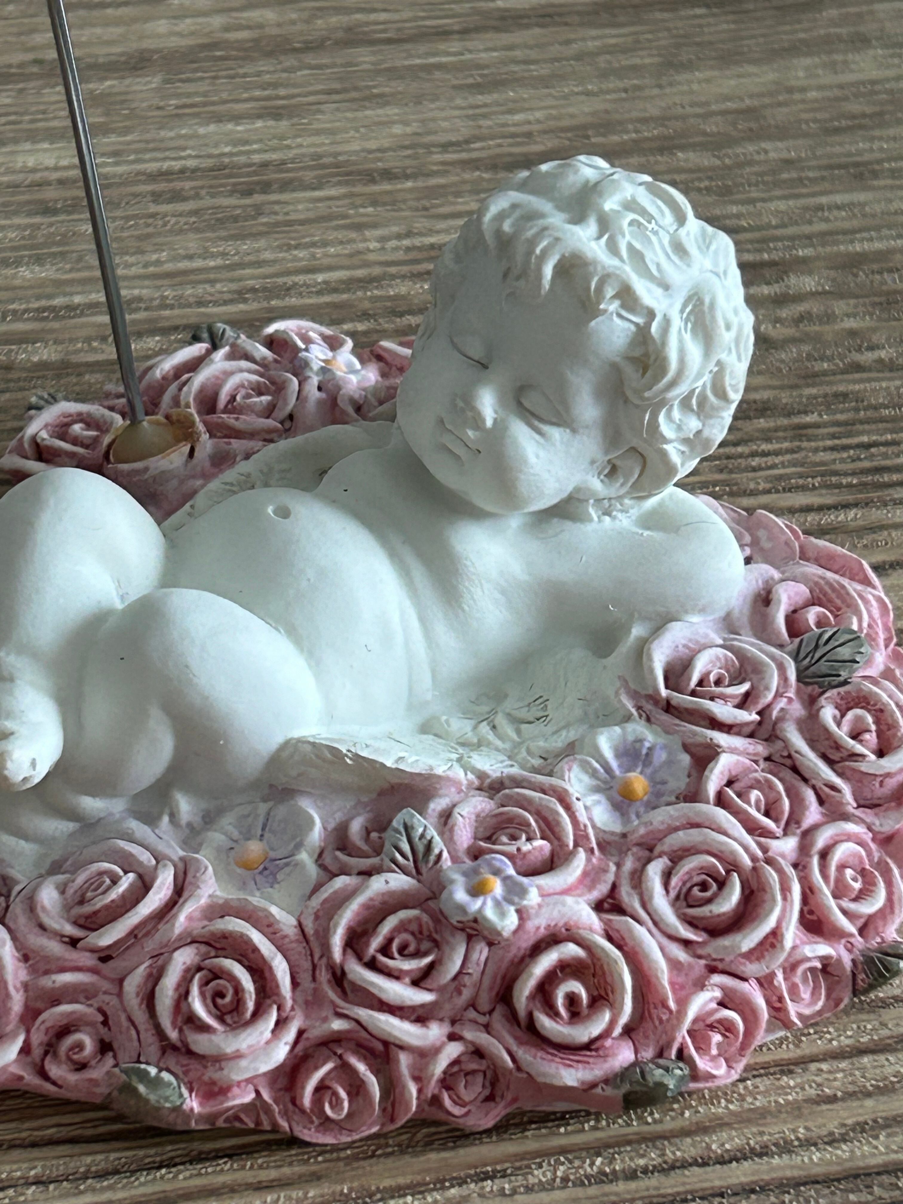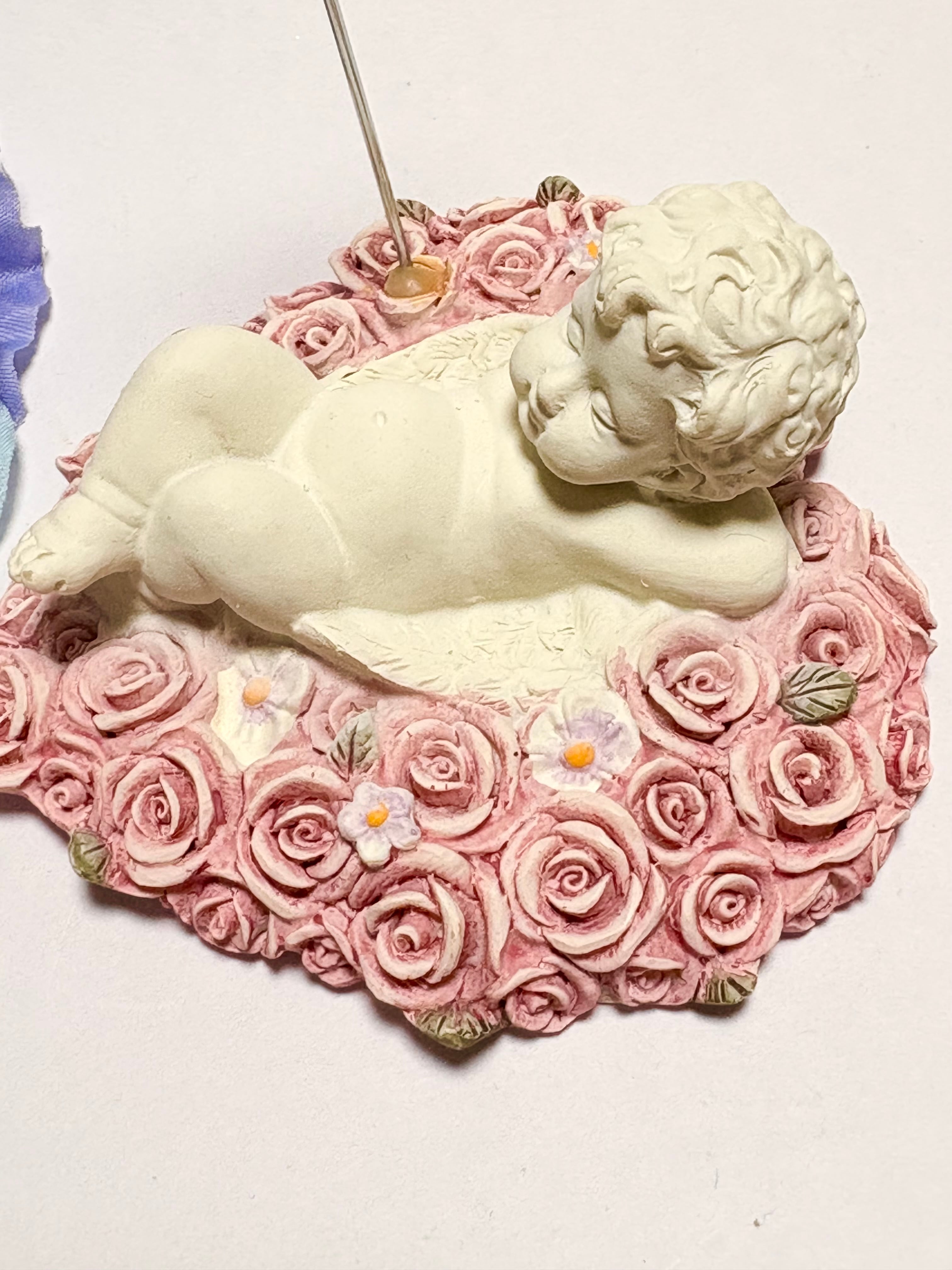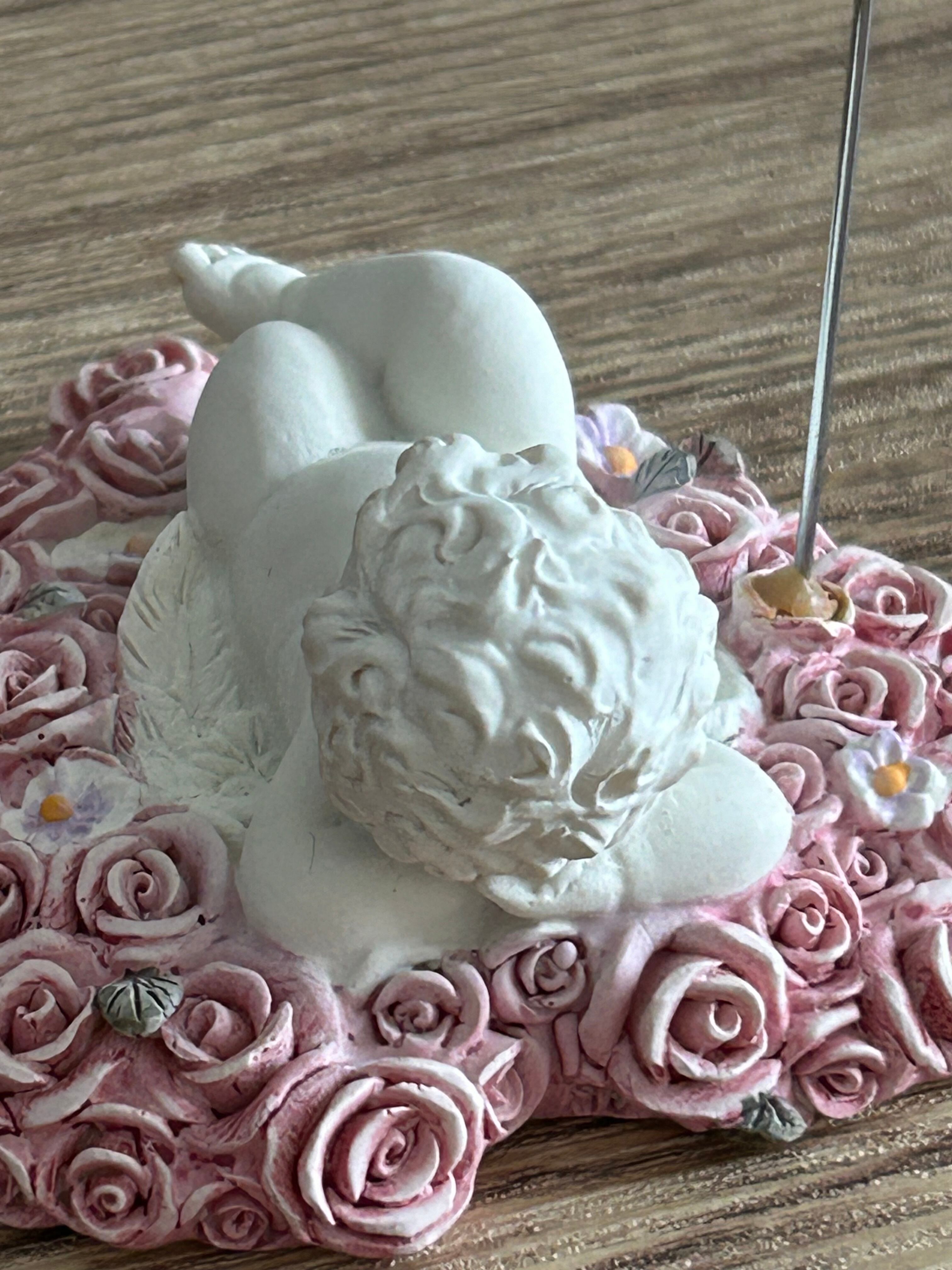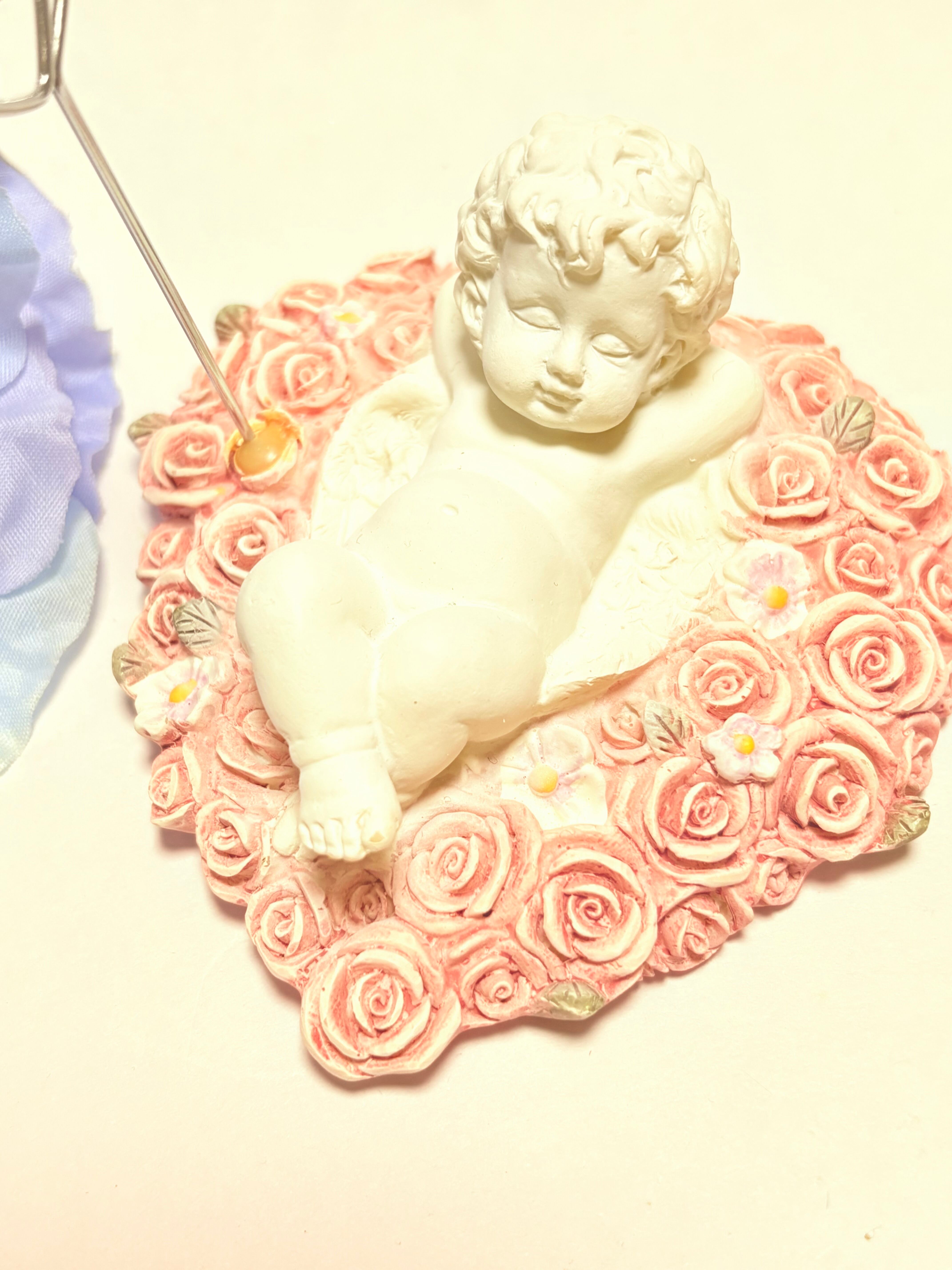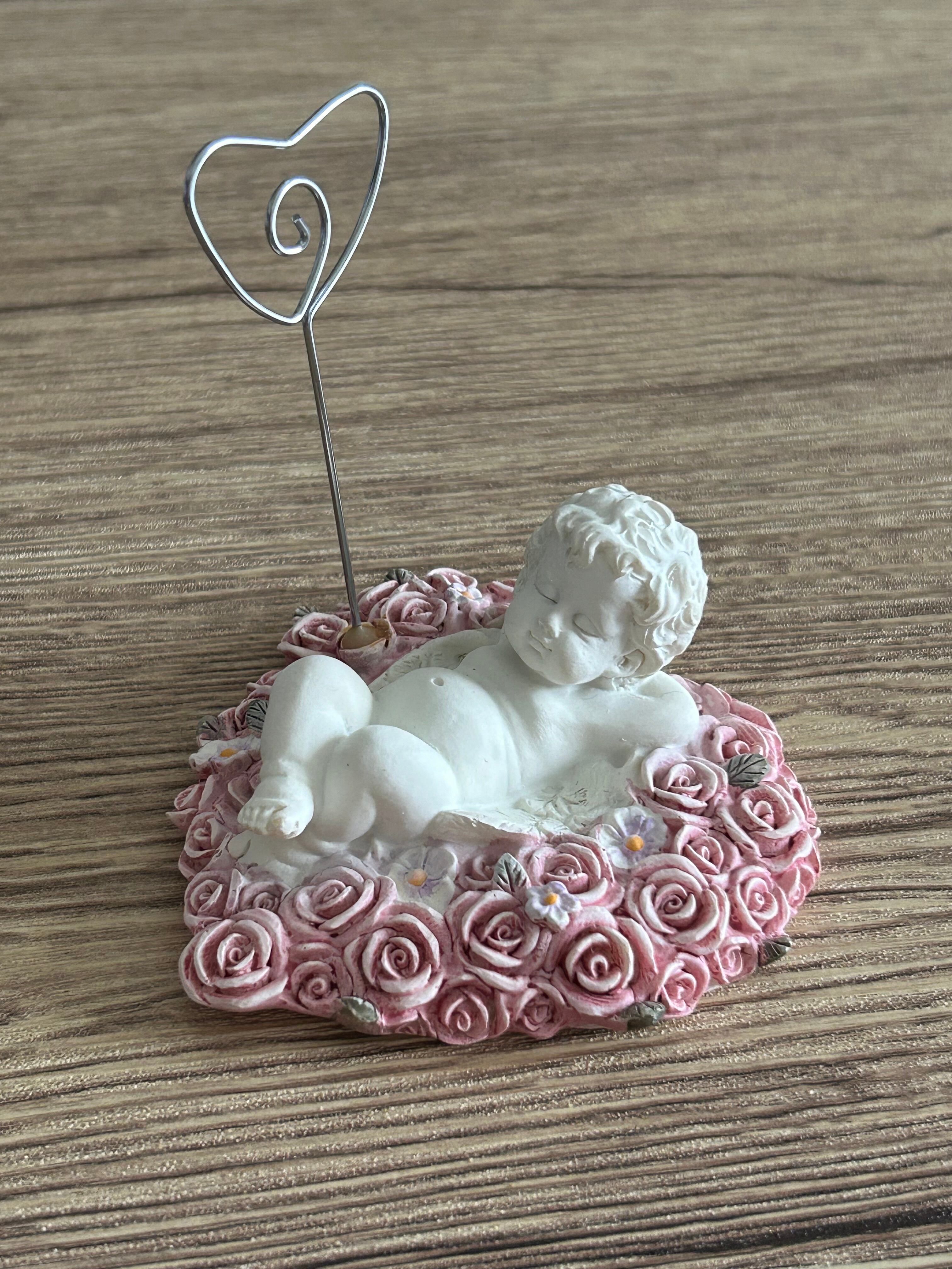 約90mm×90mm 可愛いピンクのハートのローズの上に 幸せそうに眠る天使のメモクリップです。 これに大事なメモを挟んでおくと もう大事なことを忘れませんね(*^_^*) 出来るだけ忠実に商品のイメージをお伝えしようと心がけて おりますが、実際の商品とは色、イメージが異なる場合がありますので ご了承下さい。