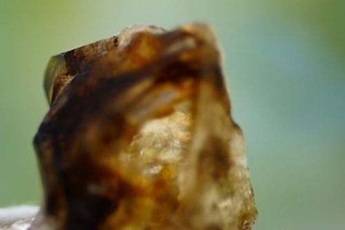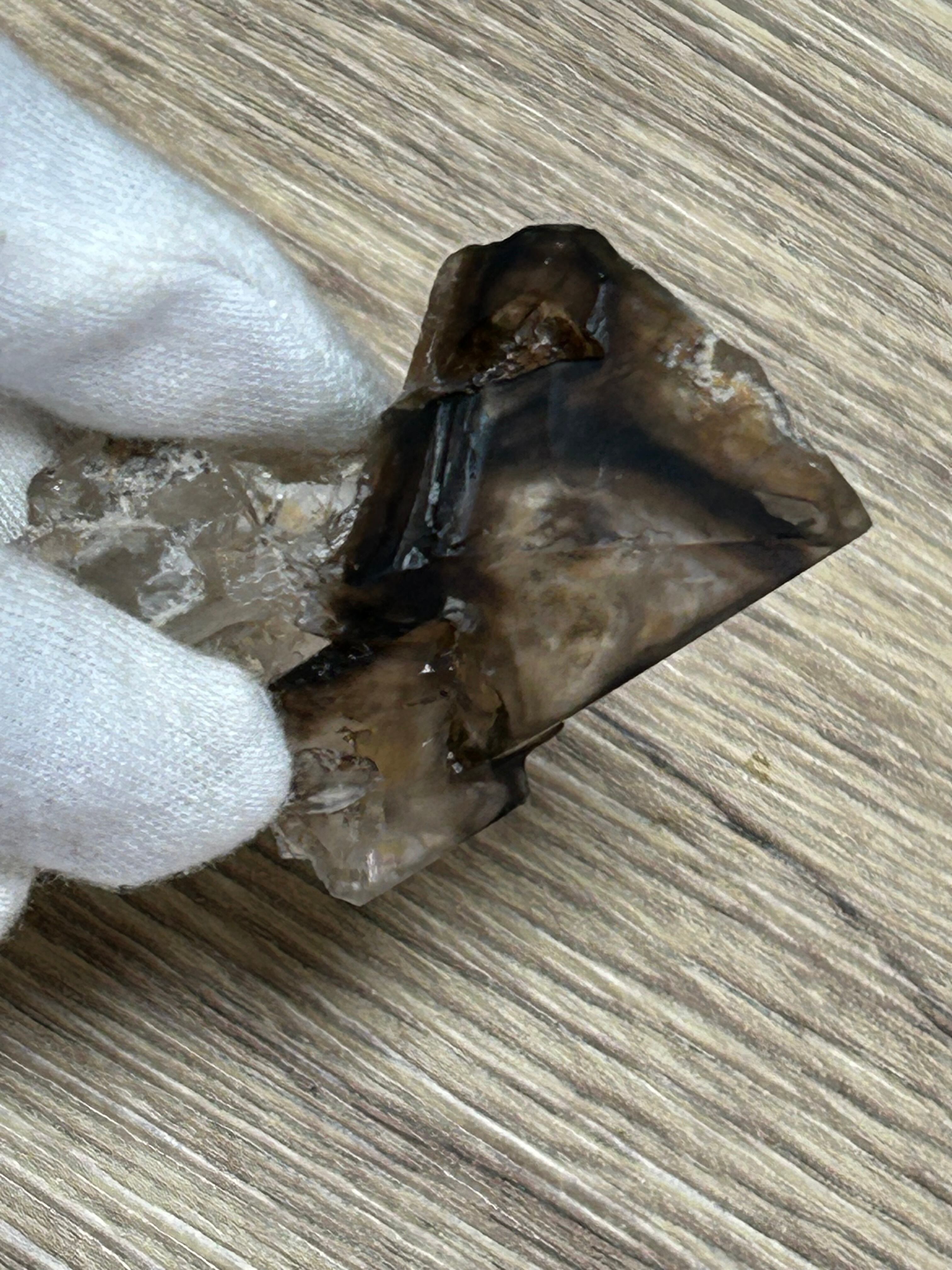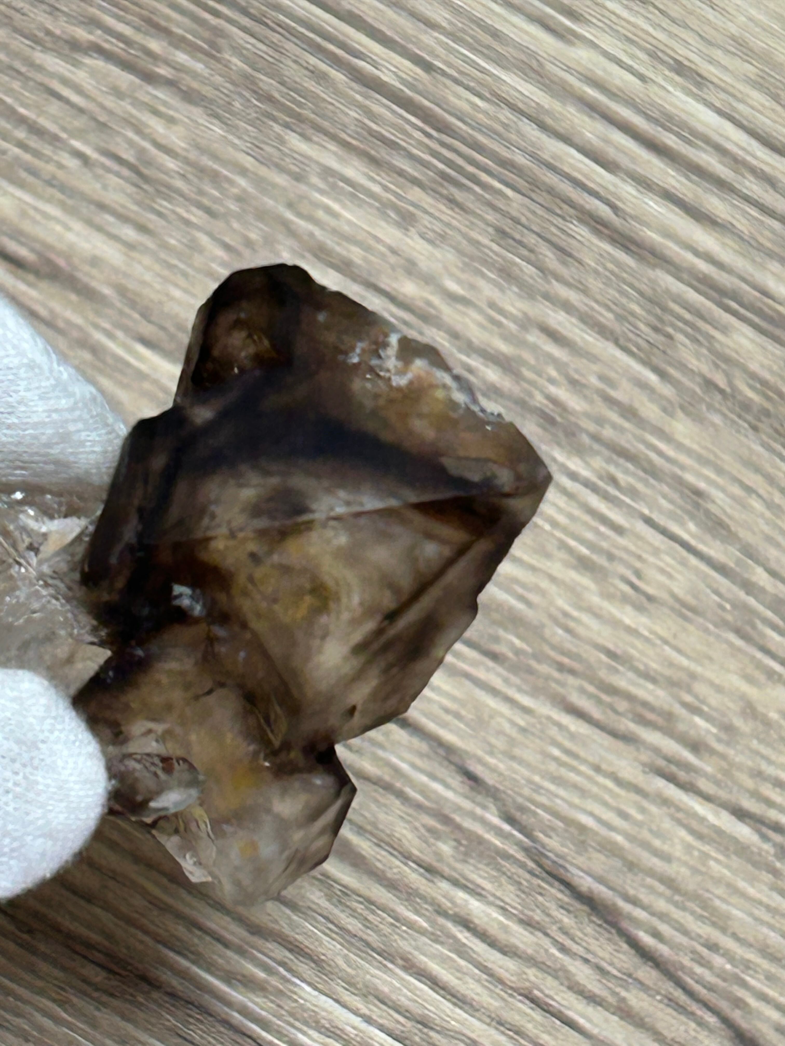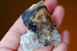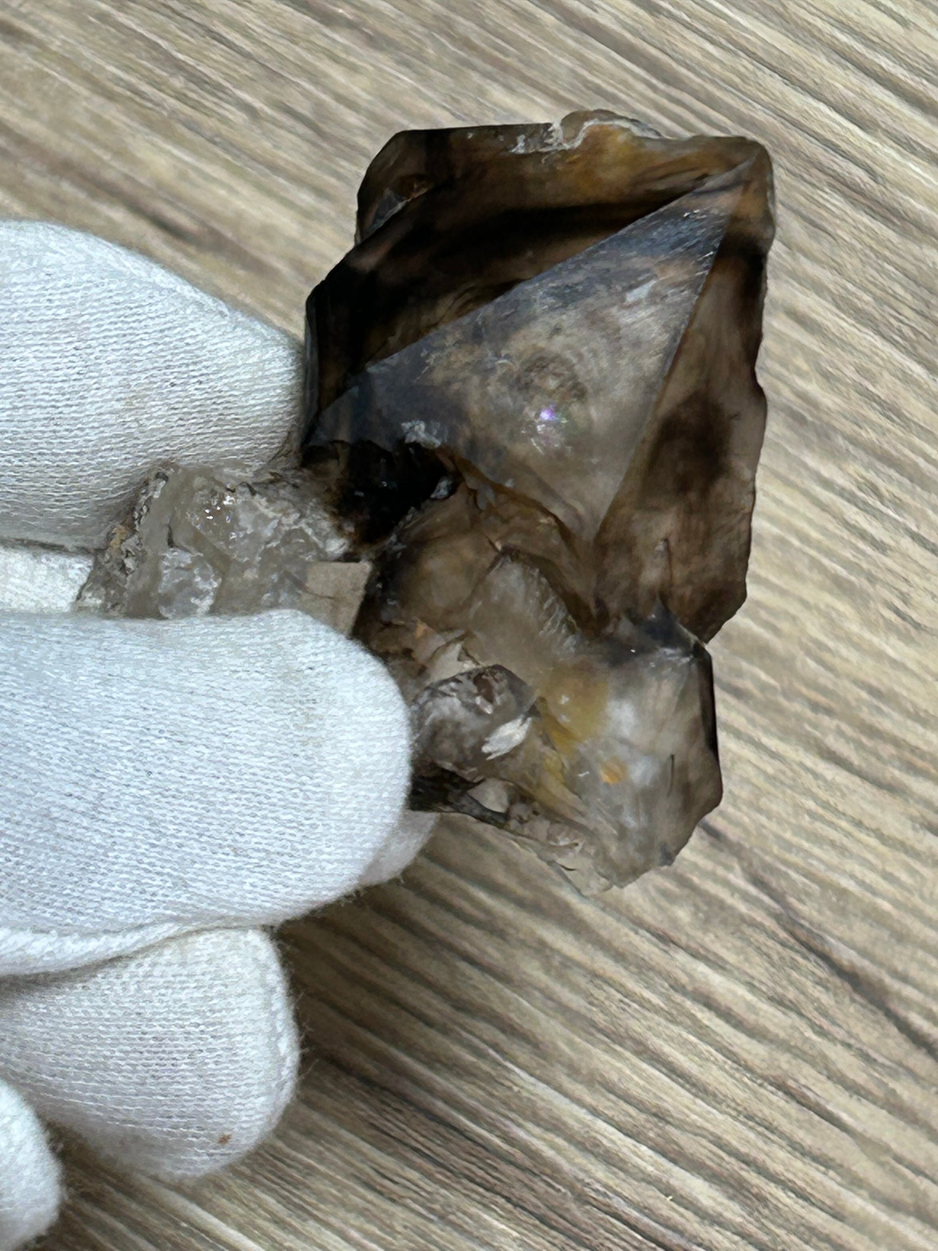 非常に面白いエレスチャルです。くっきりと黒い縁取りを覗くとおそらく中は空洞で、その奥を覗くと濃い虹がチラチラと輝いていて感動的でドラマチックな水晶です(*^_^*)。唯一無二なエレスチャルなので、個人的にはかなりおすすめです♪