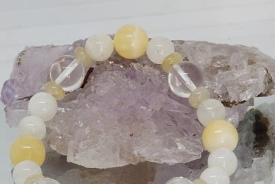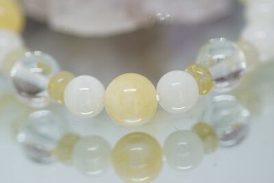 内径16cmアラゴナイト10mm×4,水晶10mm×4、ムーンストーン8mm×10ルチルクォーツボタン×8個コケテイッシュな魅力があり楽しい気持ちにさせてくれるアラゴナイトに母性あふれる月のエネルギーに満ちたムーンストーンそして、バランスをとってくれる水晶、潜在意識を活性化させてくれるルチルクォーツを挟みました、小さく固まった心をほぐし、おおらかな気持ちで人間関係を円滑にしてくれるようなブレスレットです。サイズについては ご相談下さいませ。(在庫不足のお取り寄せなどで、一週間ほどお時間を頂くこともありますのでご容赦くださいませ) 東洋占星術「算命学」の占い師でもあり、高野山真言宗に得度し、歴史ある高野山真言宗のお寺に古くからお祀りされていた弘法大師様の仏像を師匠からお預かりし、自宅にてお祀りさせて頂いております。当店のブレスやアクセサリーなどは、皆様のご健勝とご多幸を全て祈念させて頂いております。算命学の鑑定をご希望の方は、別途お問い合わせくださいませ。 出来るだけ忠実に商品のイメージをお伝えしようと心がけて おりますが、実際の商品とは色、イメージが異なる場合がありますので ご了承下さい。 当店の商品は全て返品可能ですので ご安心してお買い求めいただけます。