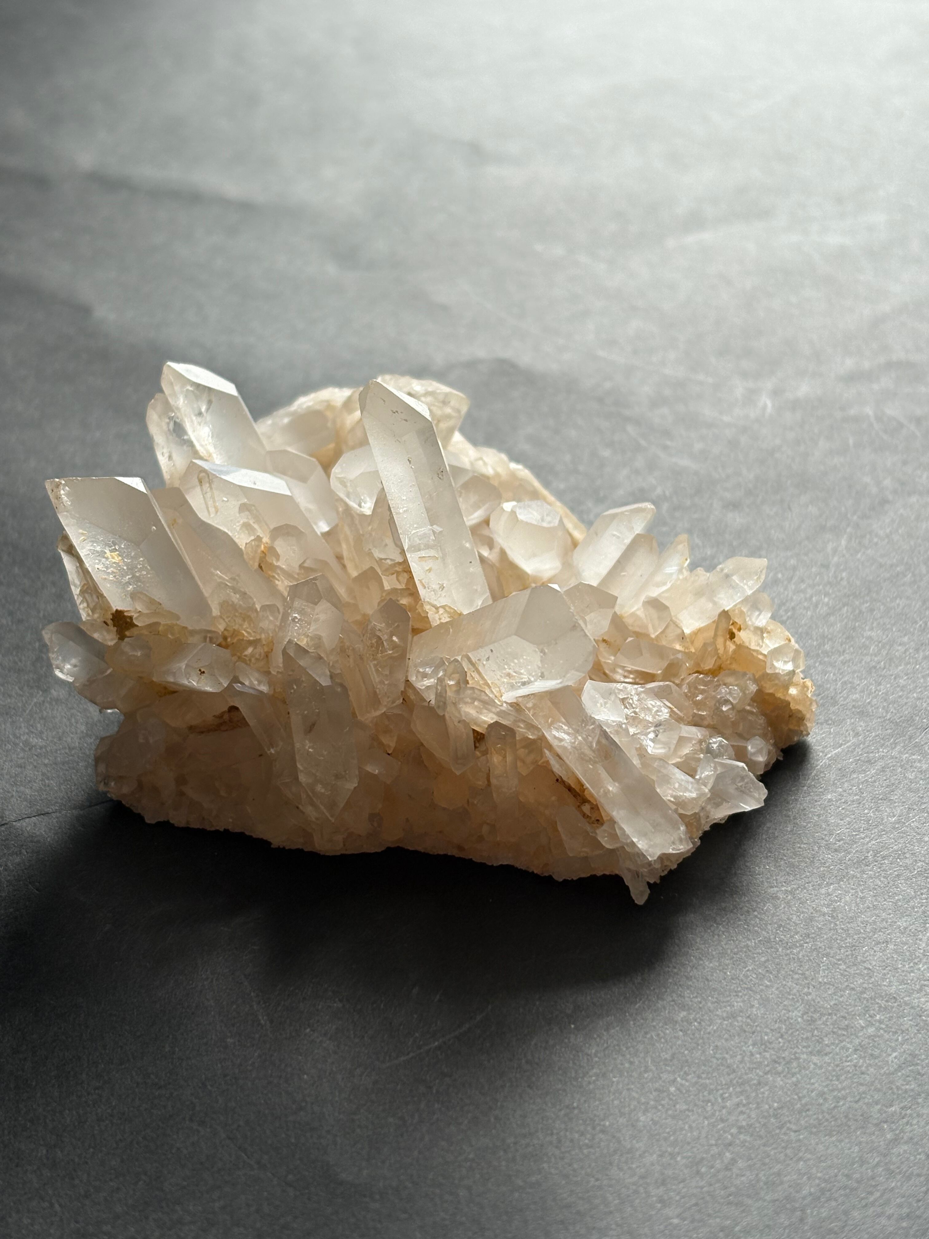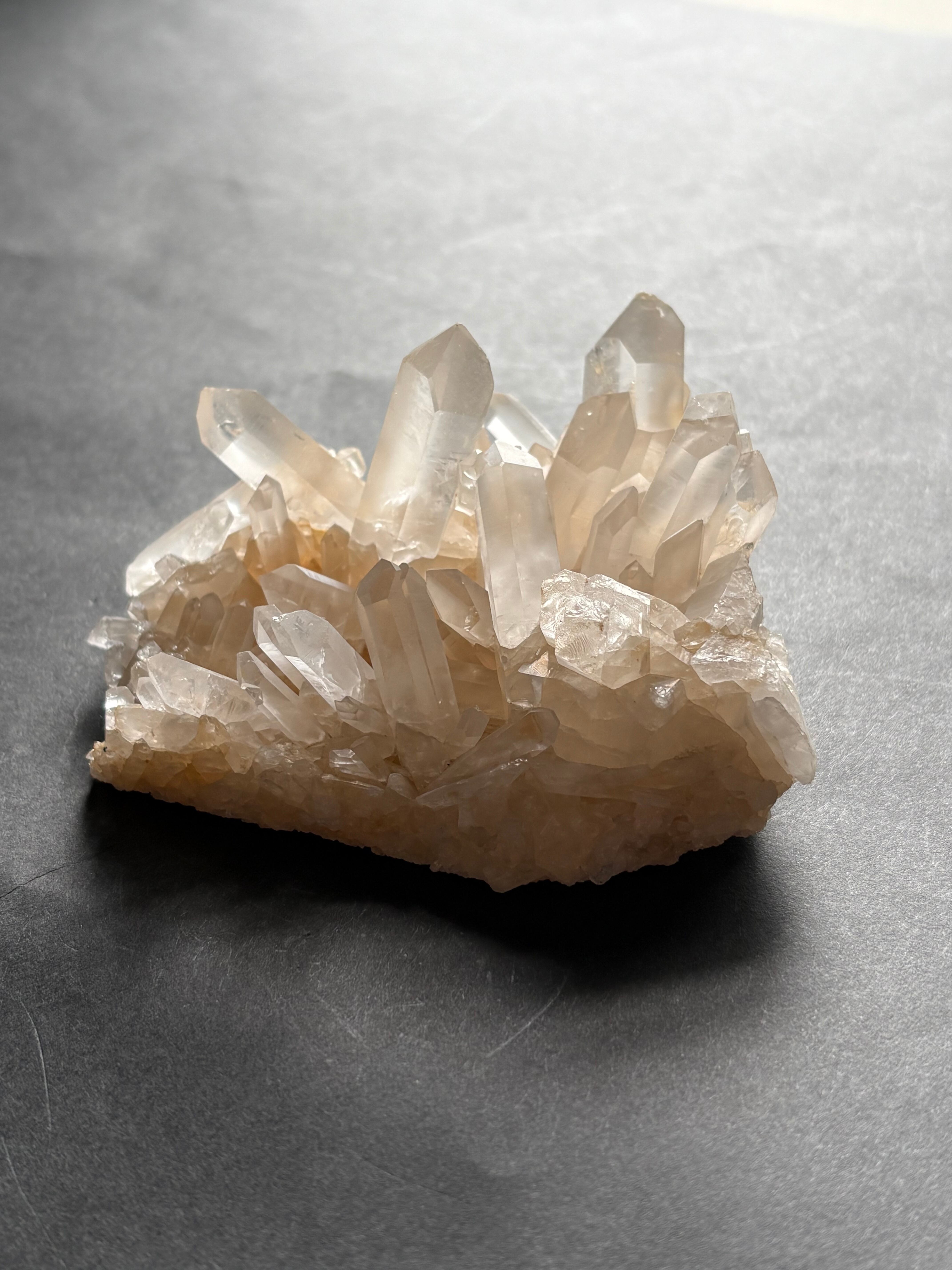オレンジかかった可愛い雰囲気にかすみがかったミルキーさが加わった非常に可愛い水晶のクラスターです。結晶のひとつがタントリックツインになっていて、ナチュラルな状態でのタントリックツインの結晶が楽しめます。群生している中で寄り添って結晶化したところが ソウルメイトと結び付けててくれ成長していく・・・という印象で、素敵です。