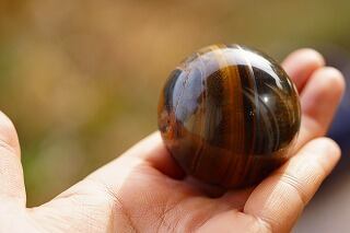 tg081012 タイガーアイ(ファルコン)丸玉約47mm 大きめのタイガーアイですが、ちょっとブルーのファルコンアイも入っています。金運のお守りとして絶大な人気を誇るタイガーアイですが、この石の虎の目のような輝きが、古代から神の目と言われ「全てを見通す」「先見の明がある」とされ、仕事運、金運はもちろんの事、全ての厄災を 避け、成功に導くとされています。直観力を養うことから、ギャンブル運のお守りとしても好まれています。