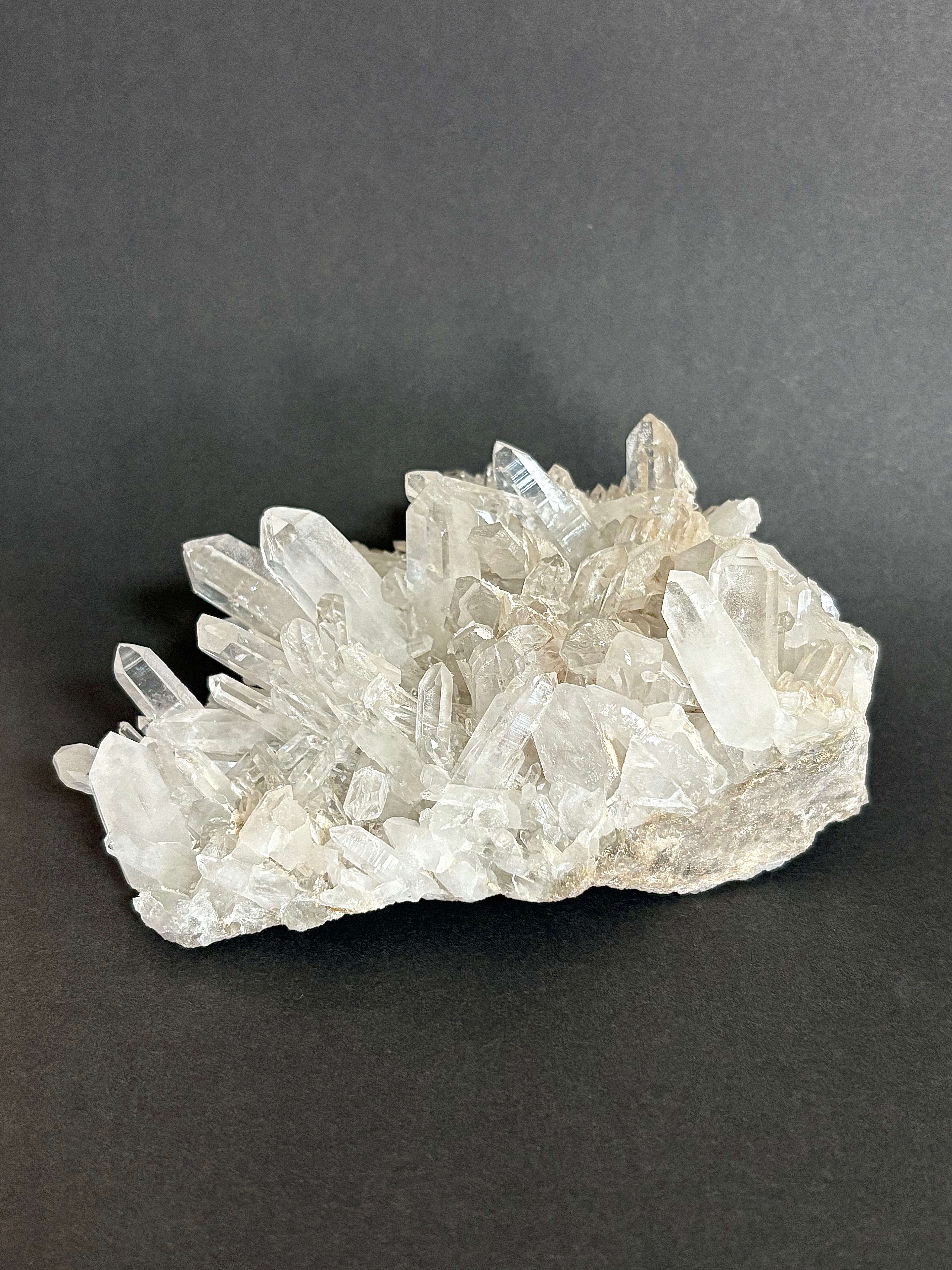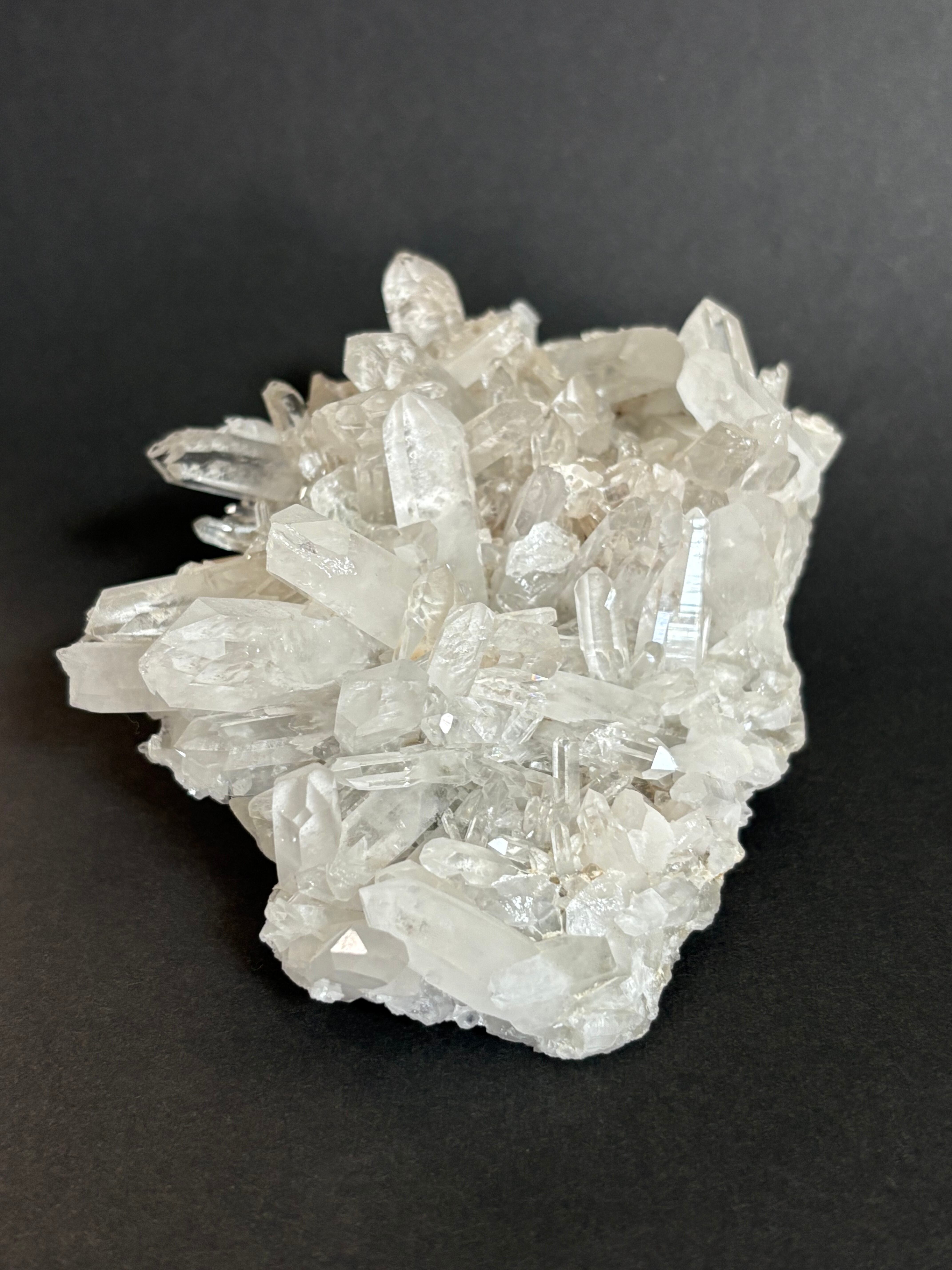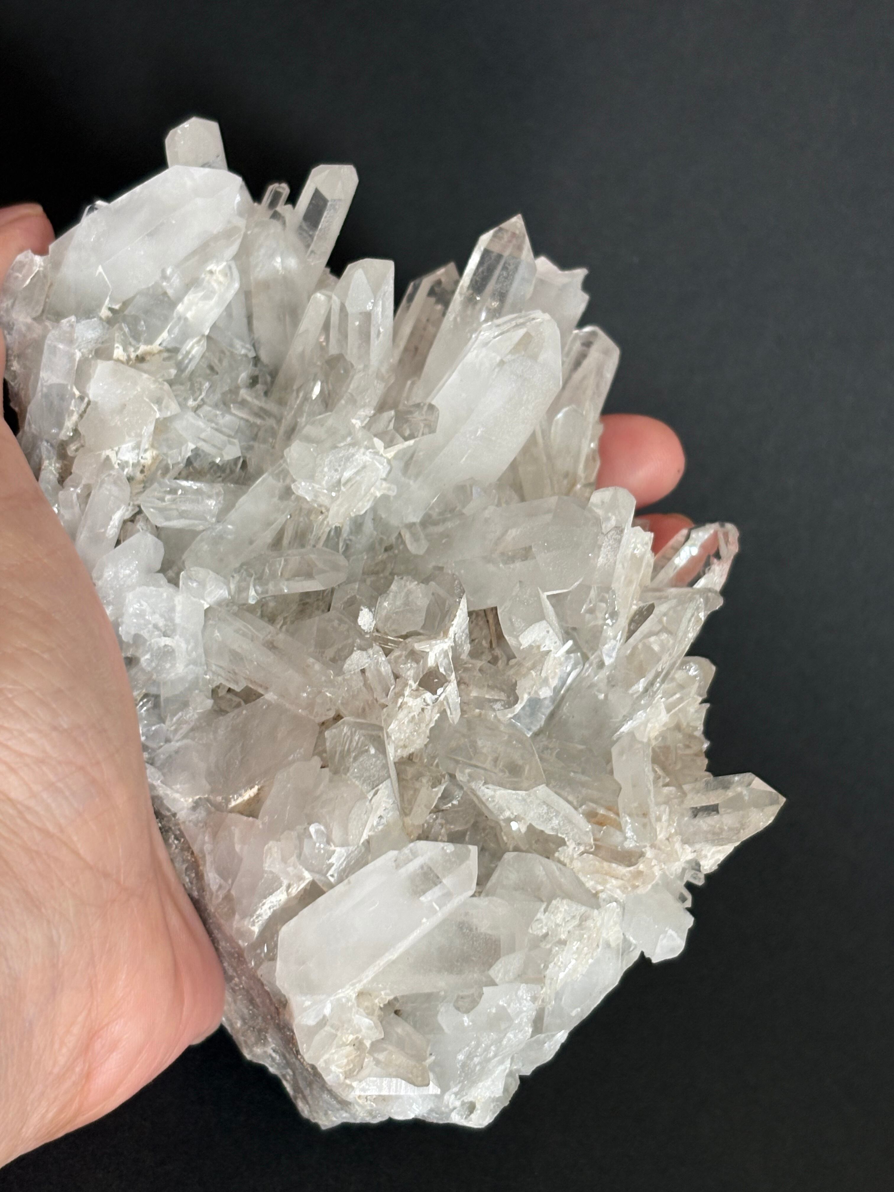 Hrtp161204 タプリジュン産約576g 横約125mm*縦約92mm*高さ約61mm 透明感があるところと白く白濁したところが混濁している水晶のクラスターで、ほかの鉱物も付着していて面白いです。ほかの鉱物の影響か 輝きがちょっとプラチナっぽい感じの輝きなので(なんとなく銀色っぽく見える)大人っぽい印象のクラスターです。