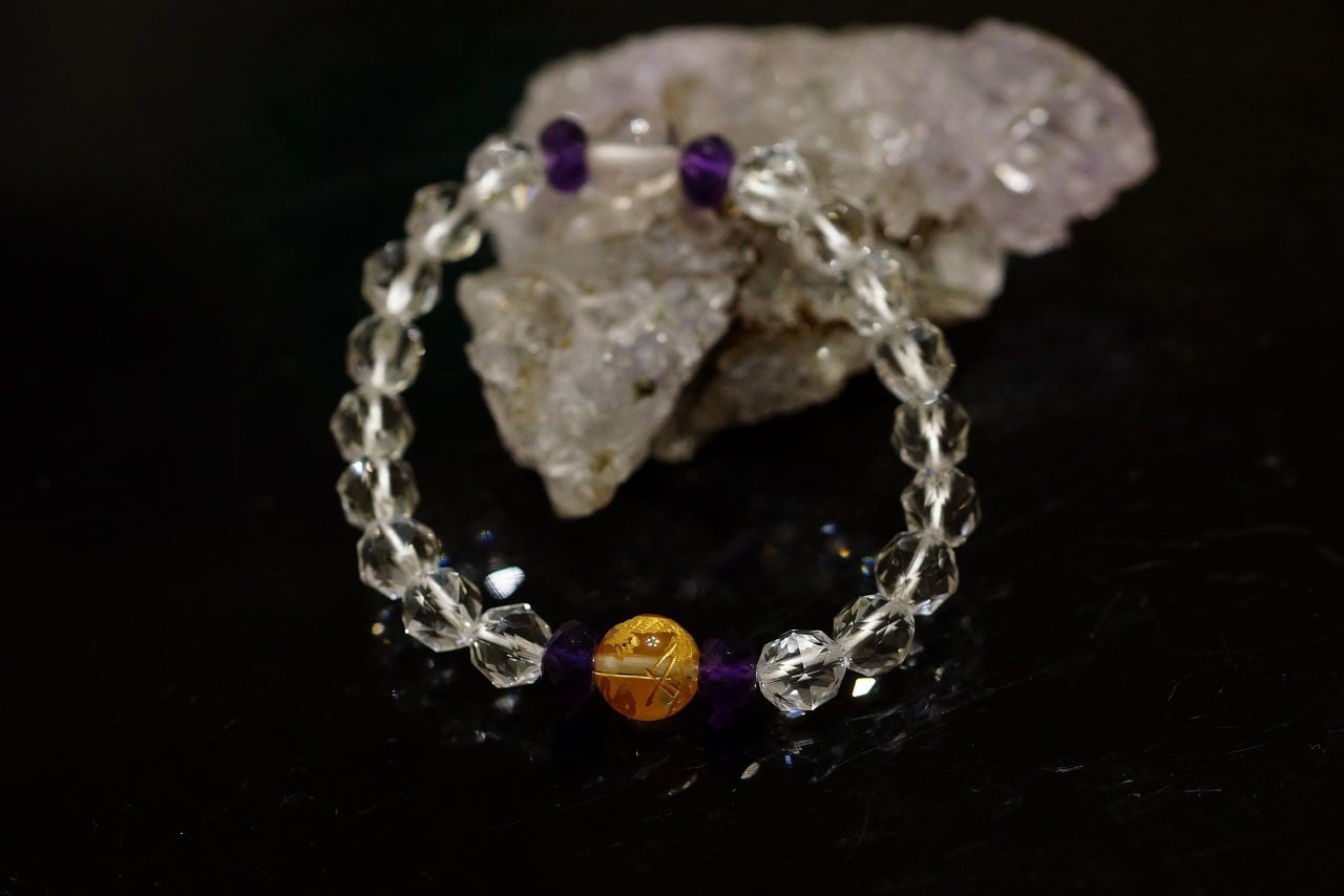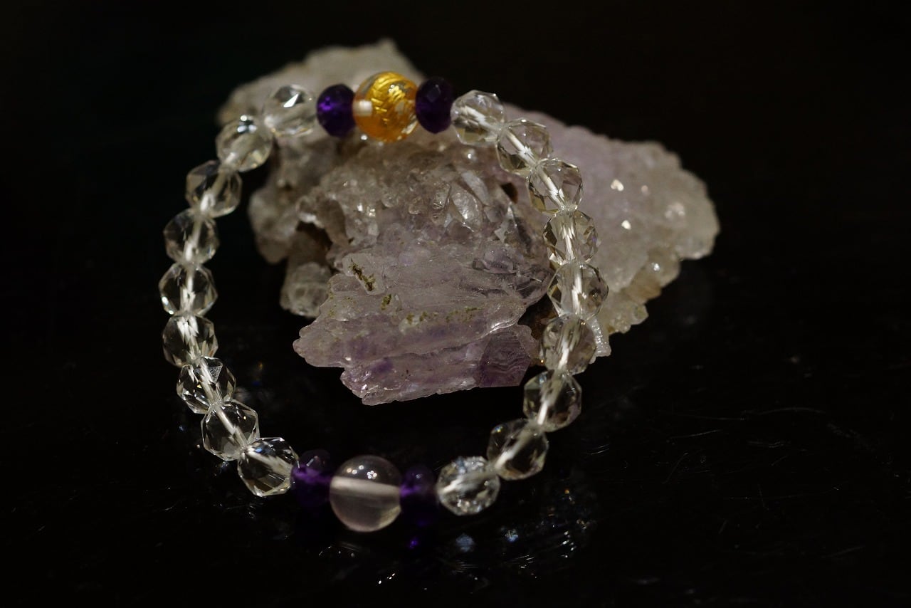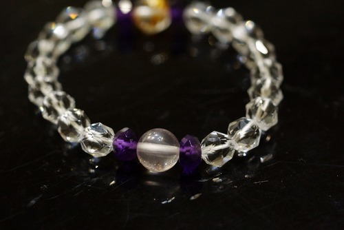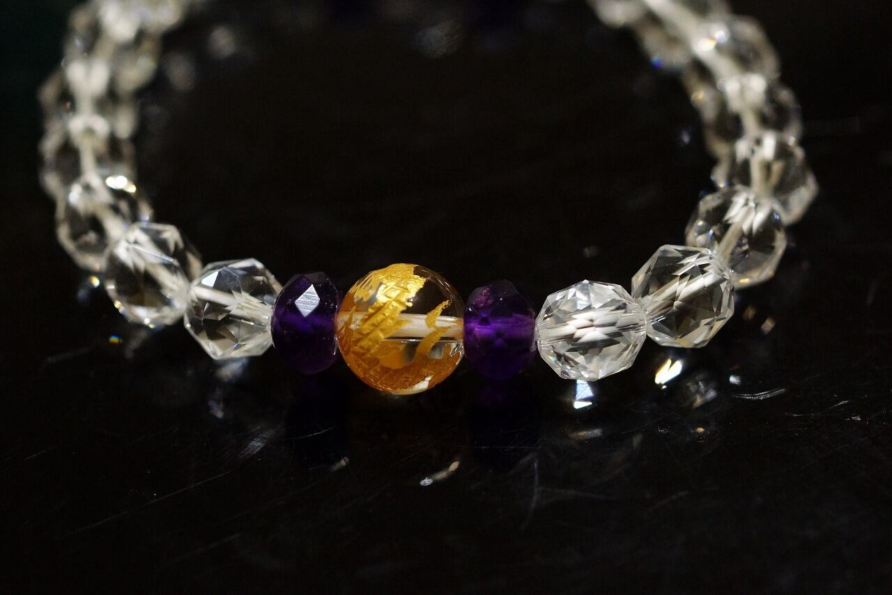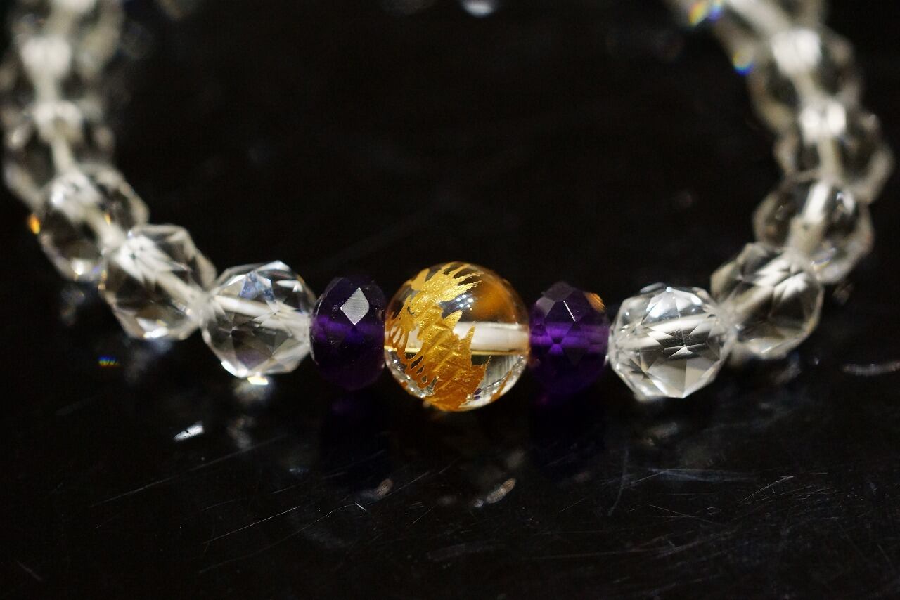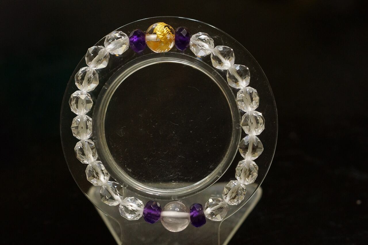 高品質☆スターカット水晶・金竜・ローズ・アメジストブレスレット 内径16cm