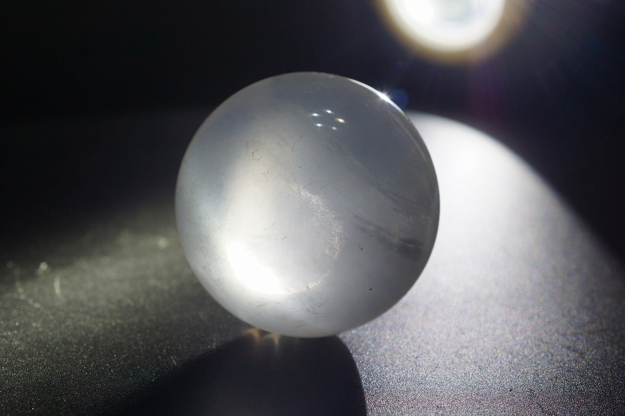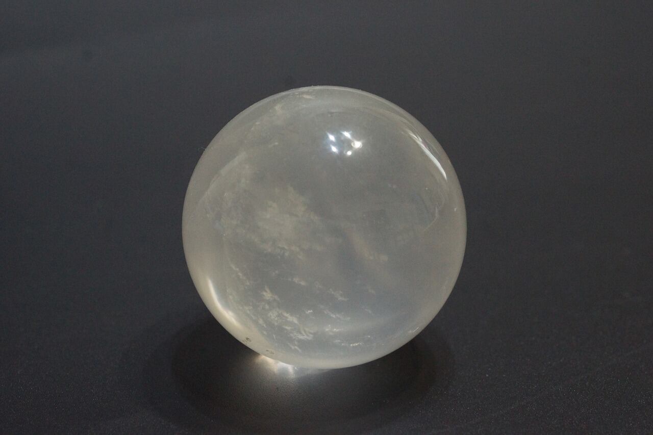 非常に可愛いジラソルクォーツです。この透明感とミルキー感、すてきです~(*^_^*)ジラソルクォーツとはマダガスカル産のミルキークォーツのことですが 、その特徴は、シラー効果(ムーンストーンなどに現れる光の輝き)のような光がムーンストーンとは違う輝きで、ひょっとして光が出るとスターが出るの?(スター効果とはルチルのような針状の内包物が規則的に並ぶことで光をあてると6条の光が現れるアステリズム効果のことなんですが)と、始めて見た時は非常に謎で光を当てて見ましたがスターが現れず、「なんなんだろ」と裏から光りを当てるとスターが現れて鳥はだが立つほと驚いたんですが、これは球状なのでスターは現れませんが(一応試してみましたが)球状のジラソルクォーツは、裏から光を当てるとスターが現れるものもあります。でも、そのスターの出かたは スターローズクォーツやスターサファイアのスターの出かたとは少し違い神秘的です。そして、そういうことから通常の状態でやや、石自体が光りを発しているように見えて、そして、うっすらとミルキーなので、 ほんとに可愛いんです!個人的には、どのジラソルも100%大好き!ですが、一般的にもひと目みたら好きになる方が多いんではないかと思います。