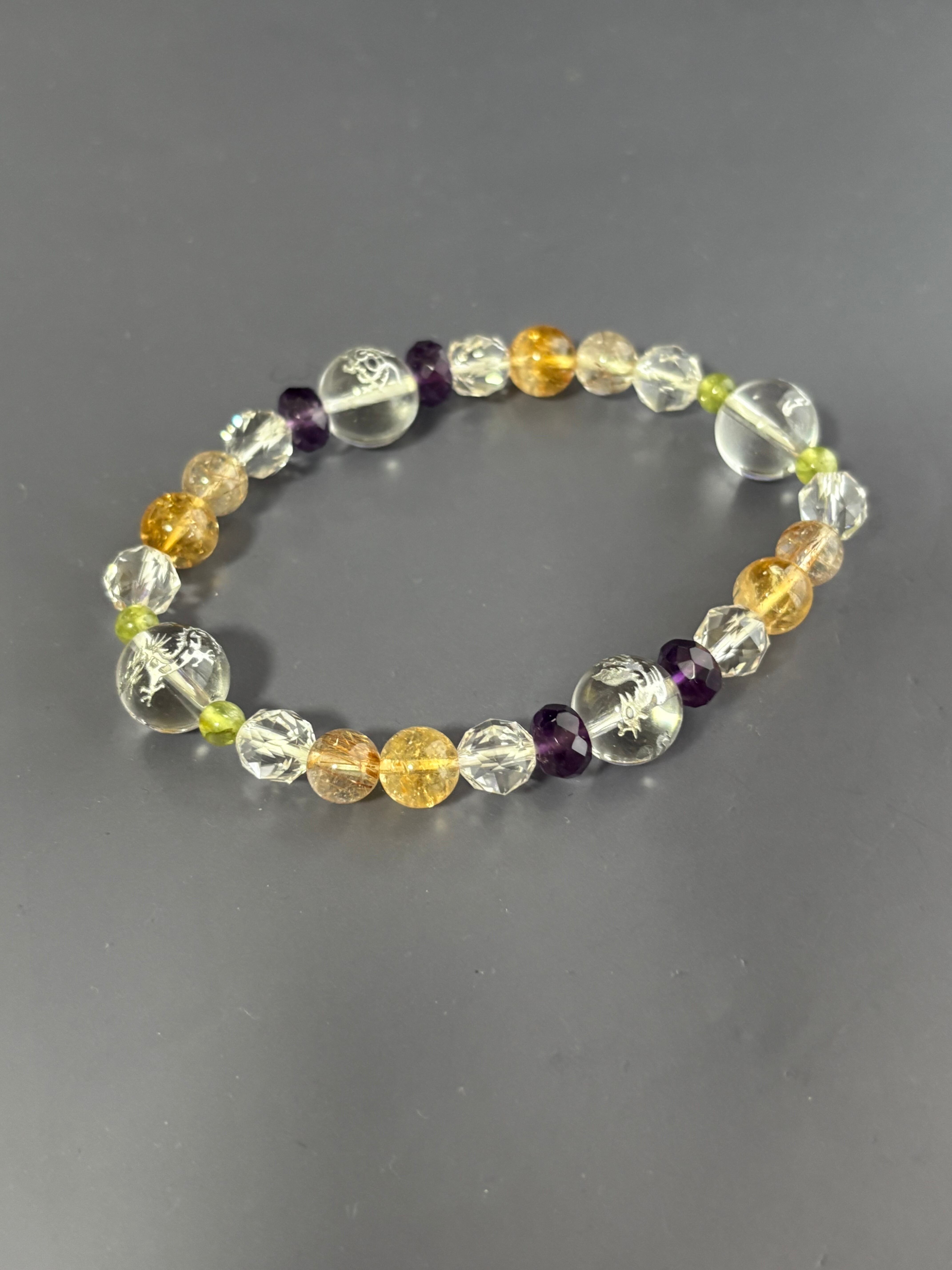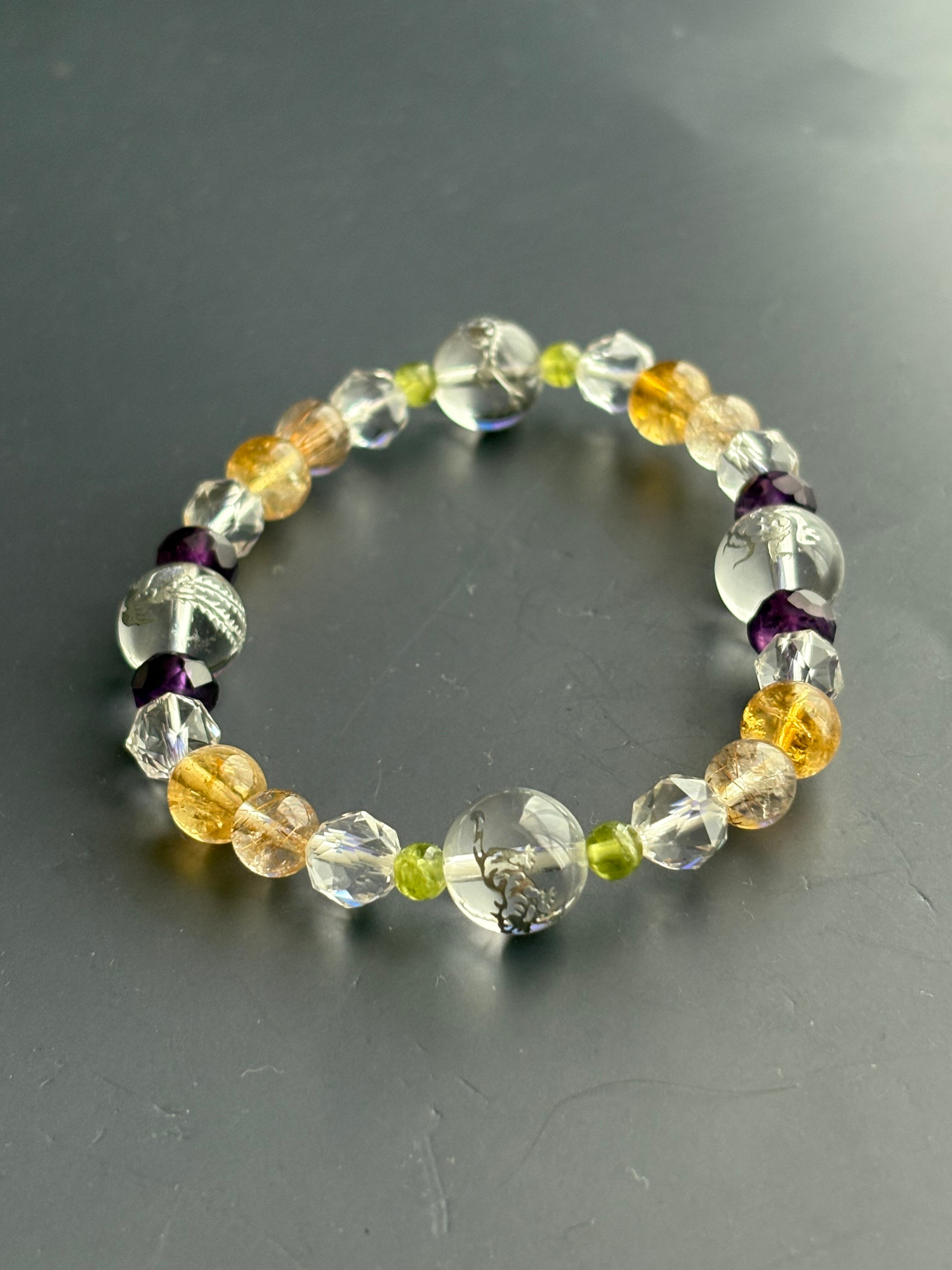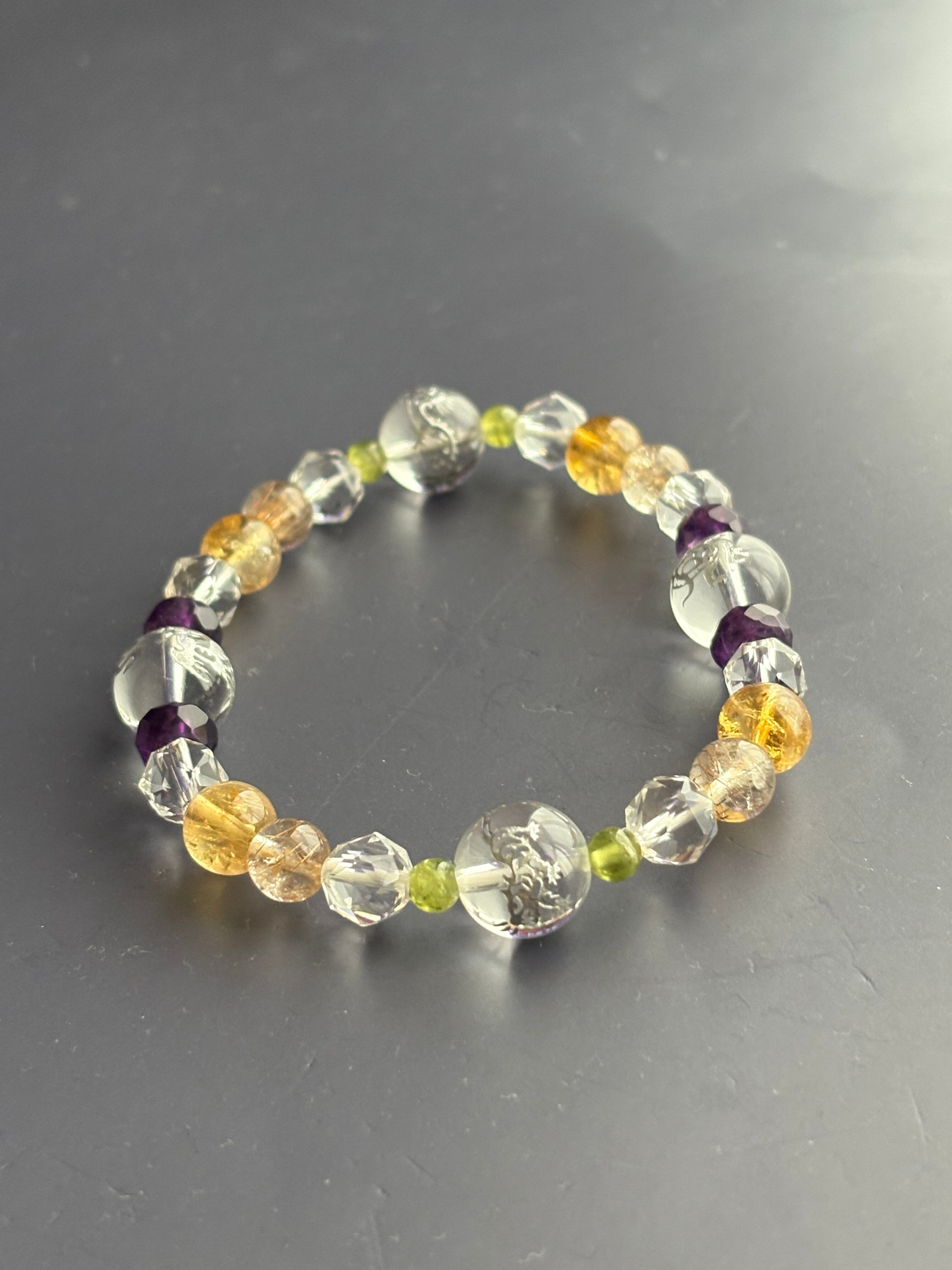 東洋で大事にされている四神(青龍・朱雀・白虎・玄武)をメインに精神性の高い石アメジストが洞察力を高め、「太陽の石」とも言われるペリドットがネガティブなエネルギーを取り除き仕事への活力を高め、金運アップに人気が高い小金色のシトリンと、ルチルクォーツを入れました! 内径は18cmと大きめで男性でも大丈夫です。