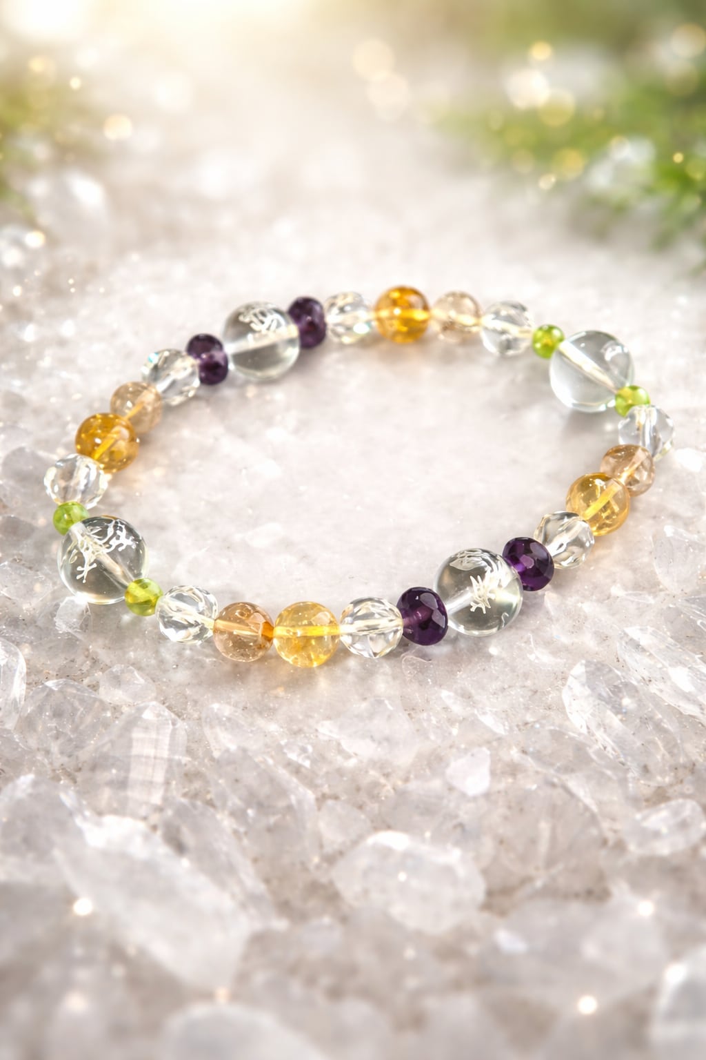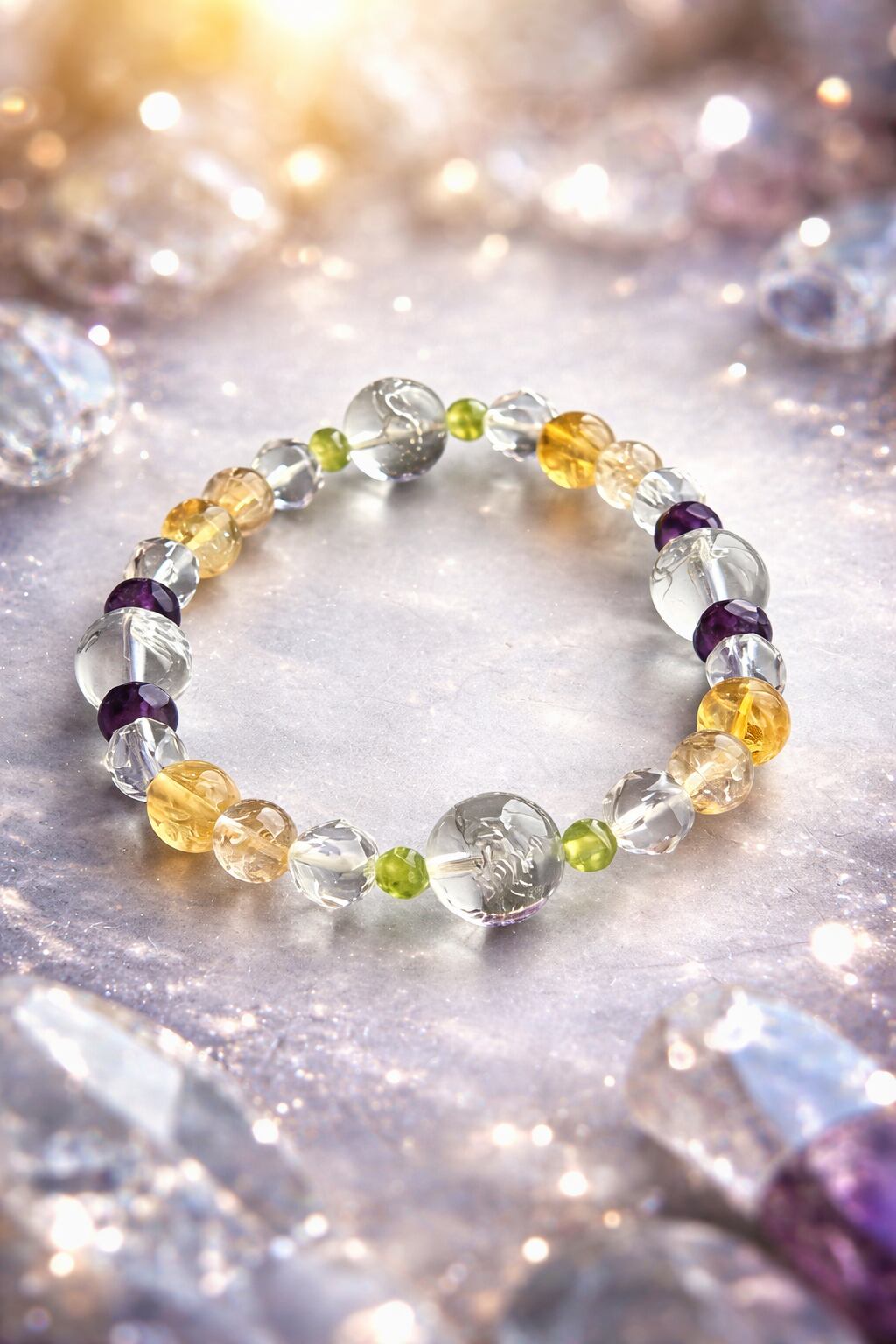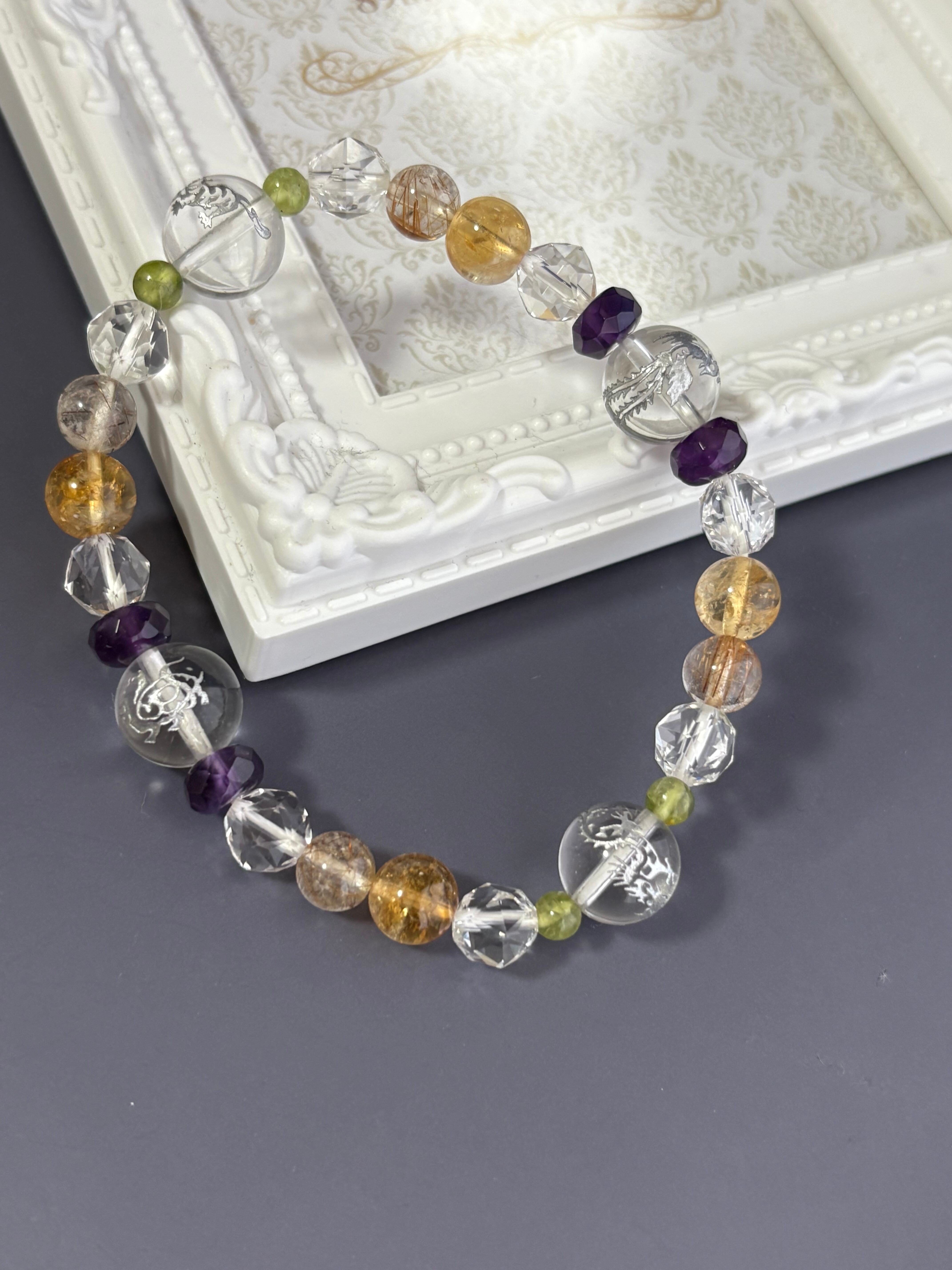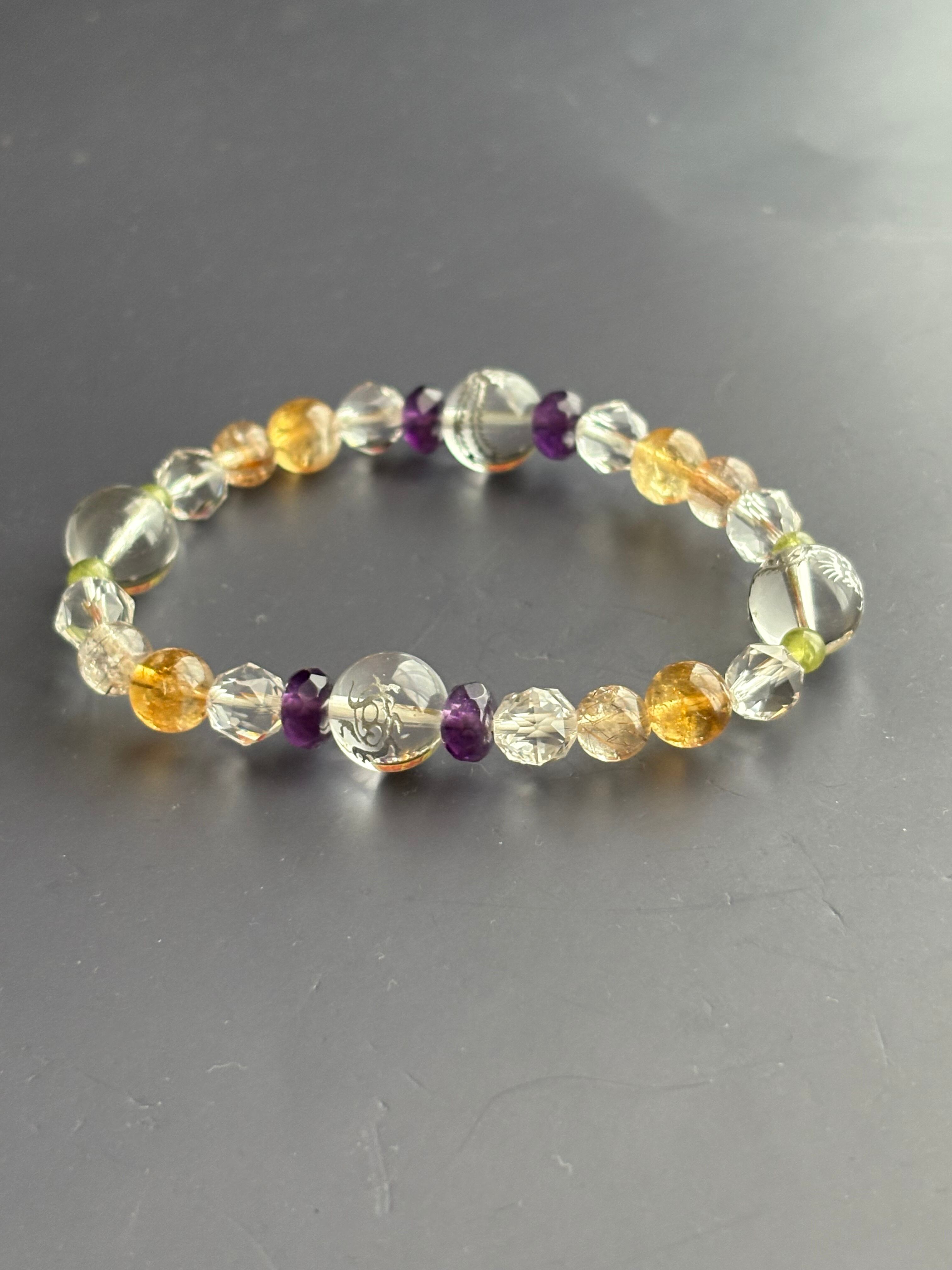 東洋で大事にされている四神(青龍・朱雀・白虎・玄武)をメインに精神性の高い石アメジストが洞察力を高め、「太陽の石」とも言われるペリドットがネガティブなエネルギーを取り除き仕事への活力を高め、金運アップに人気が高い小金色のシトリンと、ルチルクォーツを入れました! 内径は18cmと大きめで男性でも大丈夫です。