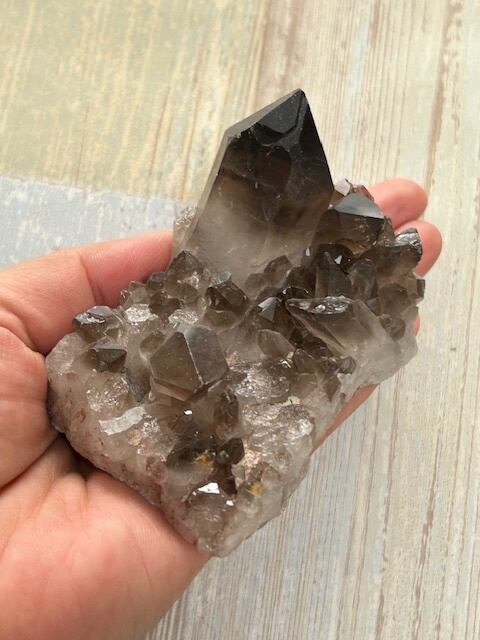 mr24119 モリオン水晶クラスター約166g 横約81mm*縦約54mm*高さ約42mm 大きめの結晶と小さめの結晶が平たく安定した形で座りよく群生しています。スモーキー色が強いですが、穏やかな印象で素敵です。