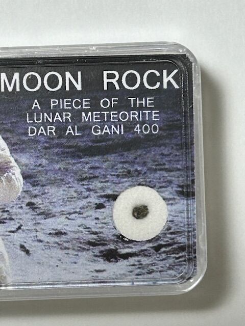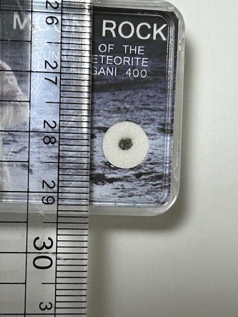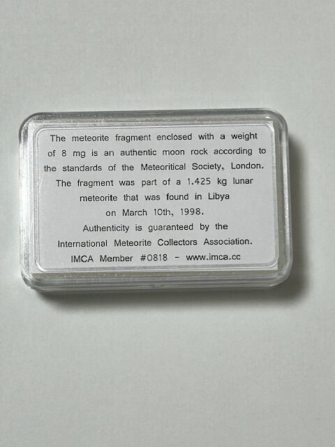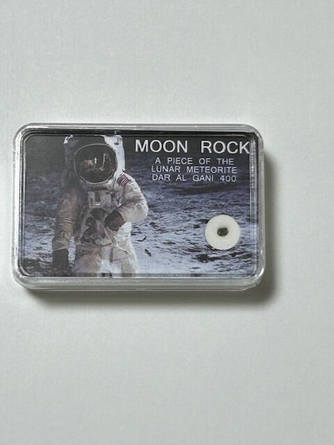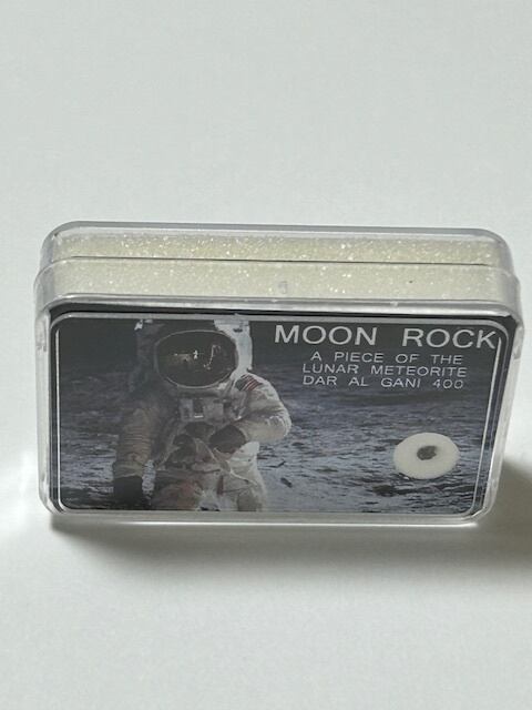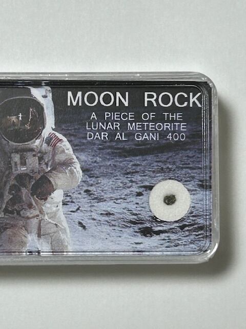 22106月の石(GANI400)〈1998年リビア落下〉お待たせいたしました!!大人気の「月の石」!ようやく再入荷いたしました!数ミリ程度の大きさですが、れっきとした月の石です。子供の頃から日本人なら誰しもが「かぐや姫」の話を読み「うさぎさんが餅ついてるね」なんて見上げた夜空に浮かぶ月の石。最近は「月旅行」でもまた注目を集めていますが、なかなか庶民では、あの、お月様まで行って月の地表に降り立つということは出来ません。まさか手に入ると思っていなかった「月の石」。月の隕石が手に入ると知らなかった時は「欲しい」と思ってませんでしたが、「手に入れることが出来る」と知ったら、やはり一つは持っておきたい「月の石」です砂粒程度でも、大満足の逸品です。この月の石は、イギリス、ロンドンにあるMeteoritical Societyの規格に沿った 月の石で、I.M.C.A.(International Meteorite Collectors Association)によって、保証されています。 詳しくは、英語ですけど以下のサイトに記載されています。 http://www.imca.cc これまでに南極から14個の月起源隕石が発見されており、そのうち7個が日本隊による発見です。南極以外ではオーストラリアで1個、サハラ砂漠で2個が発見されています。 特徴は、 玄武岩・輝緑岩・ハンレイ岩:玄武岩質の一群で、月の表層で急冷されてできた岩石です。輝緑岩・ハンレイ岩の順で深い位置でできたものです。月のクレータに内部から溶岩が流れ出し、固まって出来た岩です。 出来るだけ忠実に商品のイメージをお伝えしようと心がけて おりますが、実際の商品とは色、イメージが異なる場合がありますので ご了承下さい。 当店の商品は全て返品可能ですので ご安心してお買い求めいただけます。返品の際の送料に関しましては恐れ入りますがお客様のご負担でお願い申し上げます(破損、不良品など当店に責がある場合は当店が負担いたします)