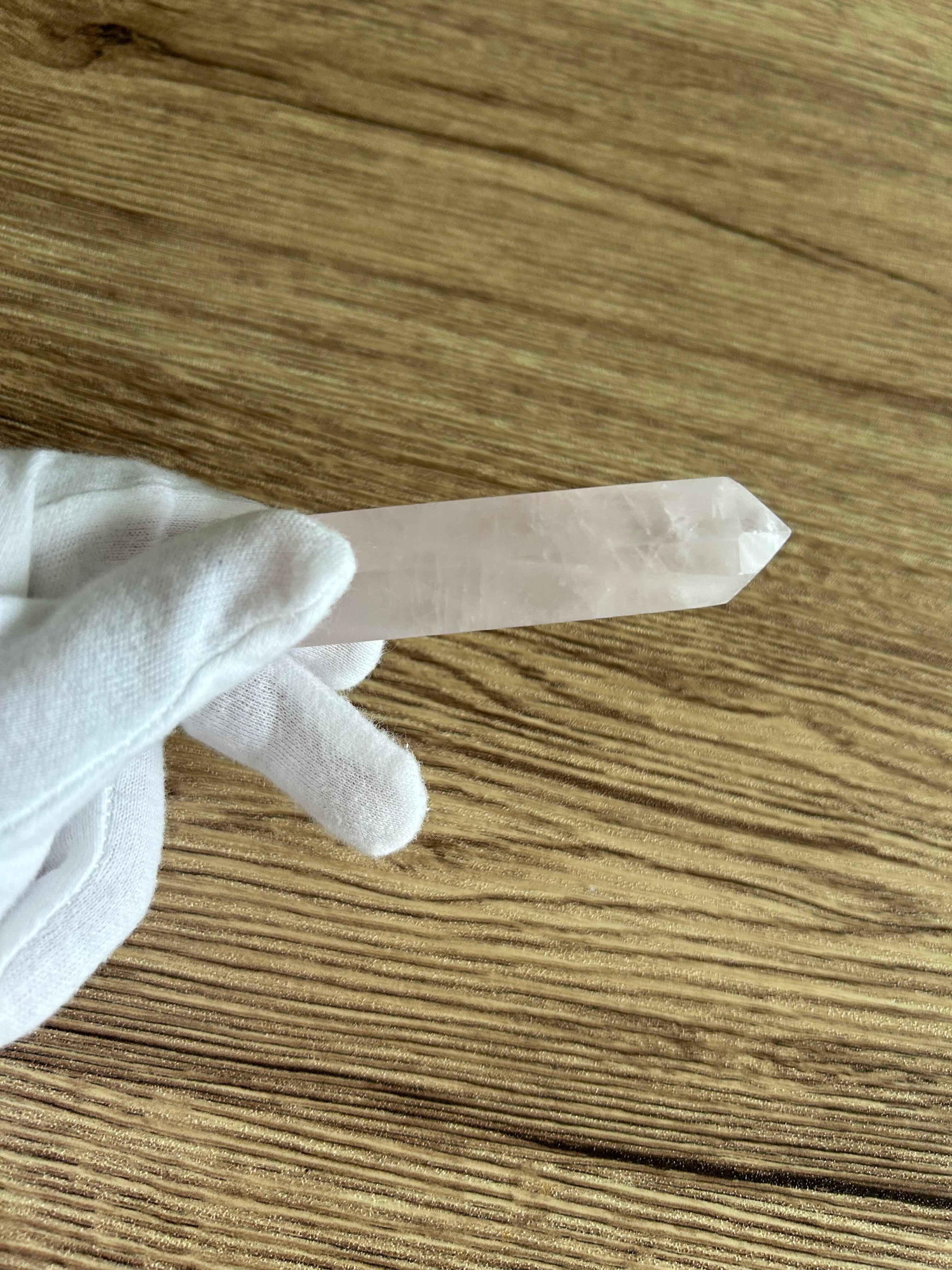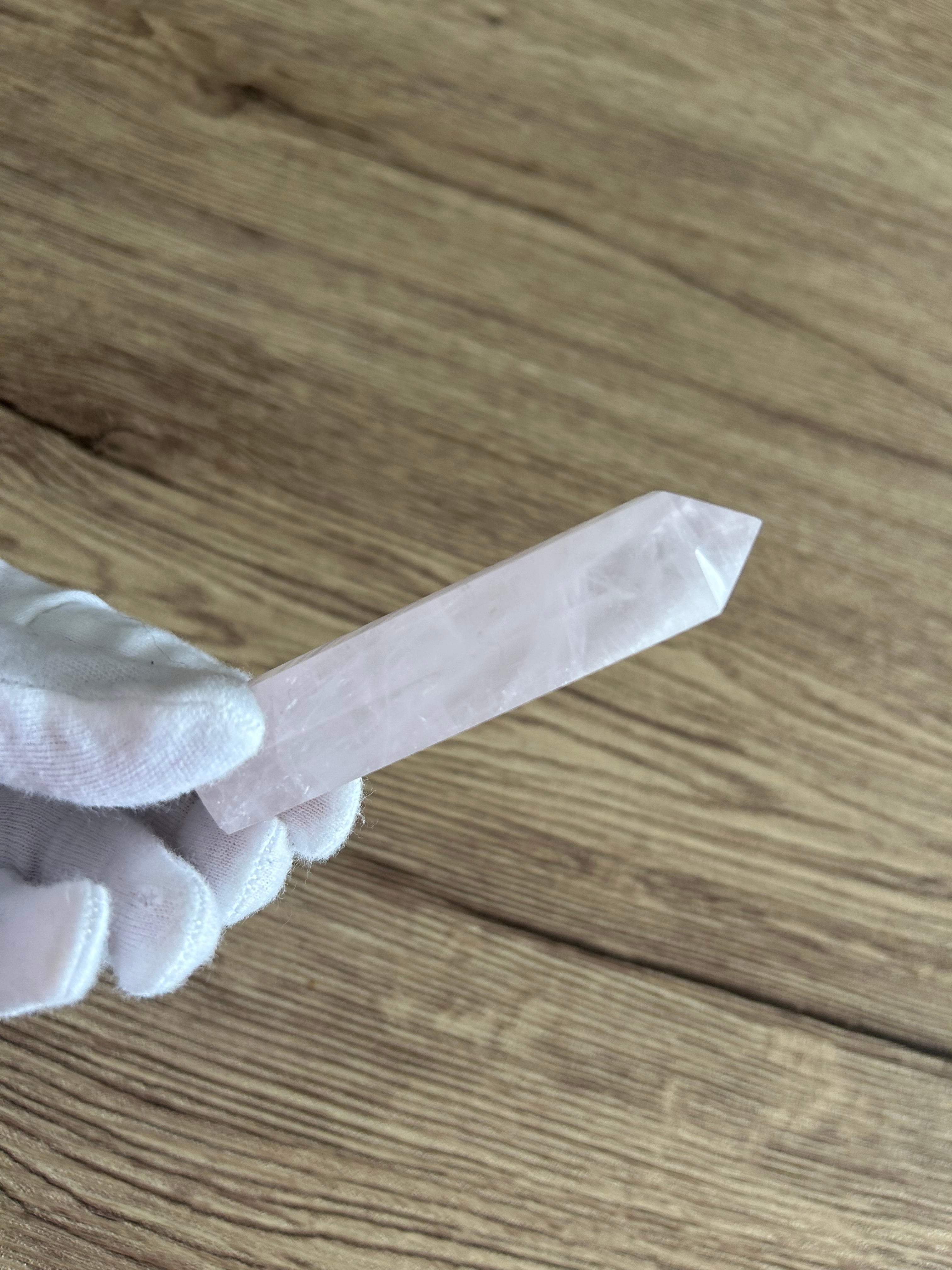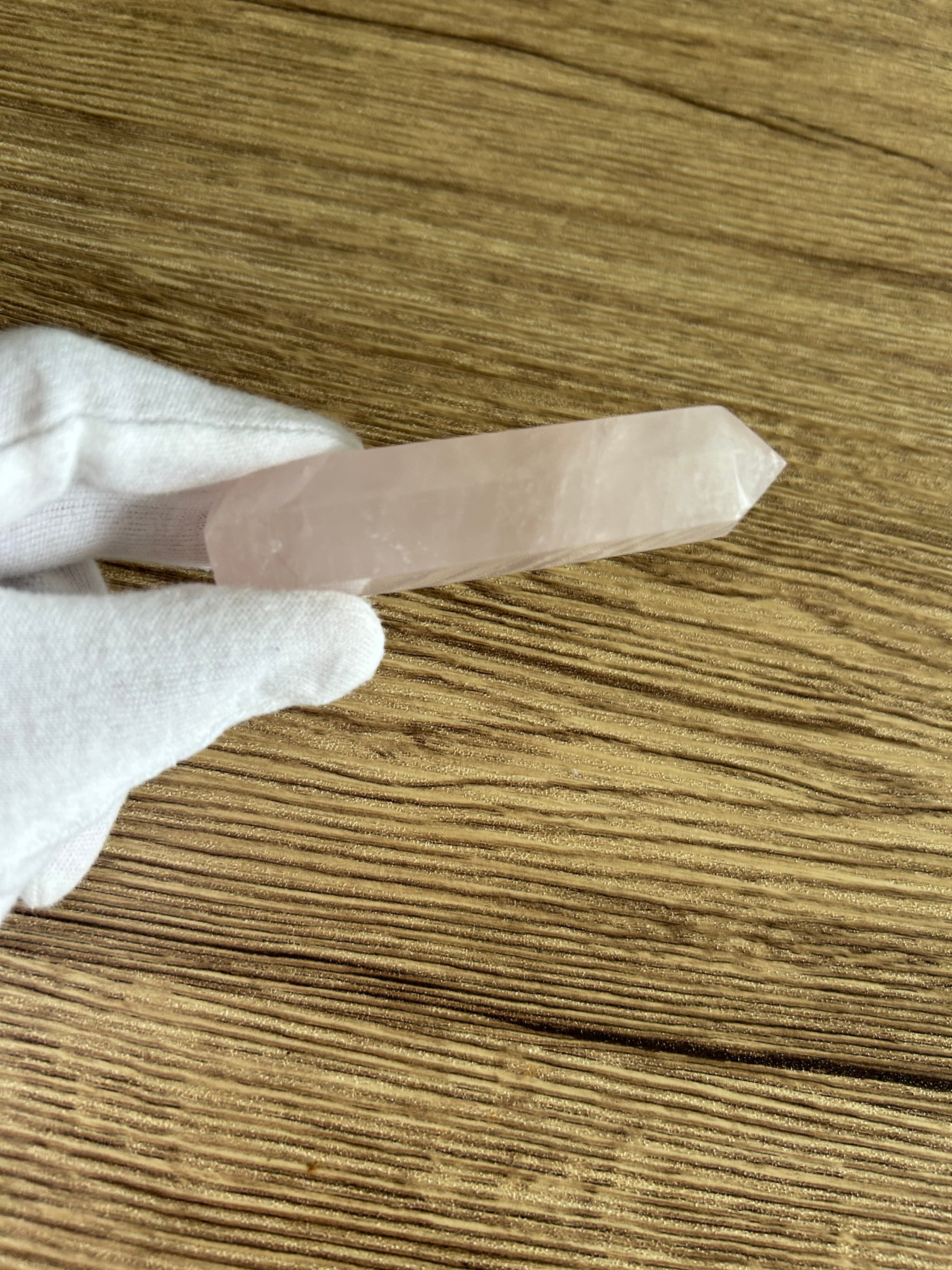 ミルキーっぽくて色は薄めのローズクォーツポイントで、細長くて持ちやすいローズクォーツポイントです。