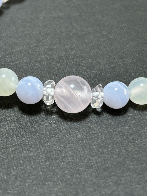 ローズクォーツとプレナイトは無条件の愛の石。ブルーレースが情緒を安定させて穏やかさを与えてくれますが、ローズクォーツはそれに加えて自分自身を愛することの大事さと女性らしい魅力をアップさせてくれます。プレナイトは大天使ラファエルや高次元の存在と繋がっていると言われており、神のエネルギーに同調し、予知能力を高めます。また瞑想に適した石で内側から霊的成長を促してくれます。