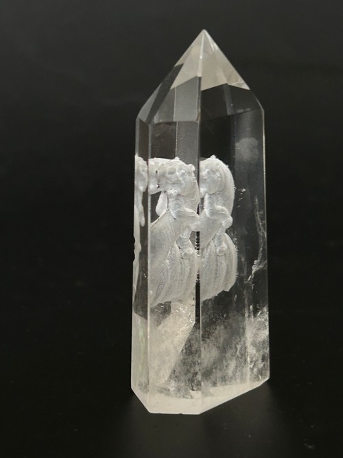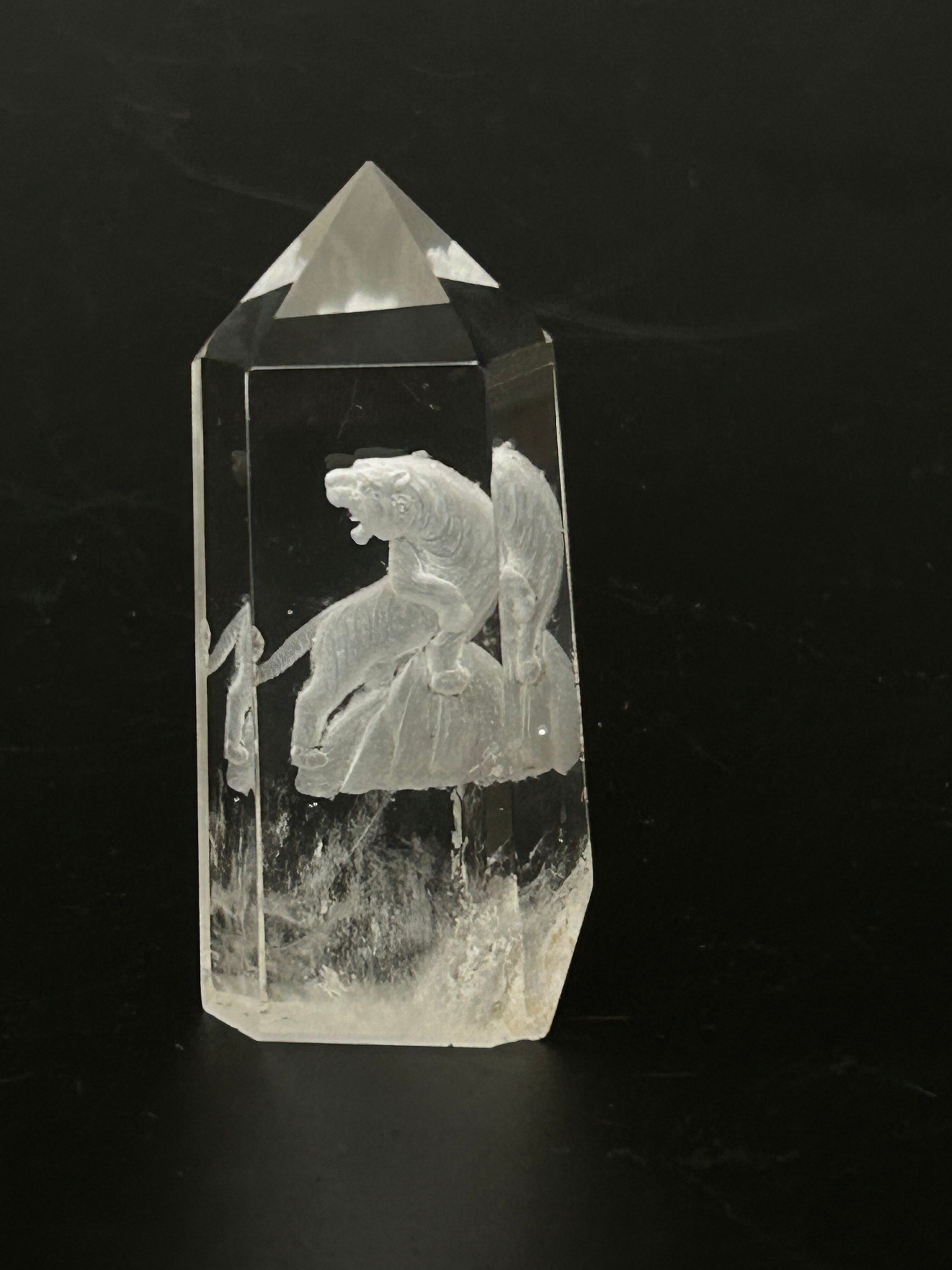 透明度の高い美しい水晶に白虎」がレーザーで彫刻されています。ホワイトタイガーは神の使いでもありその姿を見た方に幸福をもたらすと言われています。四神の中で「白虎」は西の守り神です。西の方角は「攻撃力」「行動力」「積極性」を表わし思ったことを実現する為の行動力を促します。西の方角に置くと良いと思います。