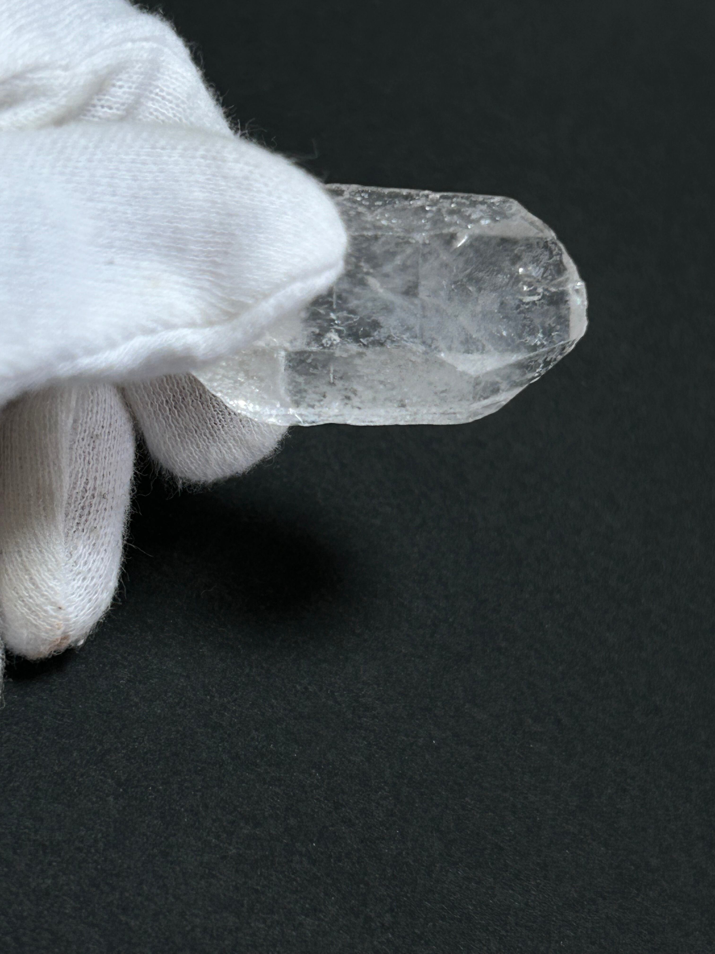 側面のエッジが面白く見所があります。そして小さな虹が入っていて色々な色が浮かびあがり底面の折れた部分は水晶が新たに成長しようとしているセルフフィールドが見られるので小さめですが見所は満載の満足出来る水晶でオススメです♪