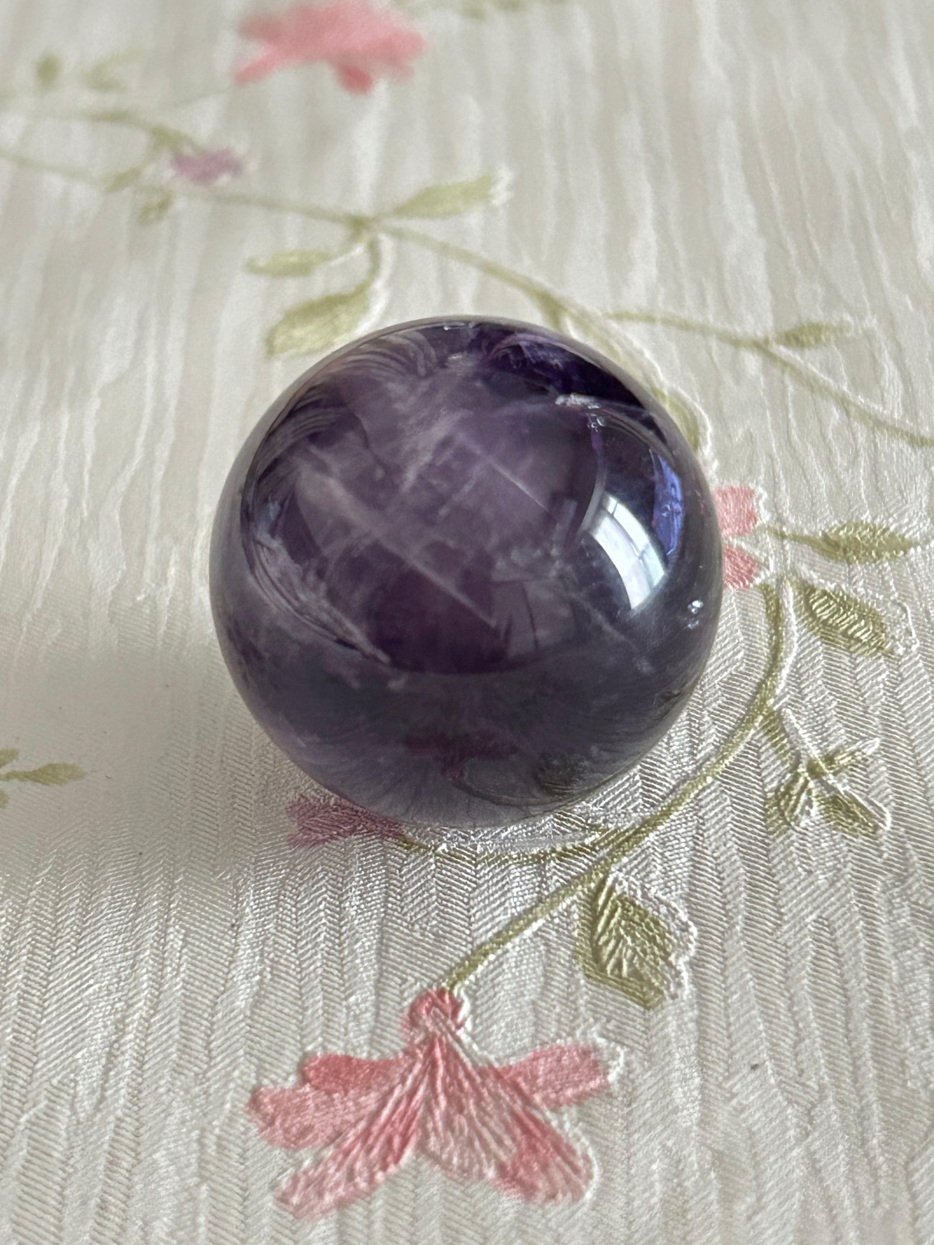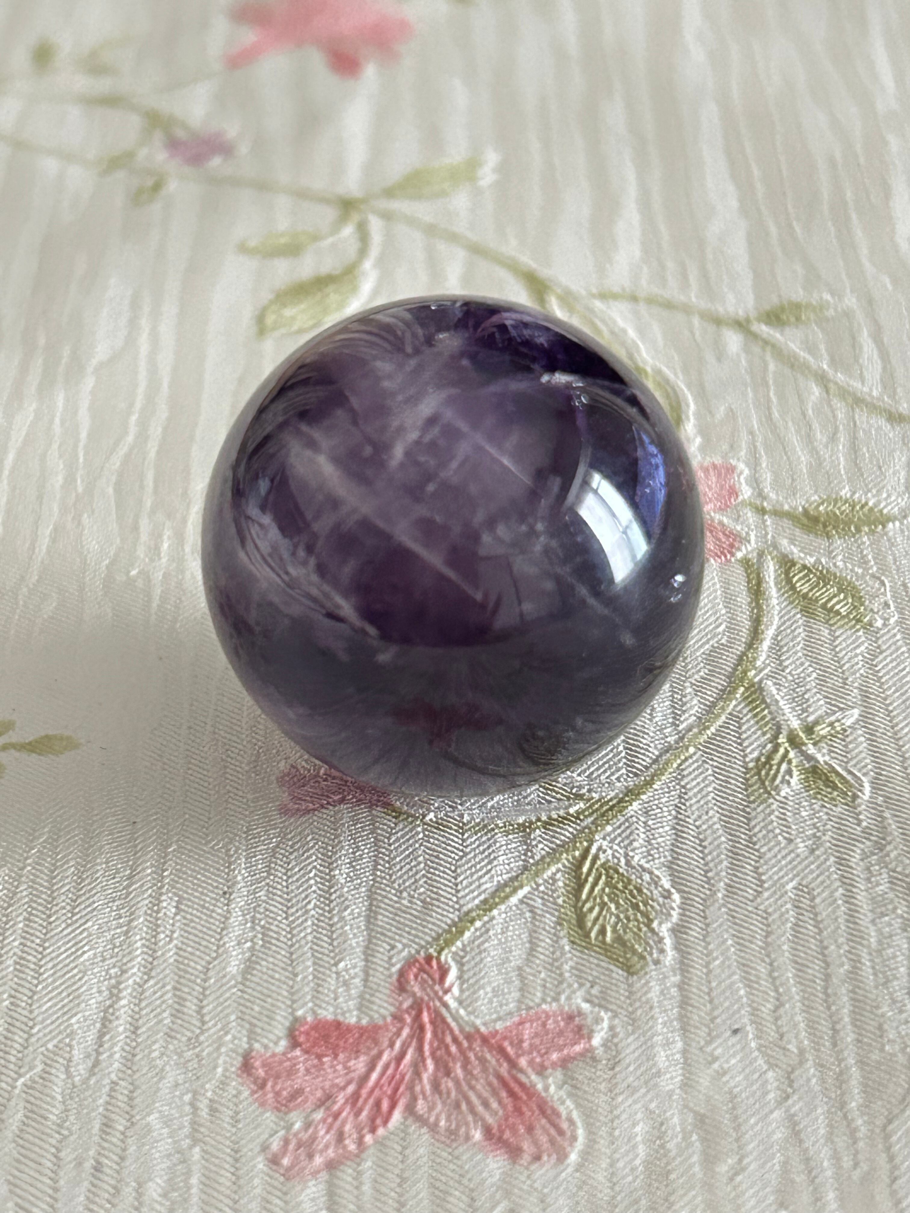 紫の色が濃く、美しい(多少のクラックなどはあるものの)アメジストの丸玉です。中々、色が濃いアメジストの丸玉ってみつからないんですよねえ(^_^)すごく久しぶりに発見したので沢山仕入れました~。手に持っている写真と普通に置いてある写真では随分色が違うようですが、どちらも本当にそういう感じの色合いです。自然光にあてると綺麗な紫になります。アメジストは非常に強い力と保護作用のある石で 高い霊的波動をもったスピリチュアルな石として古来から、宗教の行事において、司祭様の石としてよく使用されてきた石です。また日本でも「紫」というともっとも位の高い色とされていましたし、中国では皇帝しか用いることができなかった色でもあるので「紫」色という色の波動自体、慈愛、高い波動があるような気もします。紫という色は 「赤と青」という反対色の色から出来ていながらも 融合し、誰をも癒す美しい色を作り上げていることからも人生の不安、精神的なゆらぎ、いらいらを沈めて 沈静化させてくれます。霊的な力は非常に強い石でありながら穏やかな石でもあるので 心を落ち着かせて瞑想に用いることに適しています。不眠にも効果があり(昔の神話から 酒に酔わない石、二日酔いしない、禁酒を促すという意味もありますが)枕元において眠ると インスピレーションを与えてくれます。神聖な石でありながら お求めやすいパワーストーンの一つです。