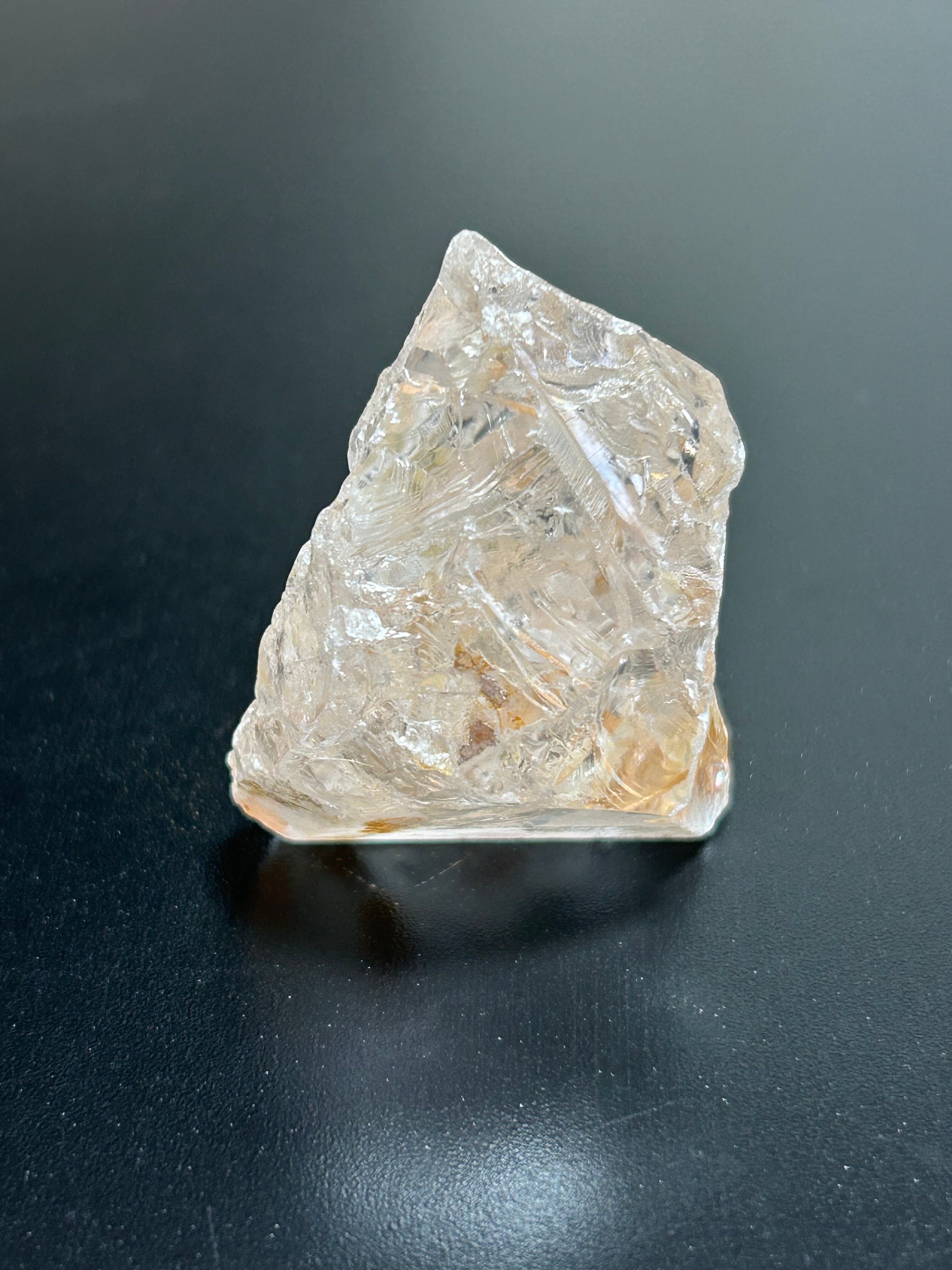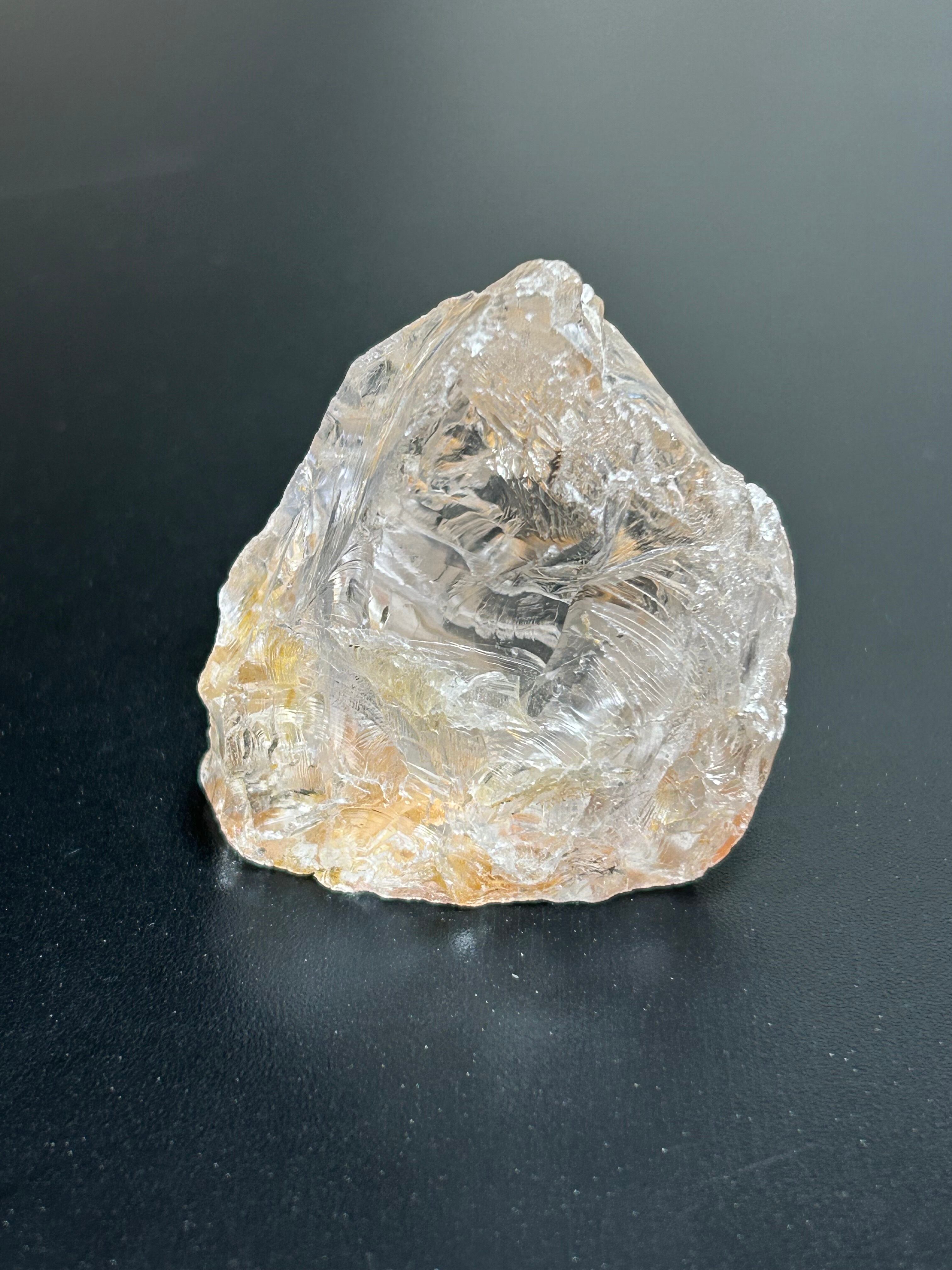 氷のように美しい水晶に一面だけ酸化鉄が付着していて良い色合いを出しています。