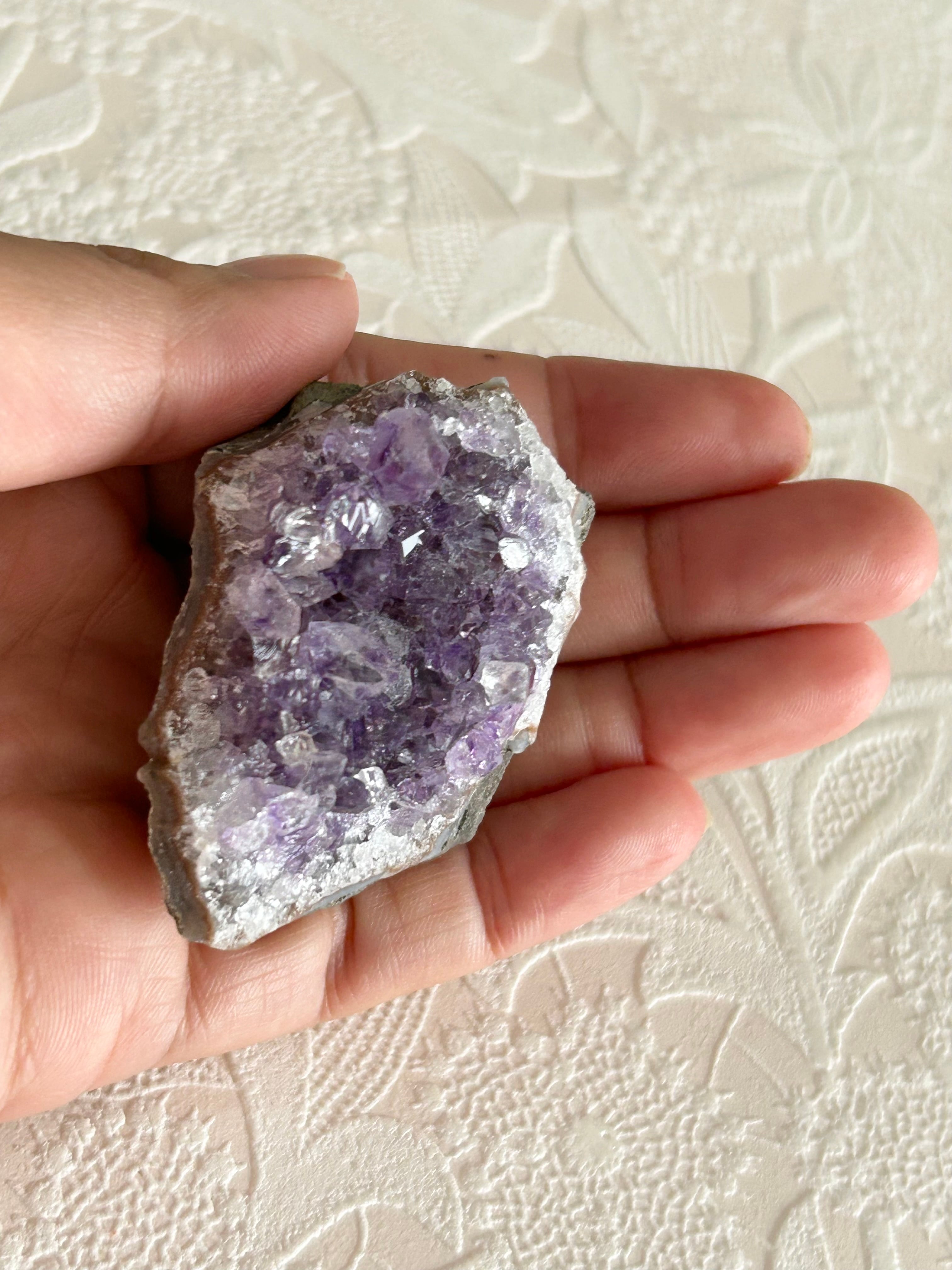 小さめのアメジストクラスターで結晶も小さめなのですが結晶の一個一個に透明度があり全体的にキラキラするので満足感がある可愛いクラスターです。