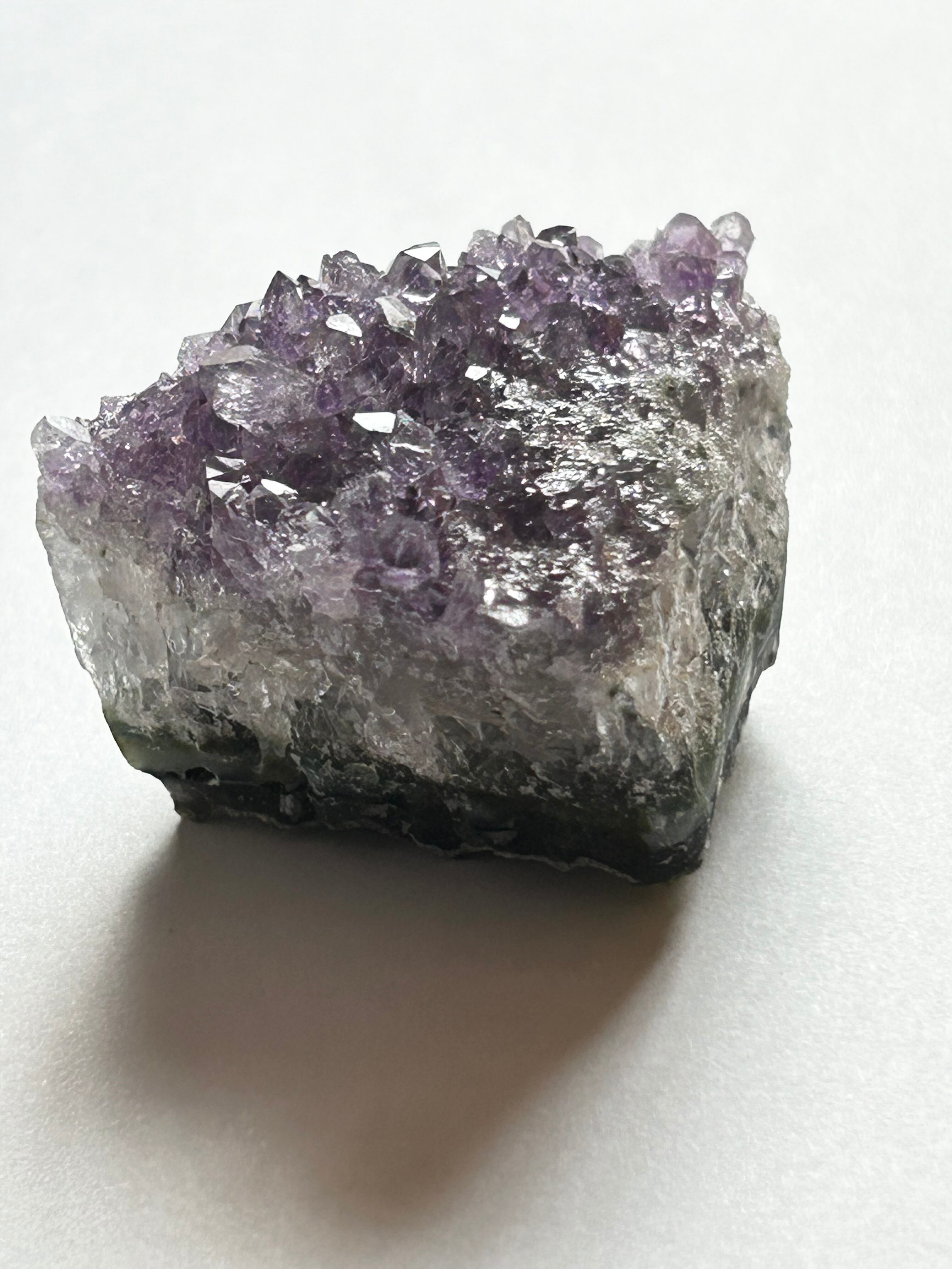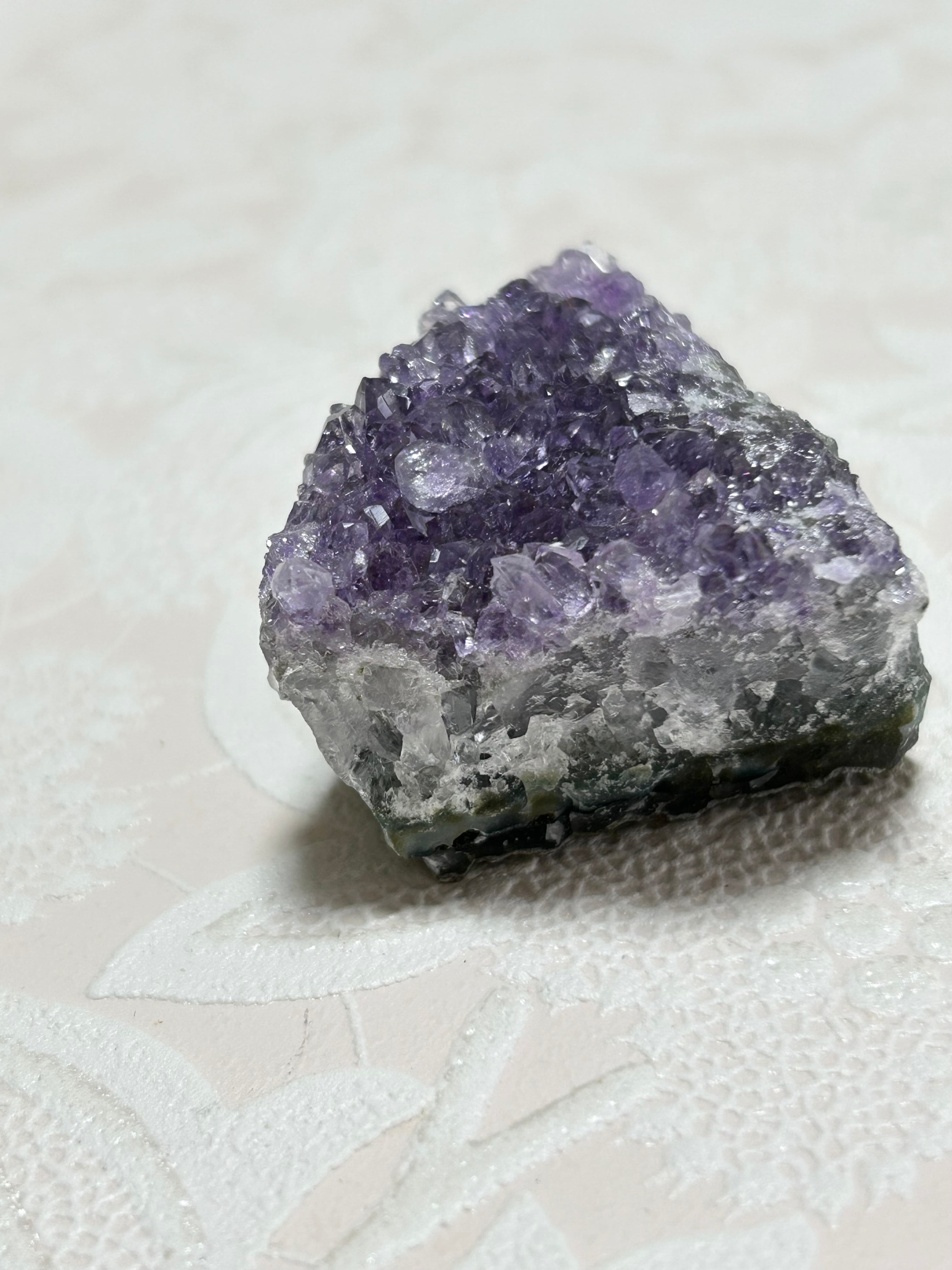 小さめのアメジストクラスターで結晶も小さめなのですが結晶の一個一個に透明度があり全体的にキラキラするので満足感がある可愛いクラスターです。