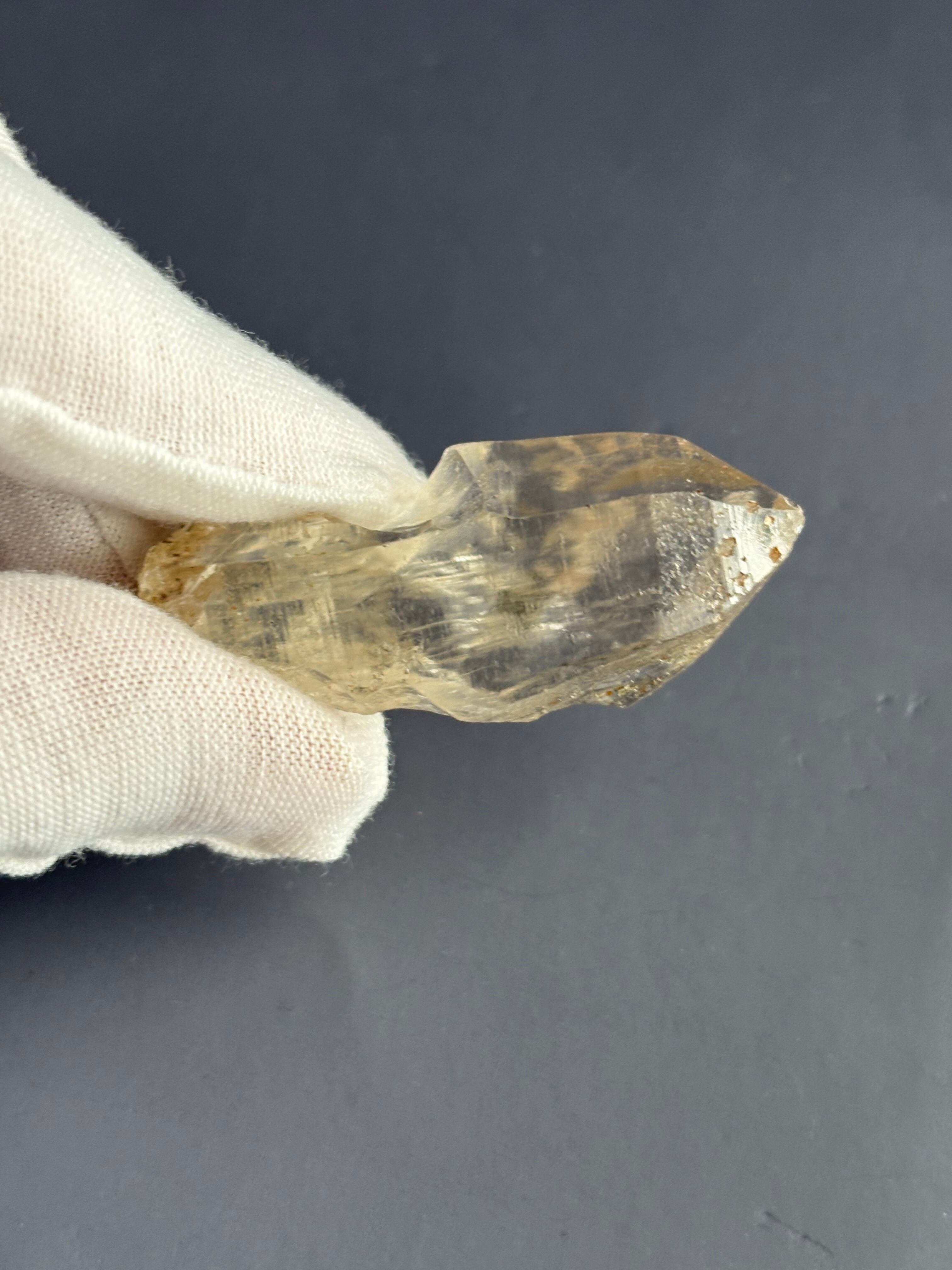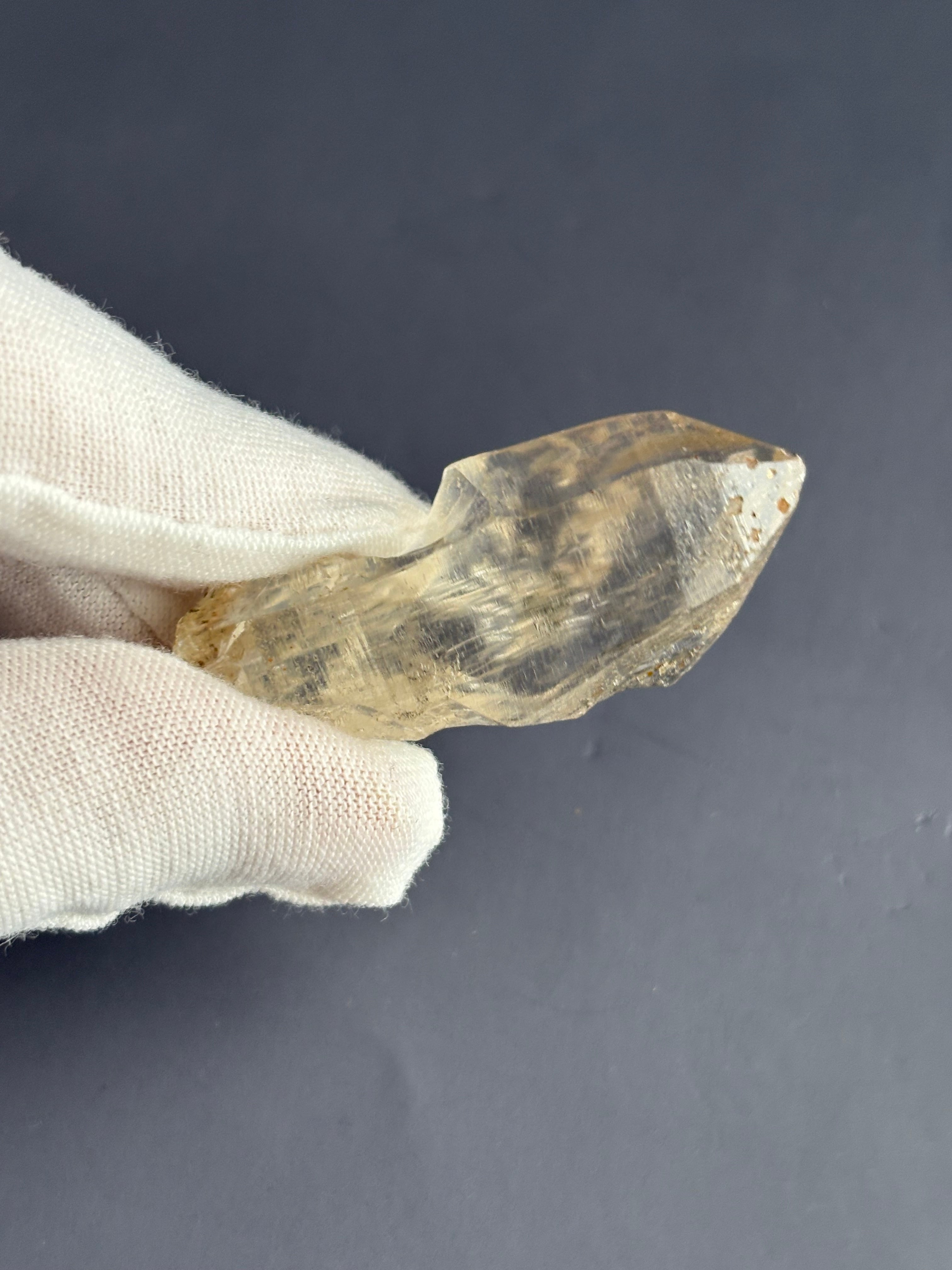 色は若干スモーキーゴールドで ミルキーっぽく見えるところも神秘的ですし、クラックがある部分は透明度がありゼリーのようで面白いですし小さな虹もちらりと見えて見所が沢山あるラパ産水晶です。